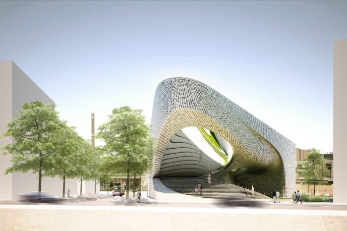 The proposal for the “House Of The Future / Haus der Zukunft” in Berlin responds to Berlin’s strict urban context: the concept of the “urban block” is touched upon and developed further. The building is partially lifted off the ground, and takes up the general building height of common Berlin housing. The ground floor level is characterized by large open spaces allowing for direct and dynamic circulation. The ground floor area of the building acts as an buffer zone between the neighboring hospital, the harbor and the river Spree. The landscaping and shaped pathways offer a manifold experience of the green zone, which is an integral part of the building’s appearance. The outdoor areas invite people to stay – a small open-air stage offers additional possibilities for spatial programming.