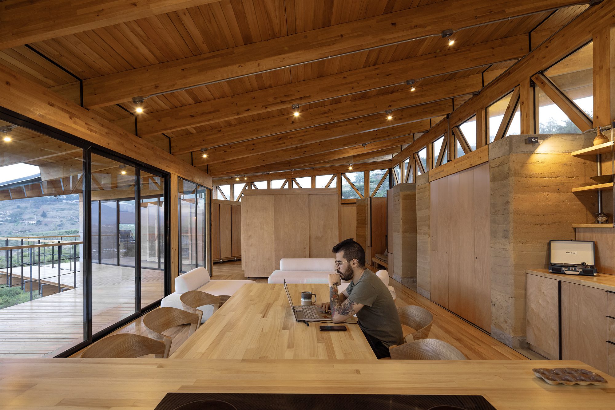 Under a large sloped roof supported by the rammed earth wall and a laminated wood structure, a continuous and flexible space is generated. This roof not only provides protection but also allows for multiple forms of use. The house has no fixed partitions; everything is organized around a service wall and a series of movable elements that transform the space as needed.