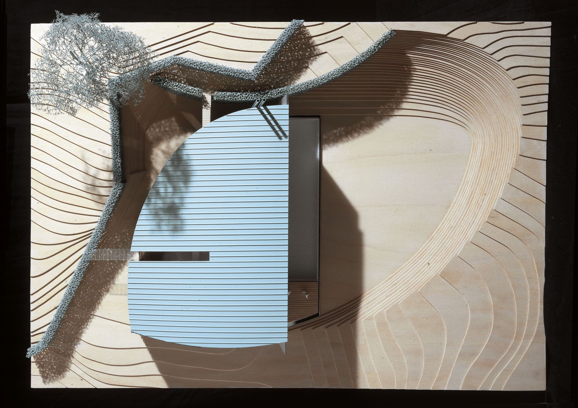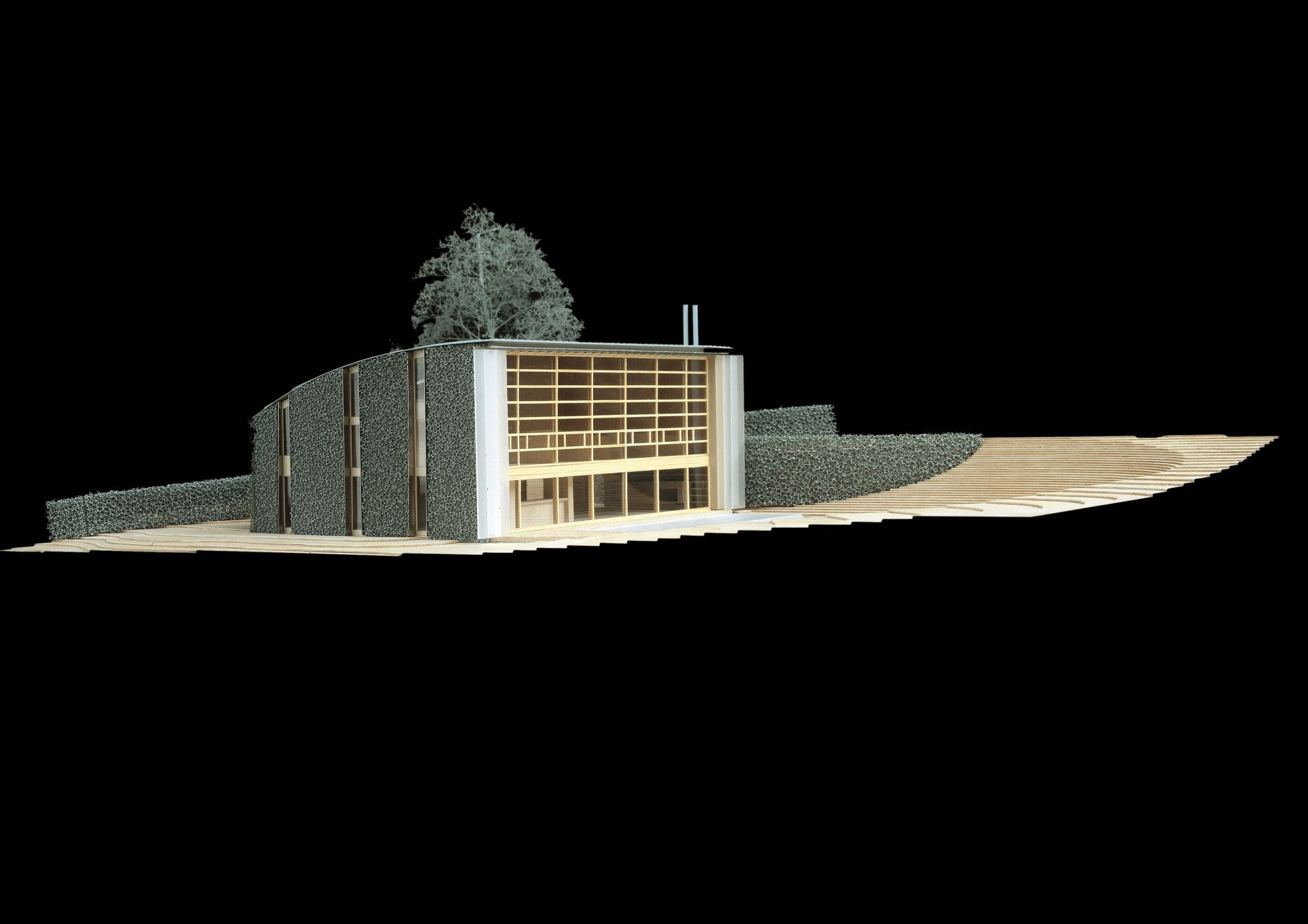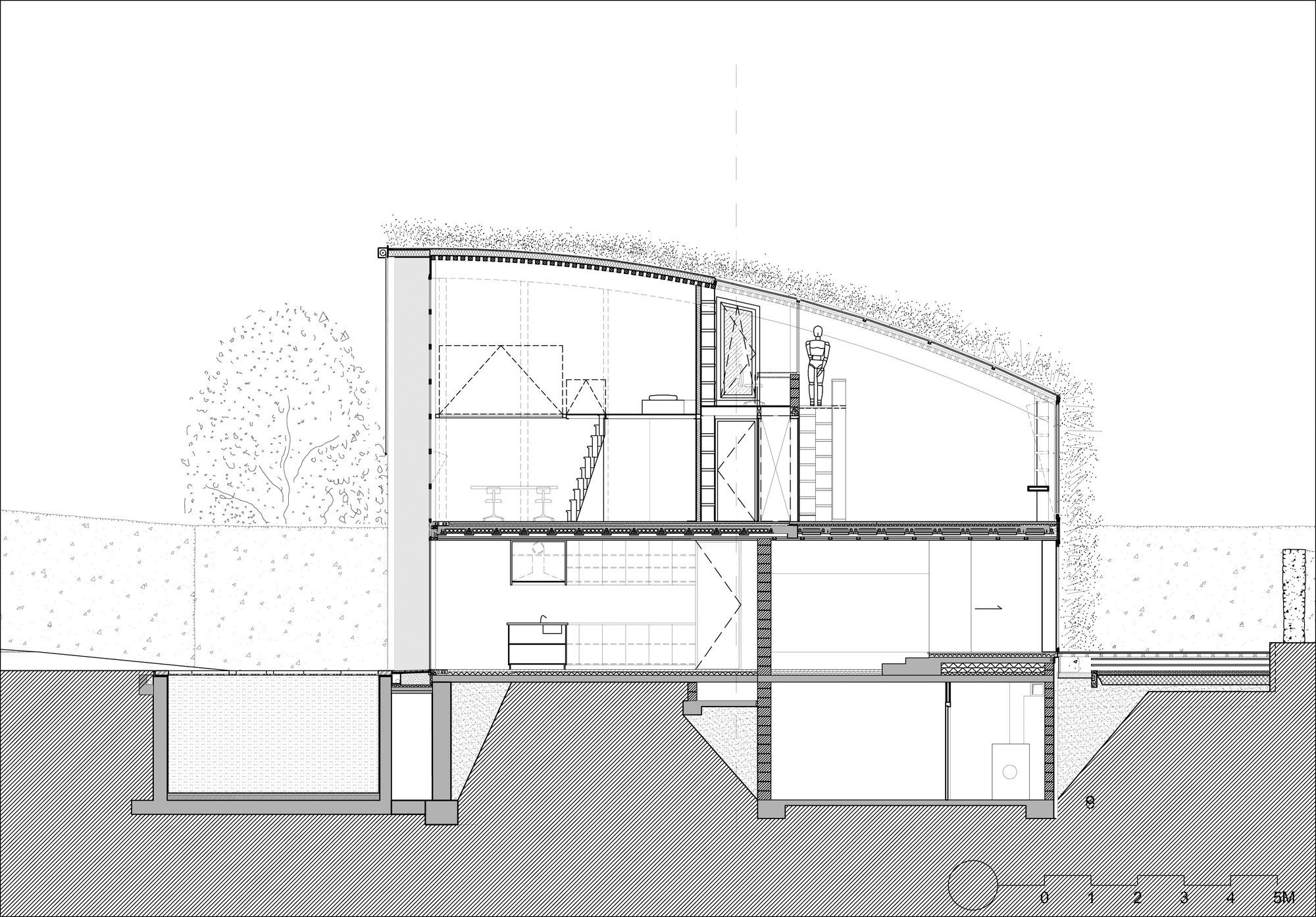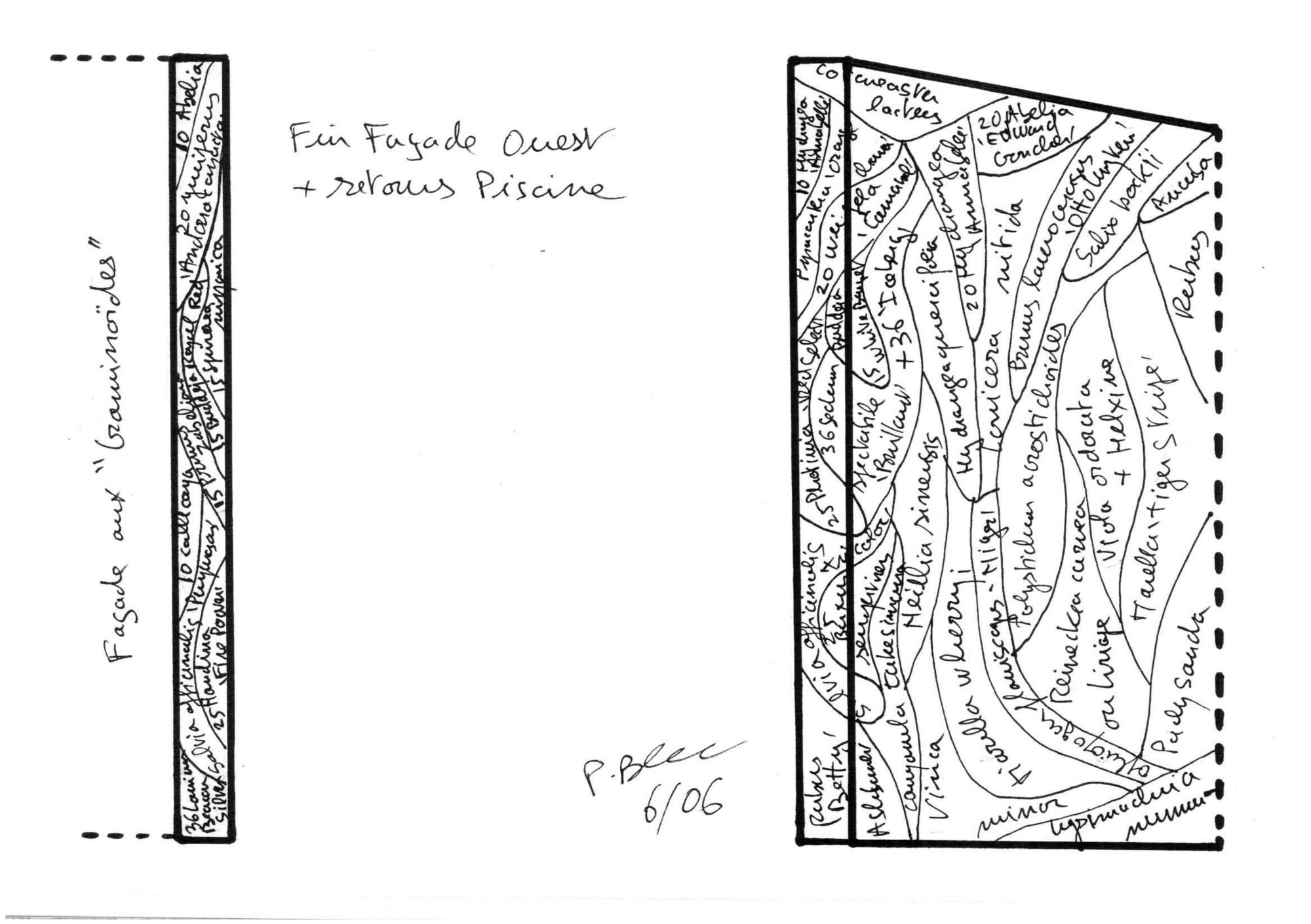 The house presents curved and vegetalised facades that are very private and closed to the neighbours to the north, the east and the south. In contrast, the west facade is entirely glass-walled as if it were one huge partitioned window. It is planned that Immense translucid white polyester curtains in widths of 1.6 m suspended from the top of the structure to the ground floor would run along this great « window » to ensure shade in the summer months.
