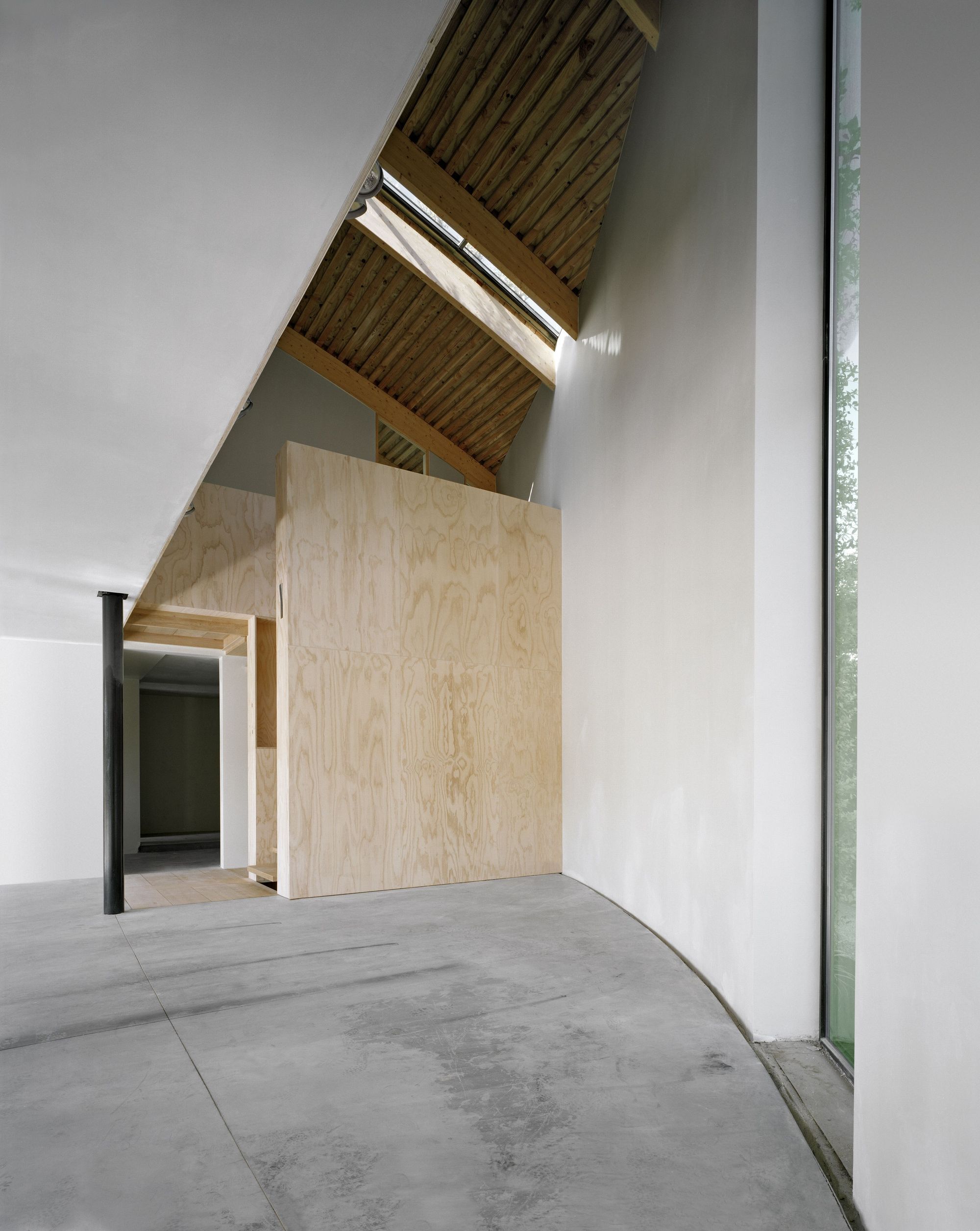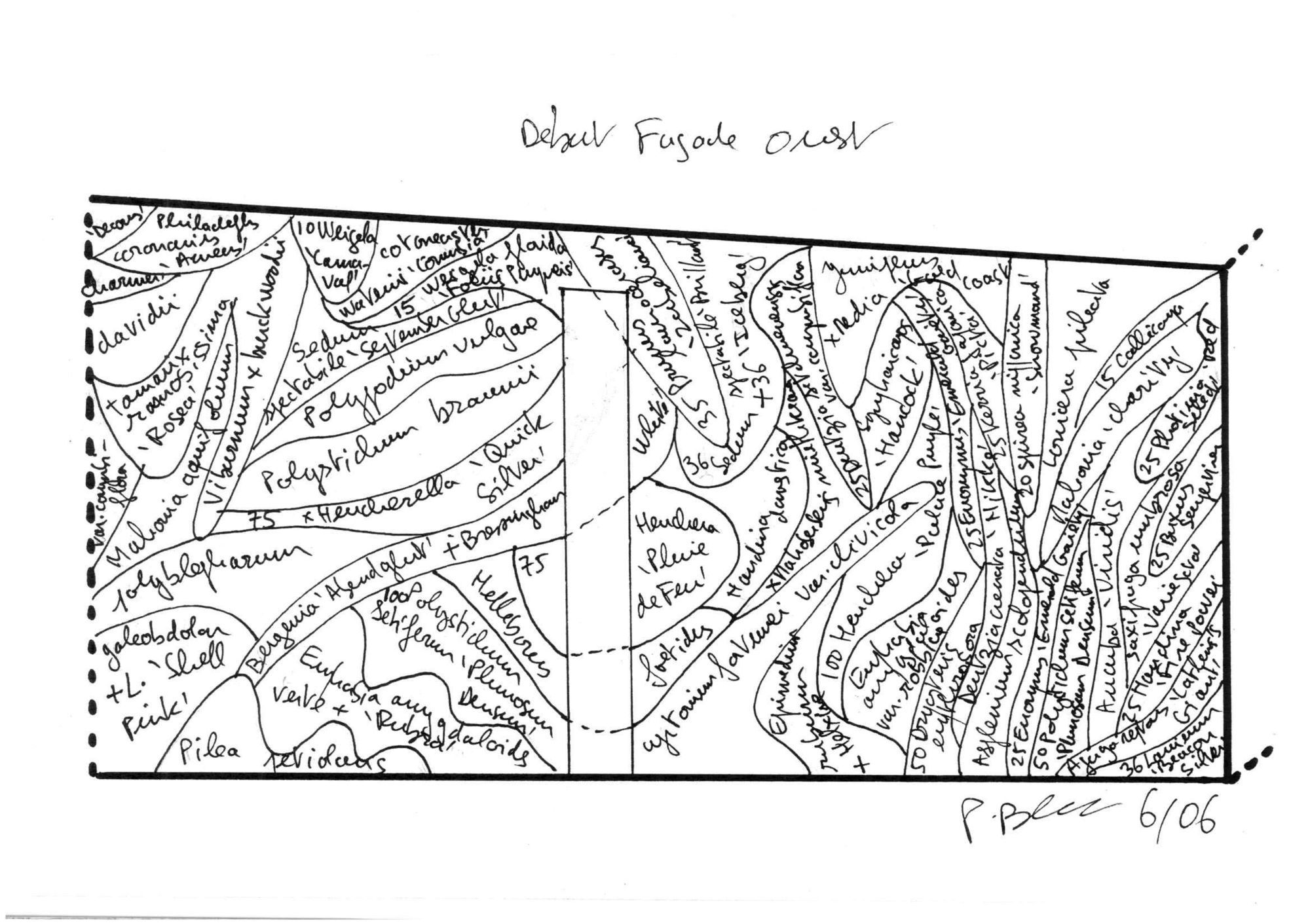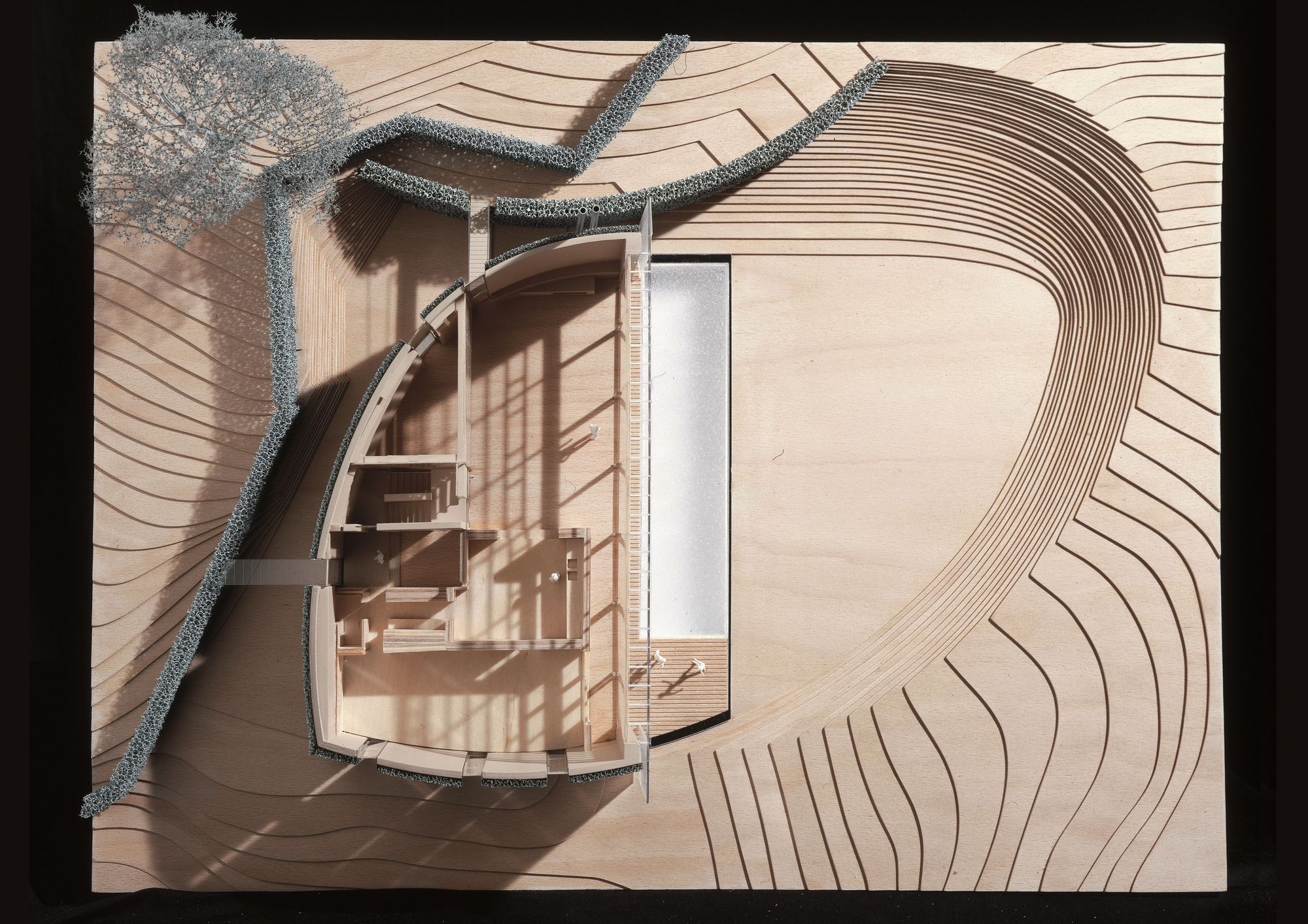 The house presents curved and vegetalised facades that are very private and closed to the neighbours to the north, the east and the south. In contrast, the west facade is entirely glass-walled as if it were one huge partitioned window. It is planned that Immense translucid white polyester curtains in widths of 1.6 m suspended from the top of the structure to the ground floor would run along this great « window » to ensure shade in the summer months.
