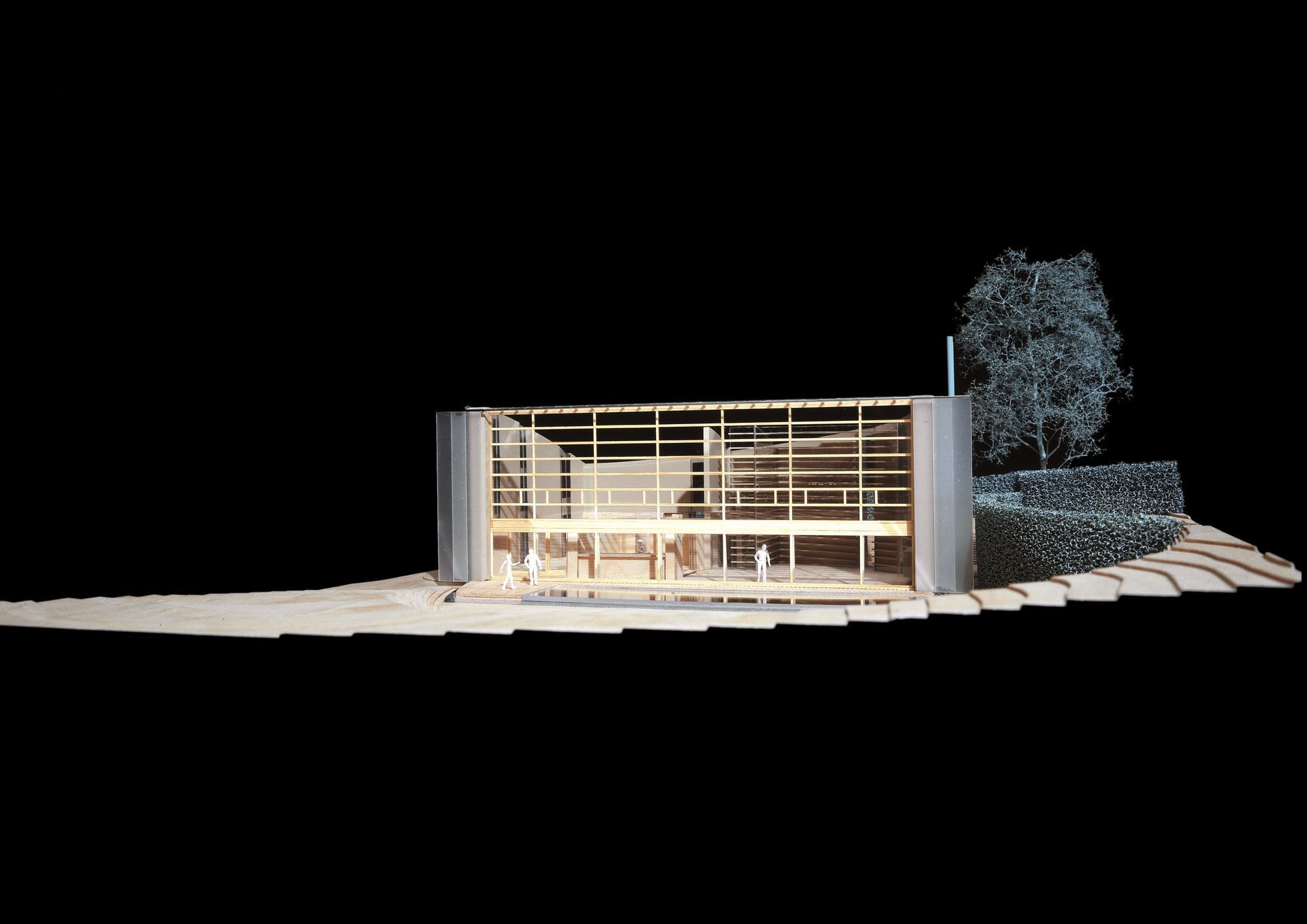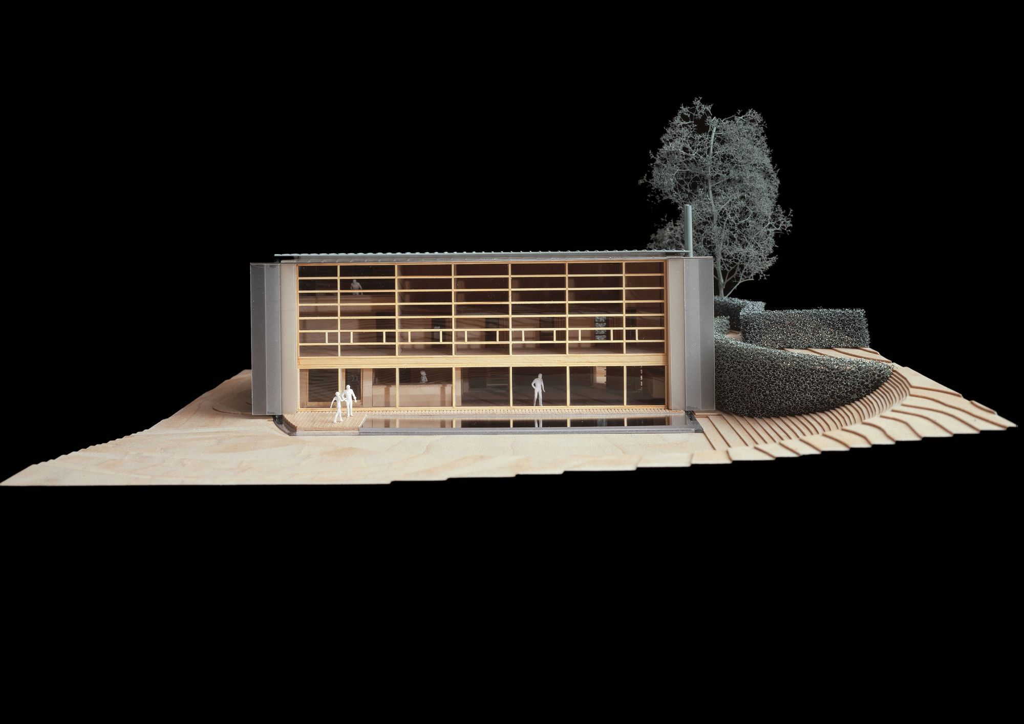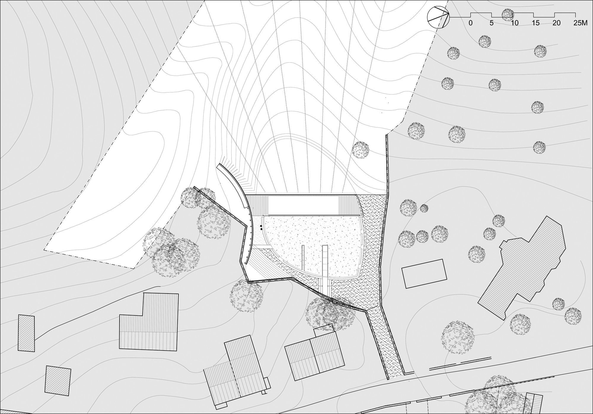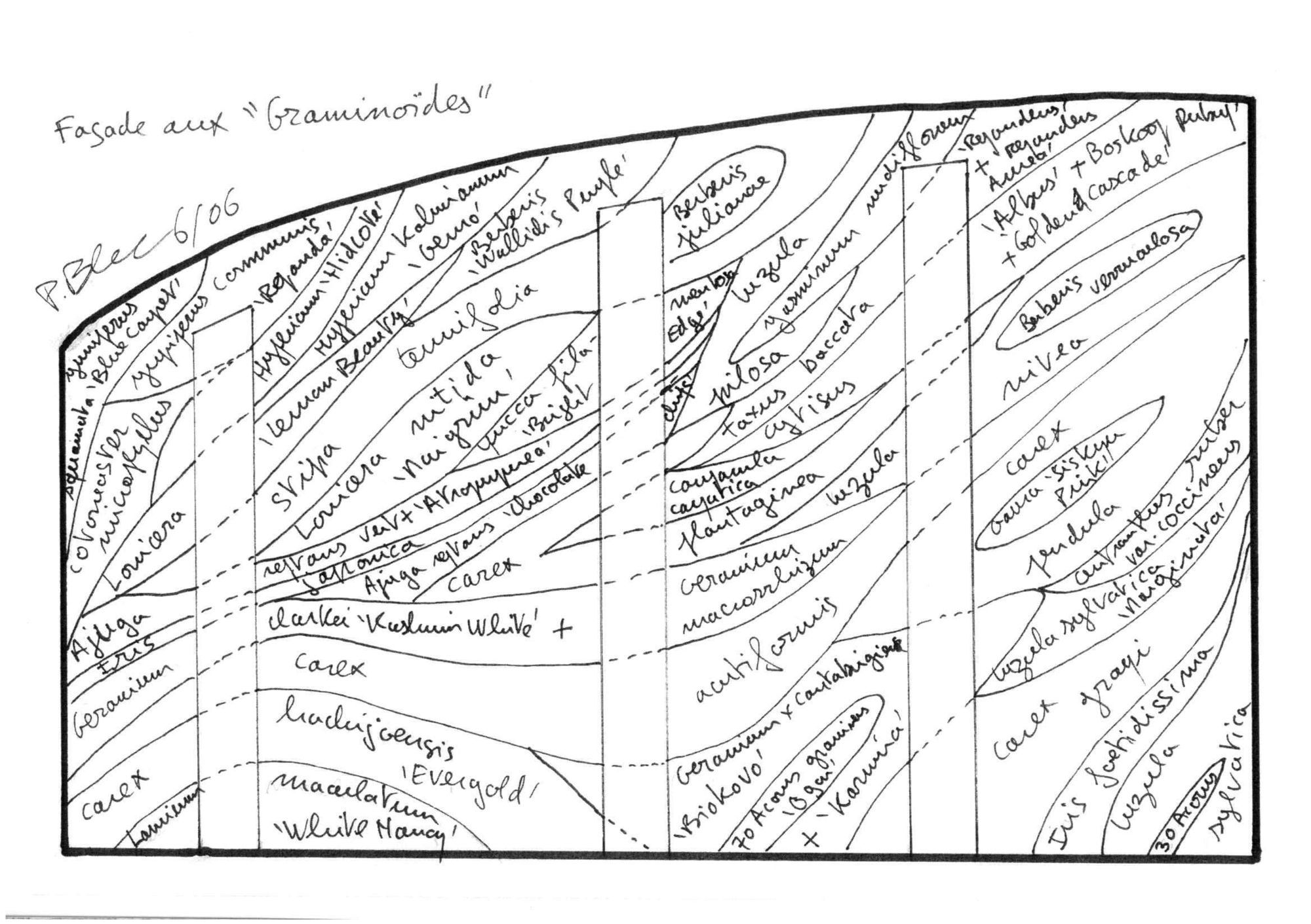 The house presents curved and vegetalised facades that are very private and closed to the neighbours to the north, the east and the south. In contrast, the west facade is entirely glass-walled as if it were one huge partitioned window. It is planned that Immense translucid white polyester curtains in widths of 1.6 m suspended from the top of the structure to the ground floor would run along this great « window » to ensure shade in the summer months.