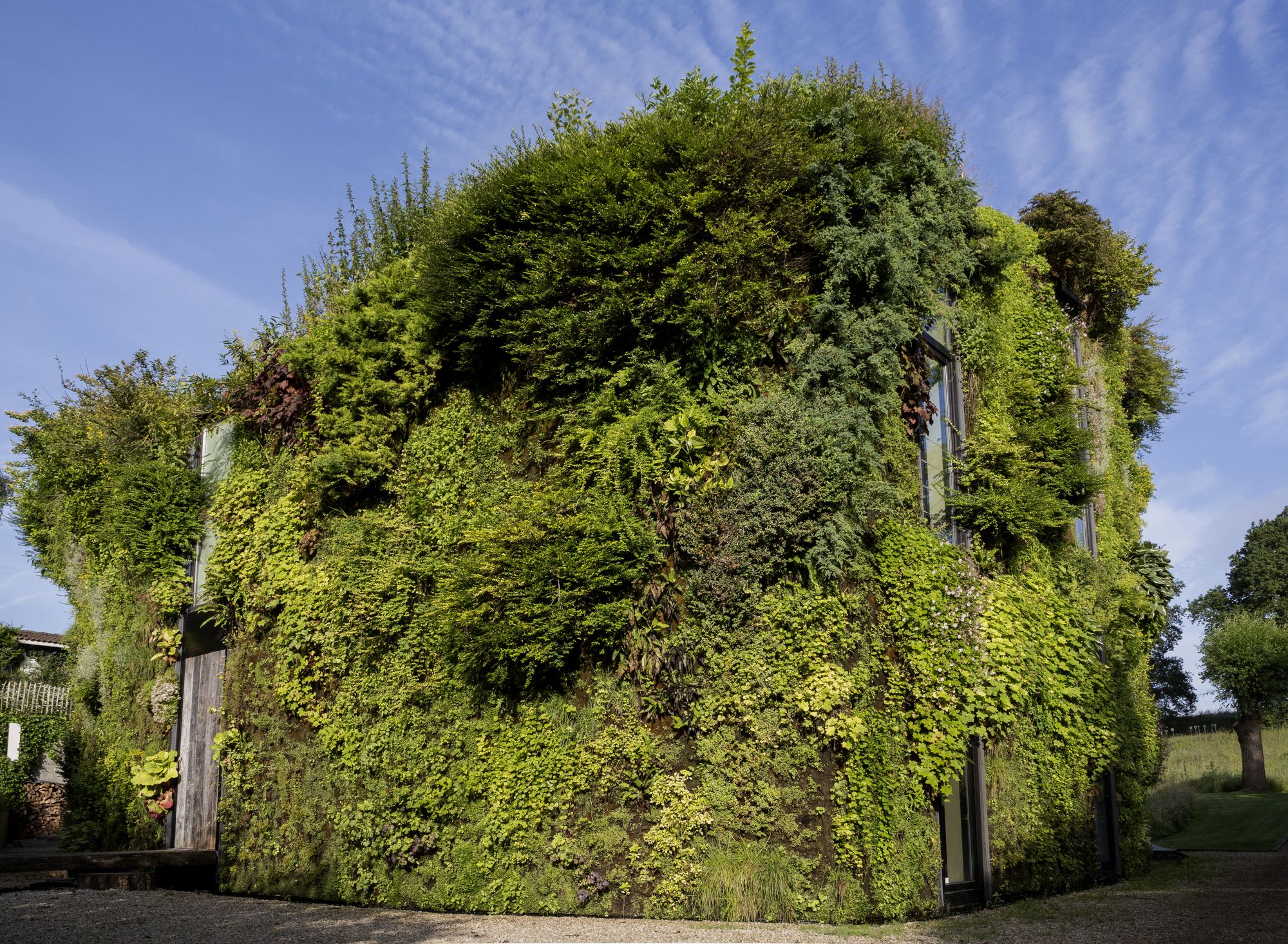 Initially conceived as a wall of ivy with a patinated cop- per roof, the vegetalised facade is finally composed of a selection of exotic plants chosen by the botanical artist Patrick Blanc, and extends to cover the roof. We had to design the structure, the insulation, and the water-tightness of the envelope and resolve the building physics issues in order to receive the necessary support systems, irrigation and fertilisation systems for the plants that are set into a felt support stapled to rigid PVC panels.