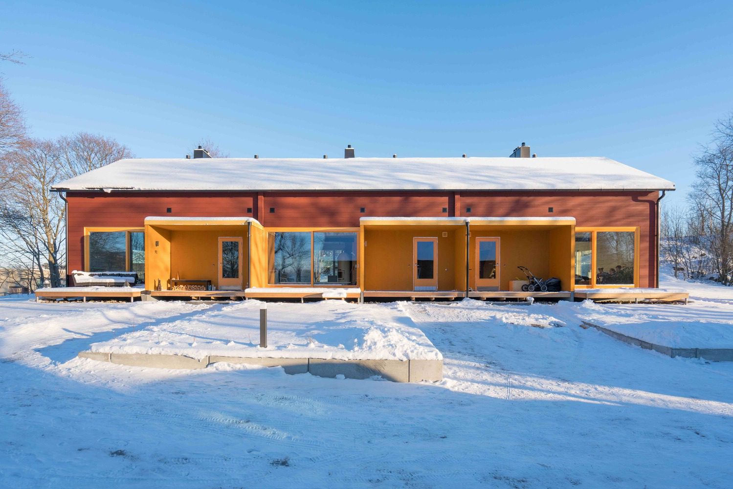Both gable roof timber houses are painted with red ochre. House Spaak has also parts painted with yellow ochre. The frame of this modern building consists of logs and CLT-elements. In addition, the technology inside of the building is made in a traditional and simple way; both houses have nowadays in Finland very rare natural ventilation. Every apartment is built around a heat-saving brick wall, which also hides inside exhaust ventilation ducts, as well as chimneys of the fireplaces. Basic heating for both houses is provided by properties own ground heating system.