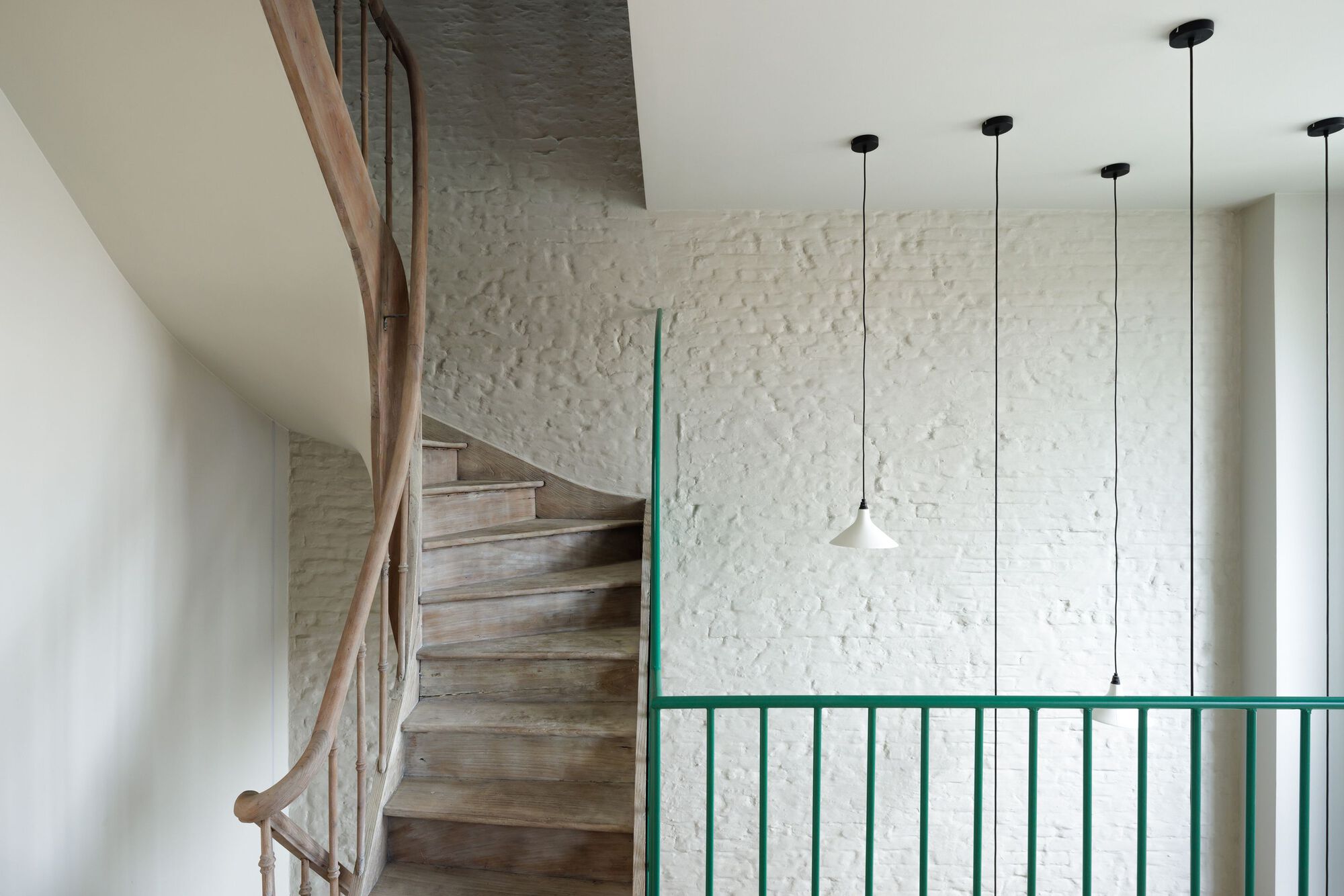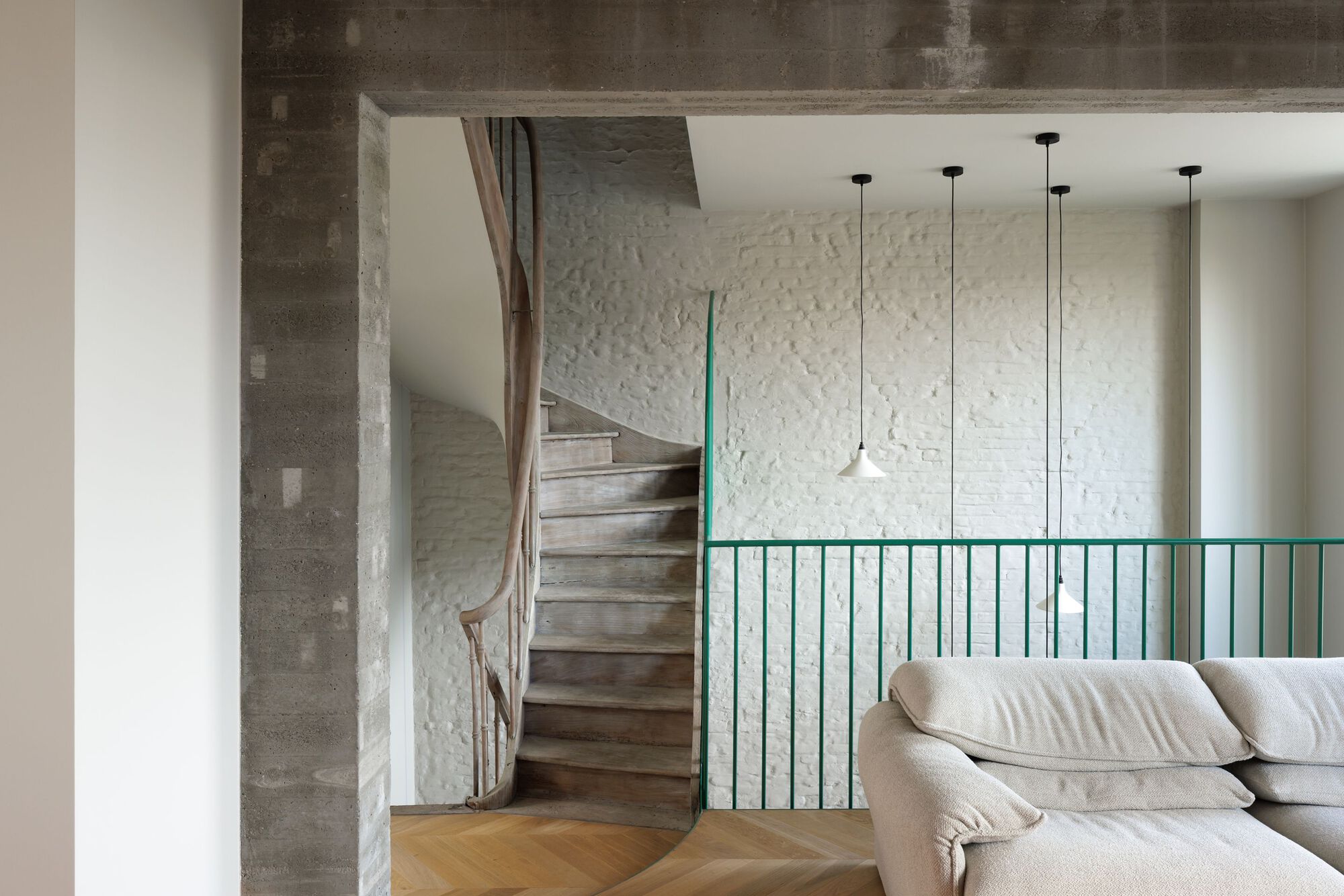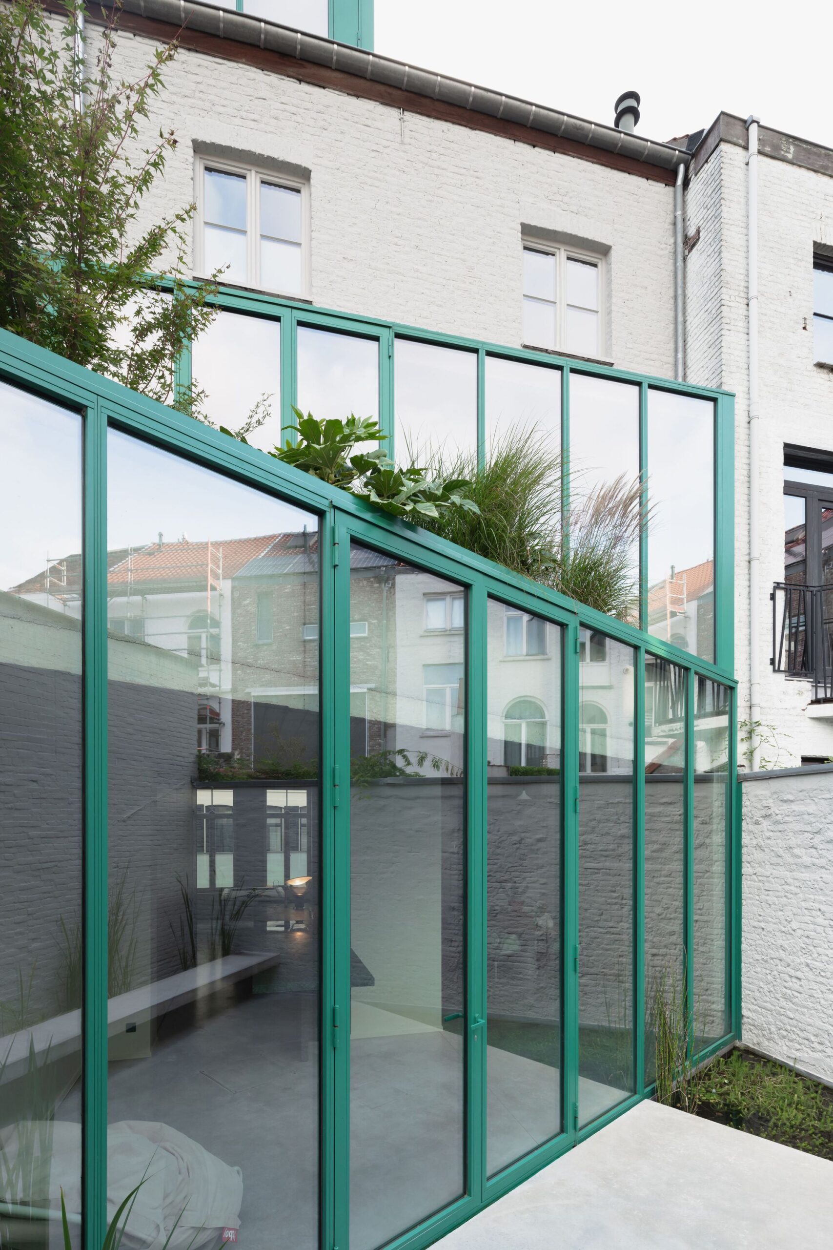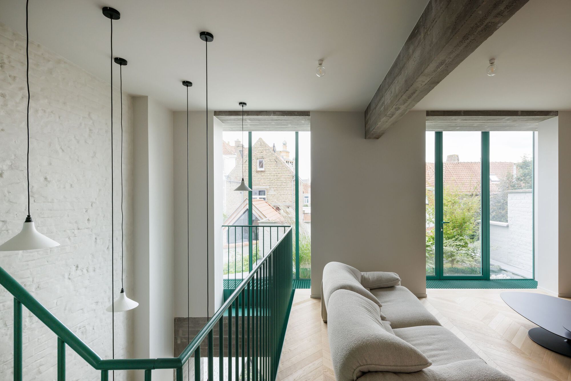 House WBVD , The street façade of this 1870s townhouse reveals nothing of the architectural interventions that were used to transform it into a contemporary home. Once the room-high door of the entrance hall is opened, you are surprised by the openness and architectural interventions. The original main volume was retained and extended with two diagonally stacked glass volumes. In the process, each intervention was accentuated in concrete or green colours. The kitchen with the void and the light-flooded central stairwell are the eye-catchers of this design, in addition to the bathroom with a view of the historic city centre of Bruges.