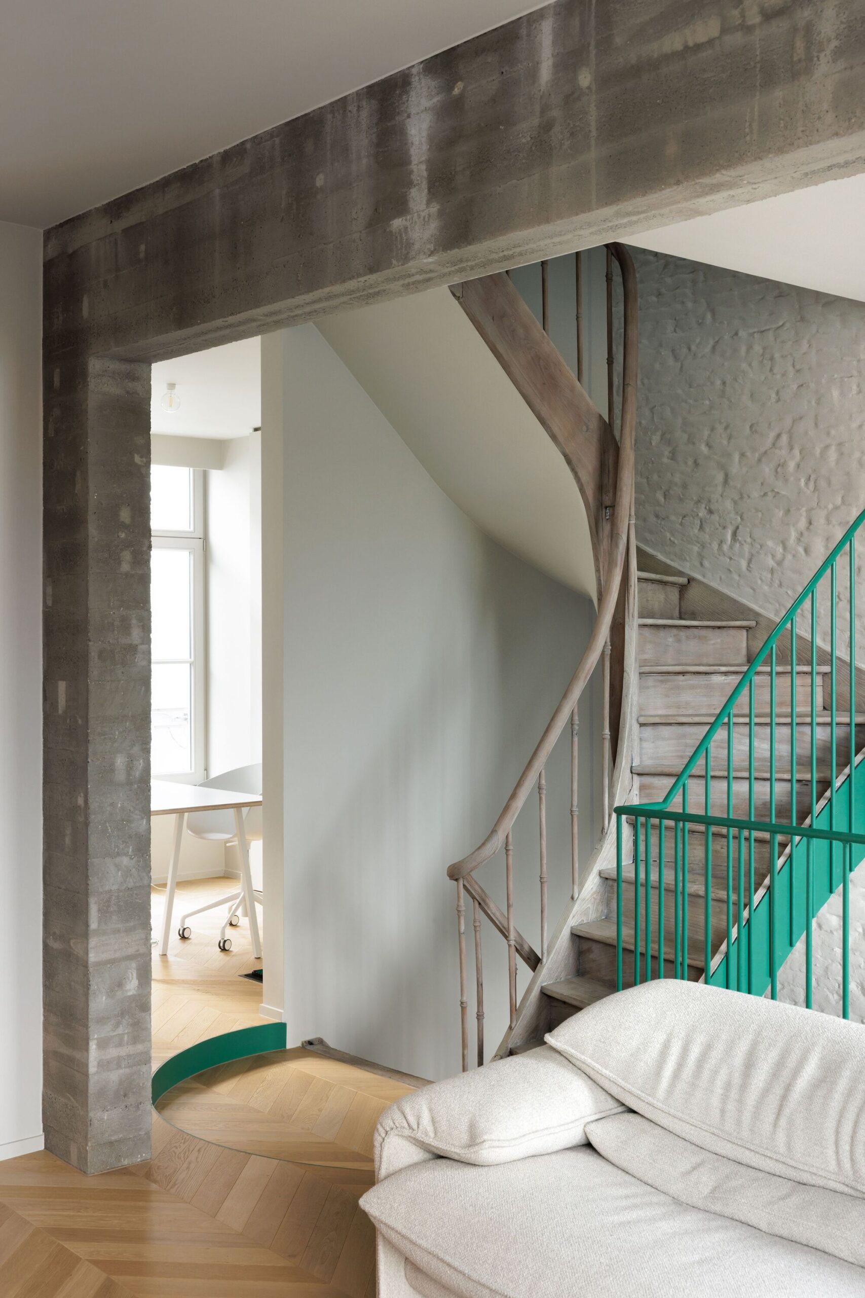 The triangular extension and other structural interventions were deliberately executed visibly in a concrete structure made on site. The executed beams in the main volume also refer to the original room division typical of a town house from 1870.