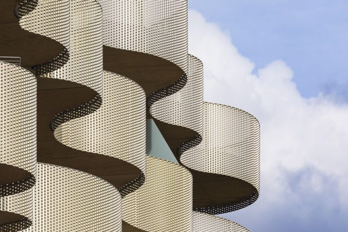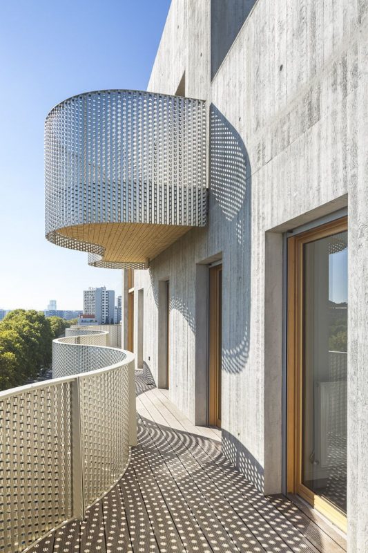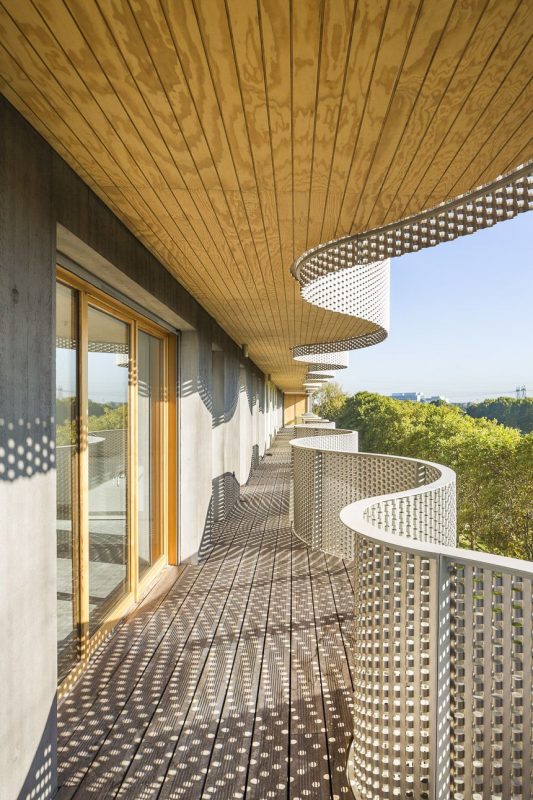 The building has 8 superstructure levels (R + 7 and mezzanine) with some duplex accessible from the 7th level, and no infrastructure level. On the ground floor, two private courtyards traverse the island, to provide visual and functional permeability between the dock and the Allée des Arts. Arranged on the streets, docks and inside the courtyards, workshops and retails are wide open to the public space. The repeating pattern of wood joinery and large windows mark the unity of the ground floor.