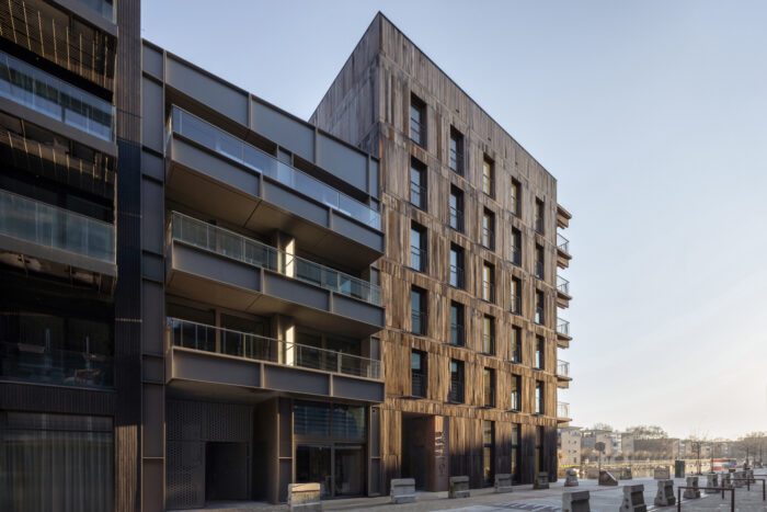 Houtrak Apartments, designed by Marcel Lok_Architect & Workshop Architects, is located at the end of the Oostenburgervaart on the island of Oostenburg in Amsterdam. In recent years, the former industrial estate, with the monumental Van Gendt Hallen and INIT-building, has been transformed into a dynamic urban district with a mix of residential and commercial buildings, horeca, and a hotel. The Houtrak complex consists of two buildings – one 6-layer block with recycled Azobé wooden facades and solid wooden balconies oriented towards the water, and a 4-layer volume with shed roofs, fitted with black-brown metal facade cladding, oriented towards Isaac Titsingkade and the Rumphiusstraat.