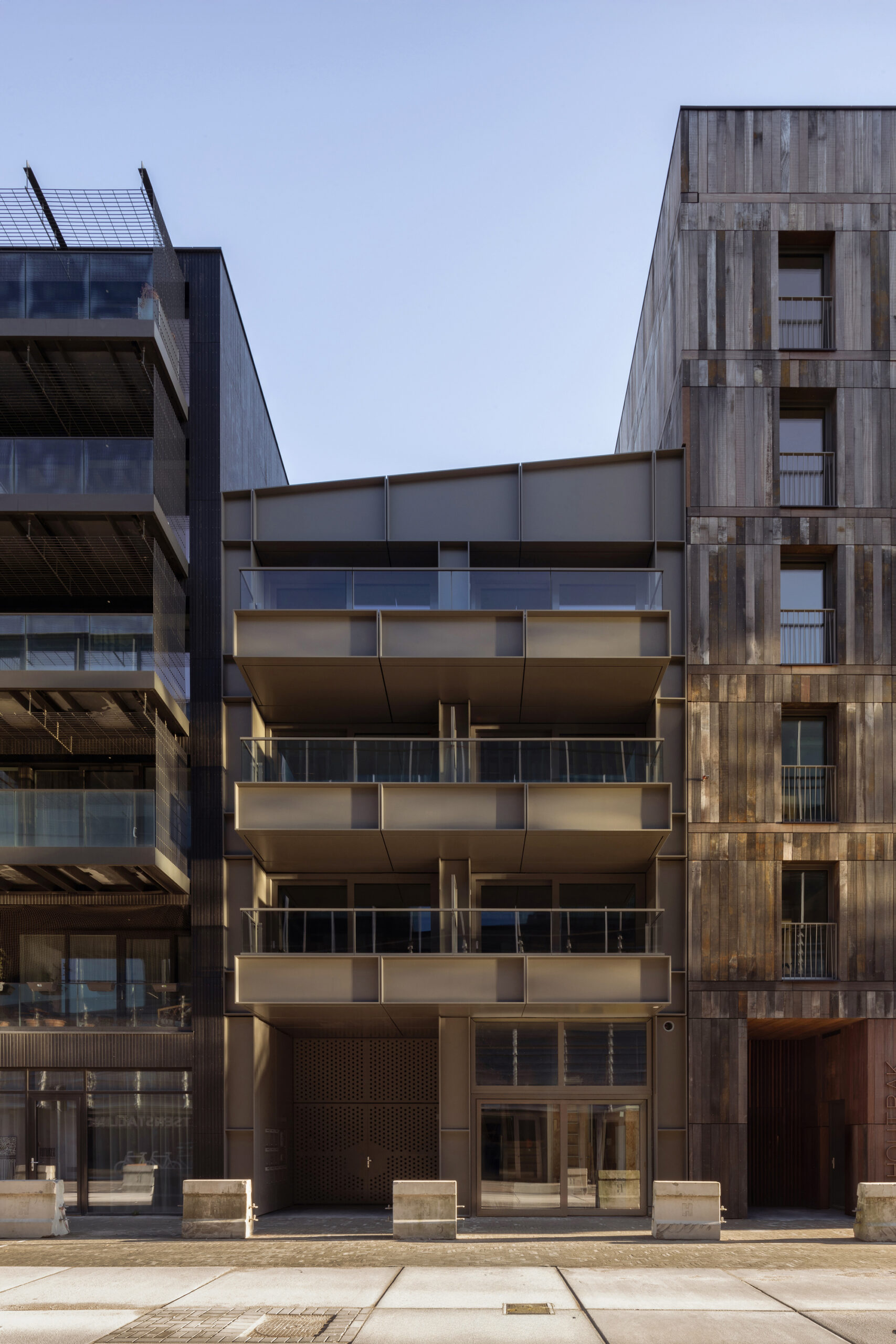 Houtrak is ambitious in the field of sustainability. The apartments each have an individual heat pump with a heat source, high insulation values, and triple glazing set in wood-aluminium and wooden frames, detailed away behind the facade sections. The wooden facade parts are sawn from reused side planks from retaining walls of a canal in the south of Holland. The metal cassettes are grey-brown powder-coated, the Azobé has a weathered patina, and also requires no maintenance.