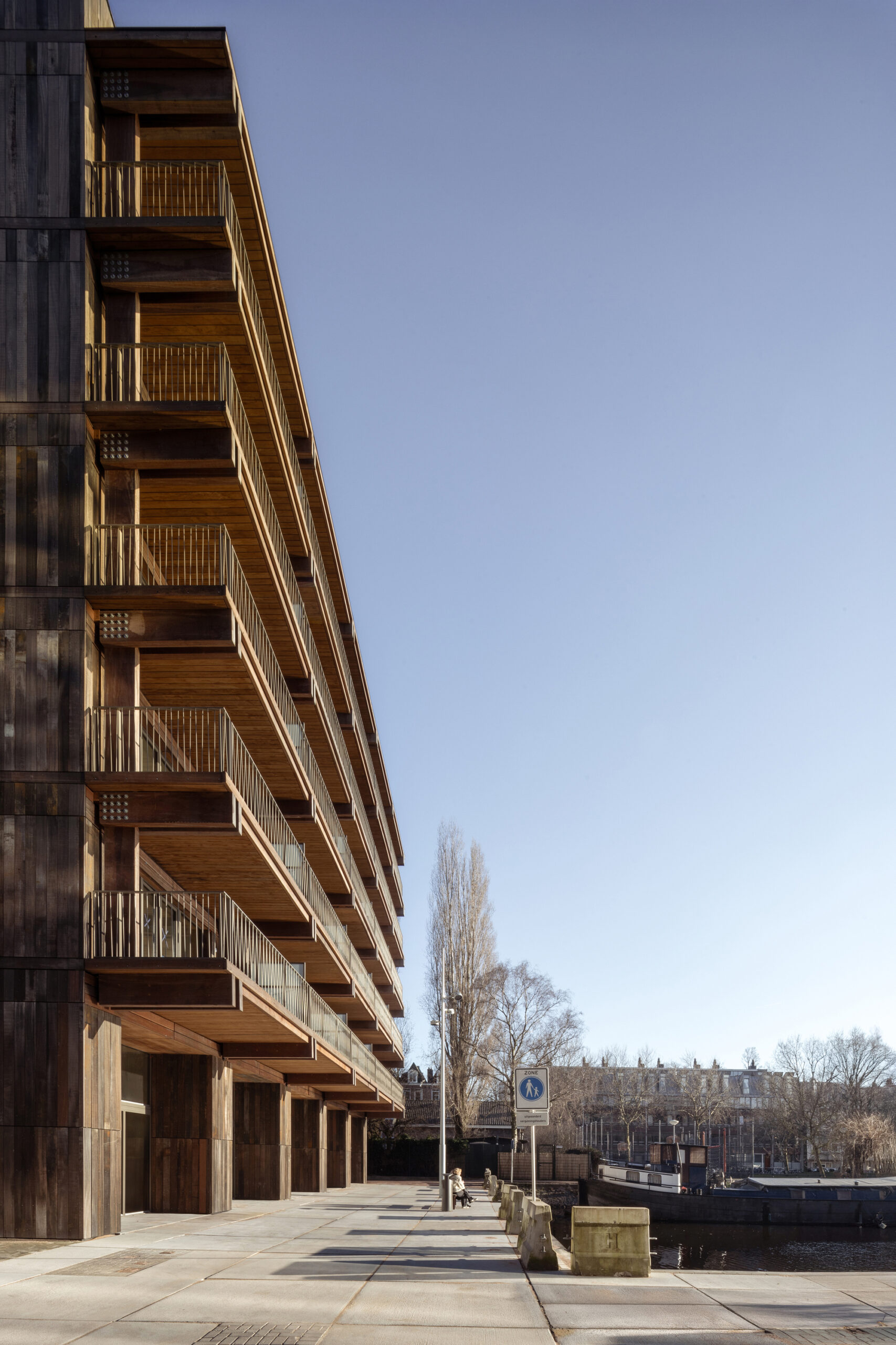Both buildings have an entrance on the Isaac Titsingkade and are connected by a compact light court to which all house front doors adjoin. The ground floor is divided into two-storey split-level houses with extra high living space. The upper floors are divided into a variety of apartments, ranging from compact studios to large lofts. The wooden building has very deep cantilevered balconies over the water, the metal building has semi-indoor balconies that are part of the facade and thus guarantee privacy to the neighbours. A collective roof garden has been designed by Flux landscape architects on top of the wooden building.