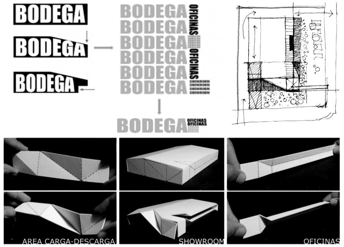 A series of foldings (mainly three operations), allowed us to generate the two fronts, that in terms of proportions and surface area, are the same of a regular industrial building, so in that way we can insert the different activities of the program and elemental situations (showroom, administrative facilities, truck access, etc)