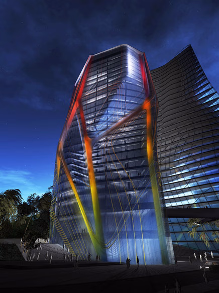 Huaxi Urban Centre Tower, a conceptual tower design by Tom Wiscombe of EMERGENT, explores the idea of merging mechanical systems with other building functions to produce hierarchies and “synergetic forms”. The form produced is characterized by a soft transluscency that is highlighted by various exterior lighting effects. These lighted tubes that appear to be running vertically throughout the entire structure not only function for as a specular effect, but also house various types of ductwork. The idea was to move away from the standard central core and allow it to merge with exterior functions located on the pleats of the building.