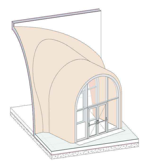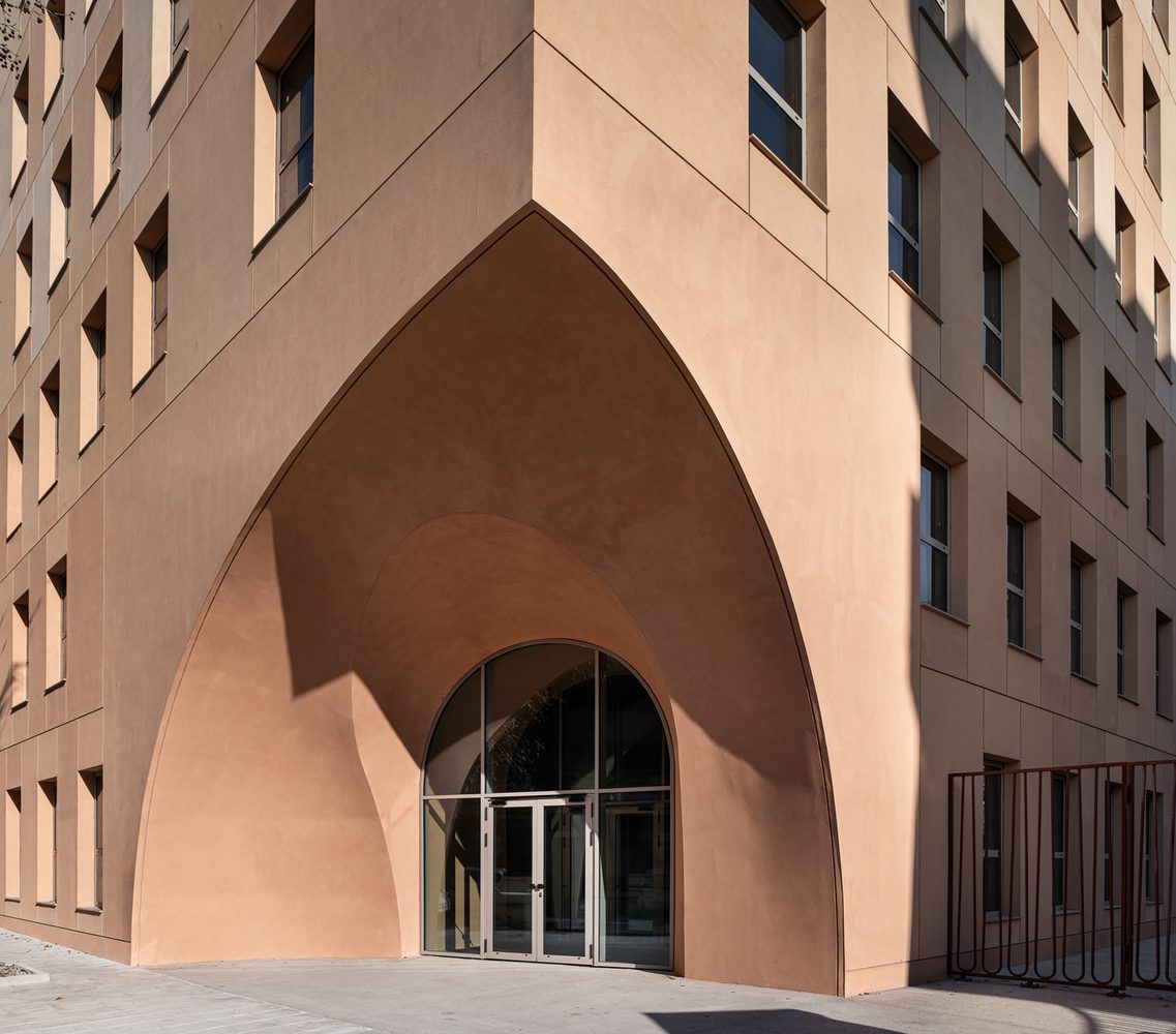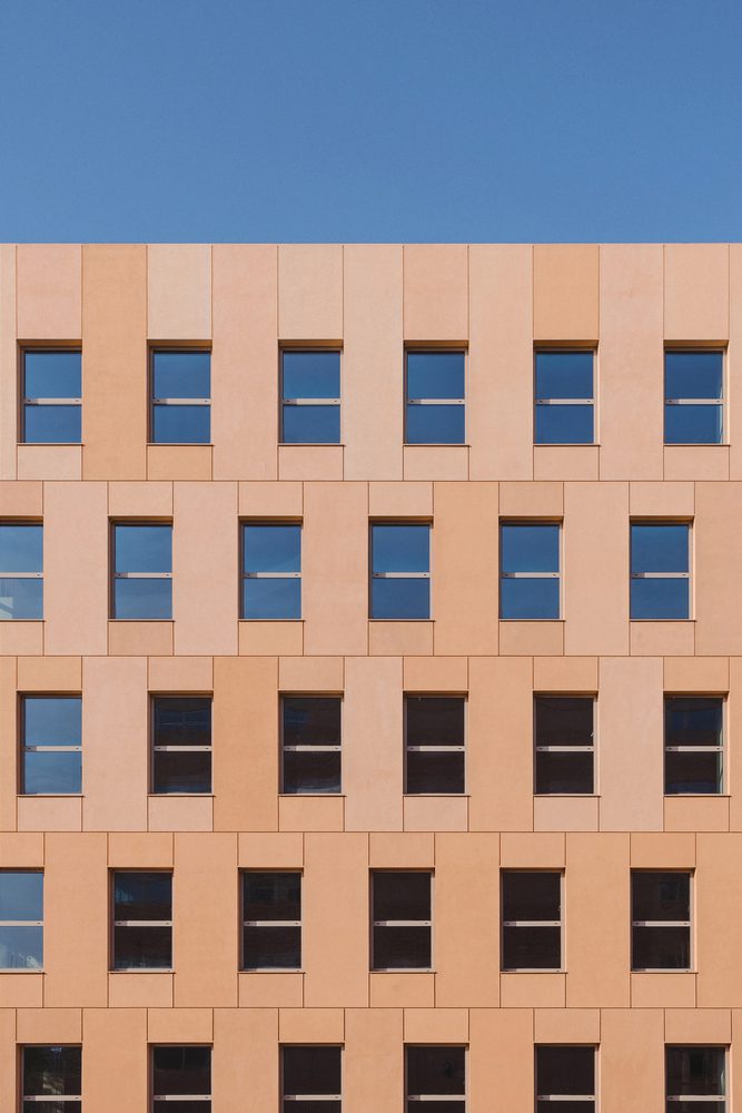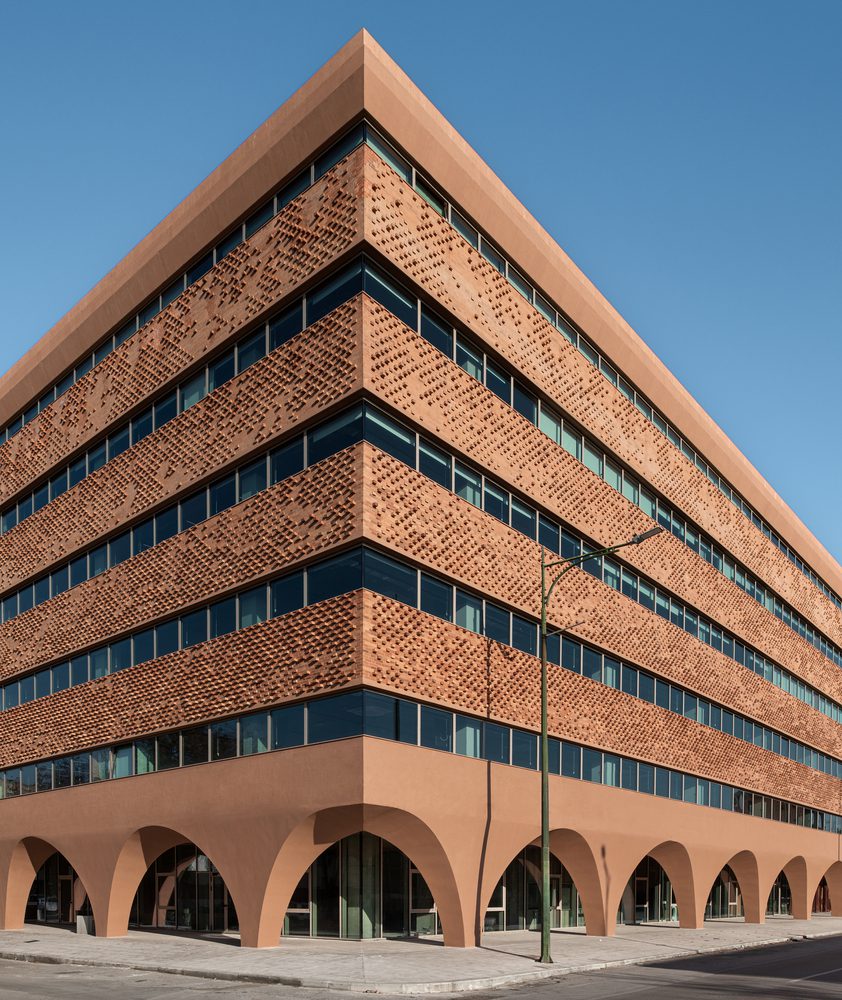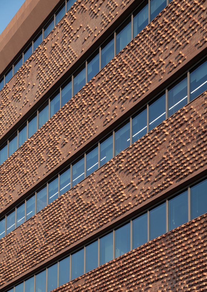 The façade features custom-designed ceramic bricks arranged in a three-dimensional pattern, using five shades of terracotta. A gradient effect, transitioning from darker hues at the base to lighter tones at the top, creates the illusion of the building dissolving into the mist. Developed using BIM technology, the project underwent extensive digital analysis to optimize façade implementation. Specialized research, in collaboration with S. Anselmo, resulted in the creation of bespoke ceramic bricks that balance aesthetic appeal with technical precision. Visits to the manufacturer’s facility in Italy enabled hands-on evaluation, ensuring long-term durability through meticulous color and texture refinements.