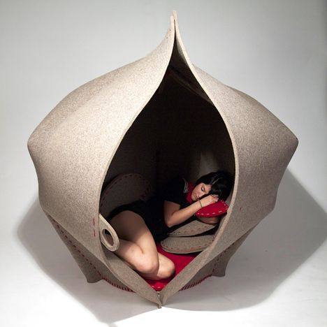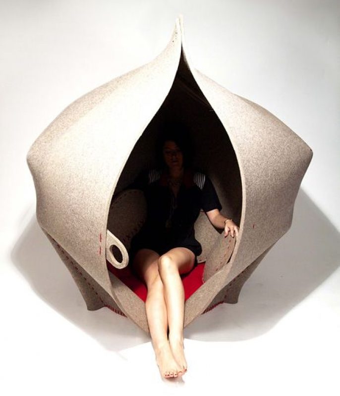 Designed by Freyja Sewell to create a cozy and private space, HUSH is a seating pod made of a single piece of industrial felt that was water jet cut and stitched together using wool yarn.