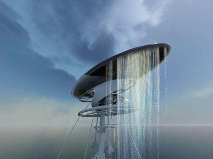 this depth of field creates a surreal environments which gives the illusion of boundary-less architecture, a kaleidoscopic panopticon.Deep ocean water is pumped up into the main concrete structure and distributed through the nozzle carbon fibre clad cantilevered surface. The surface choreographs the amount of pressure and water to fall onto the turbines below, in turn controlling the amount of electricity generated.