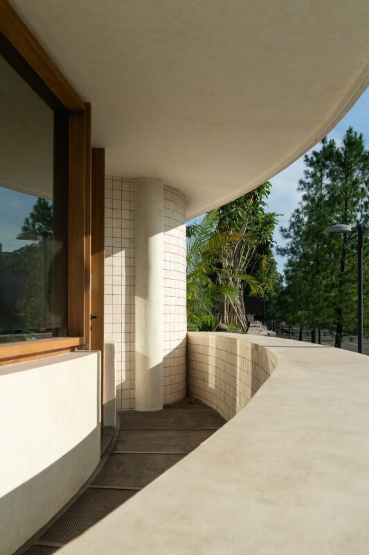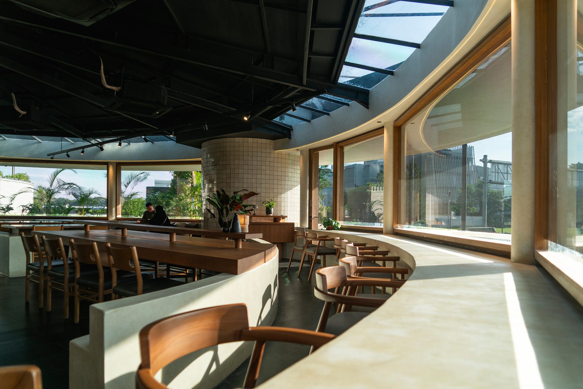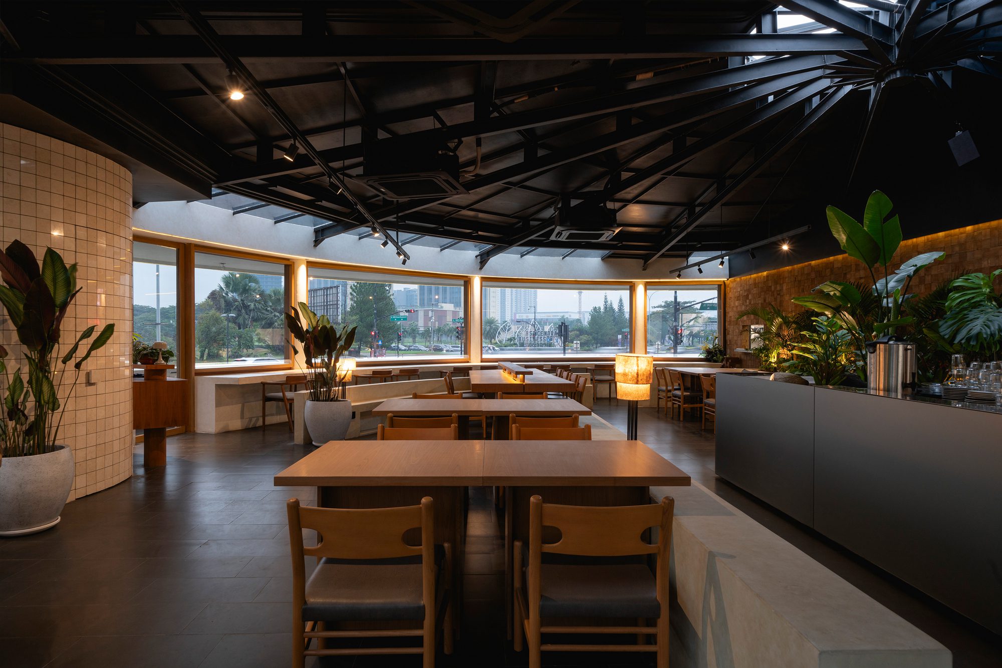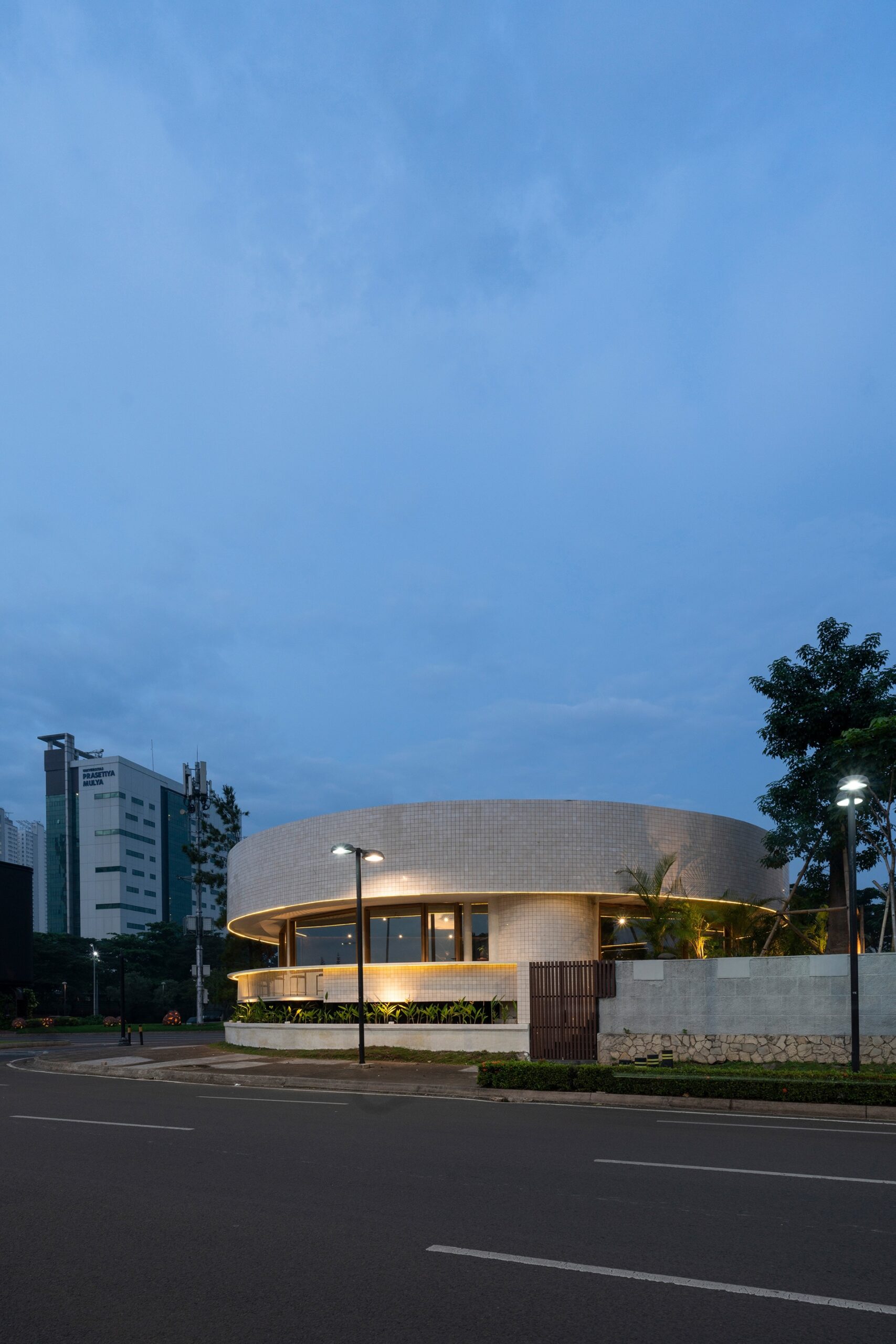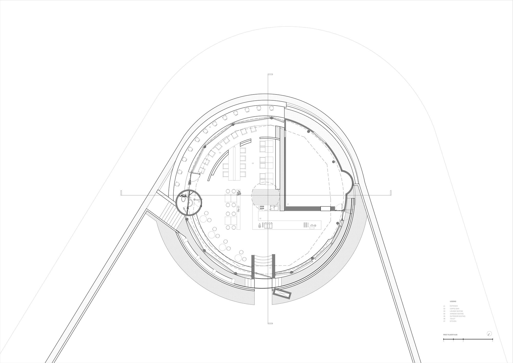This creates a clean, continuous form that gives the building a more defined presence in its urban setting. The circle also offers practical benefits, providing visitors inside the cafe with an unobstructed 360-degree view of the surrounding cityscape. This relationship between form and function helps the pavilion conclude the intersection as a modest yet recognizable landmark within the area.