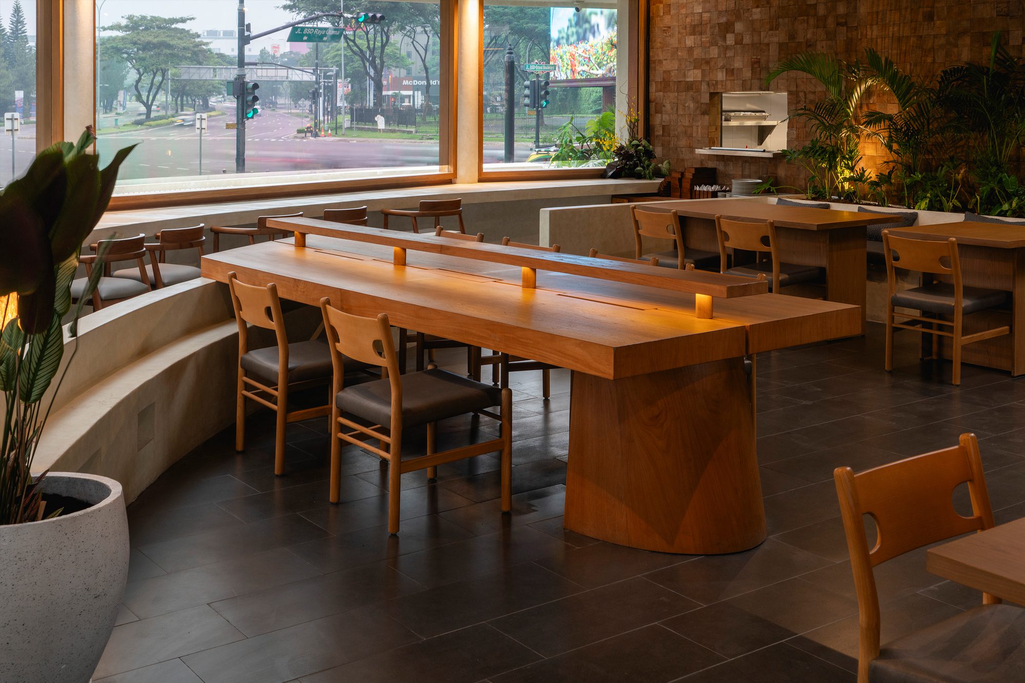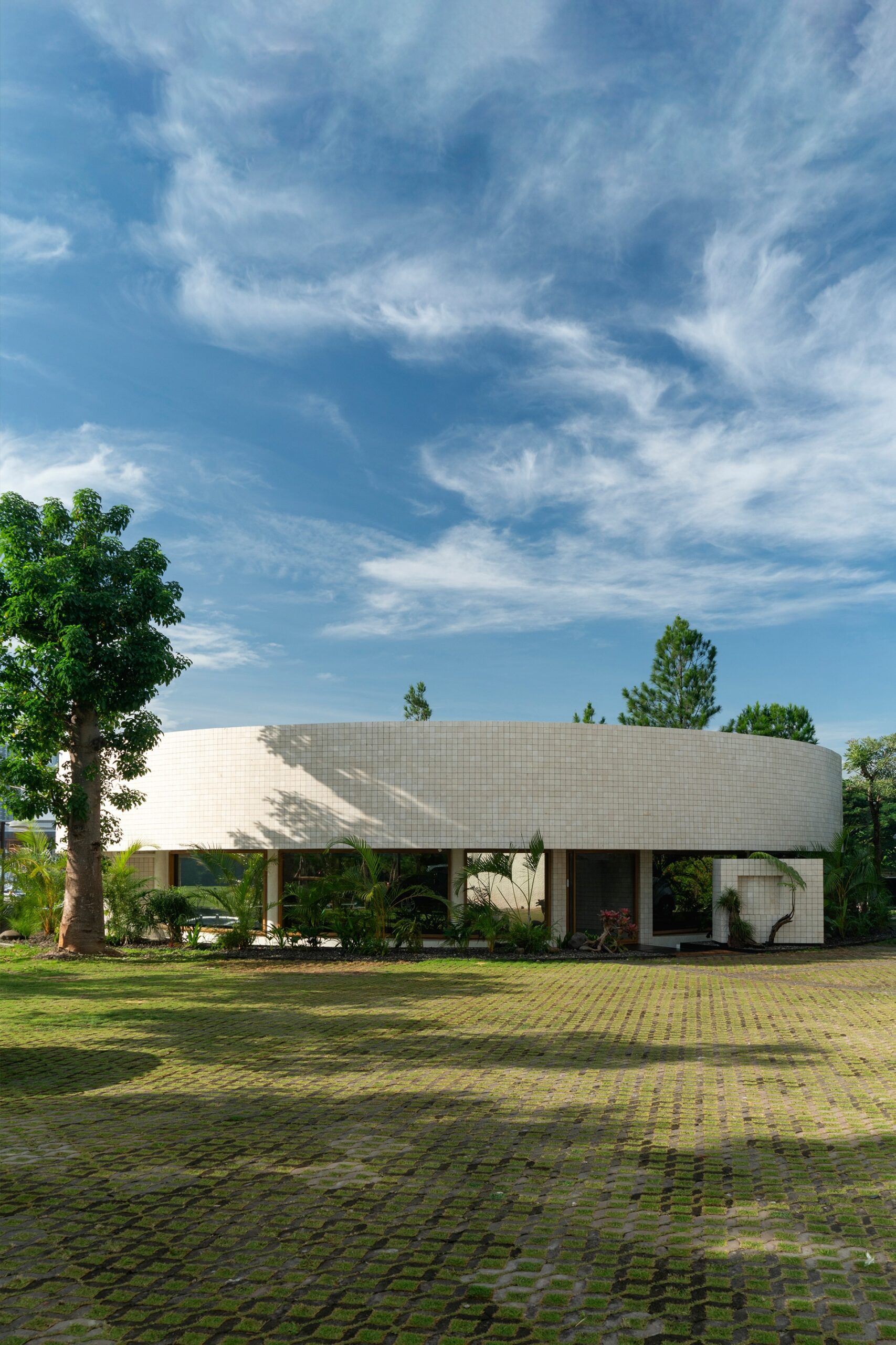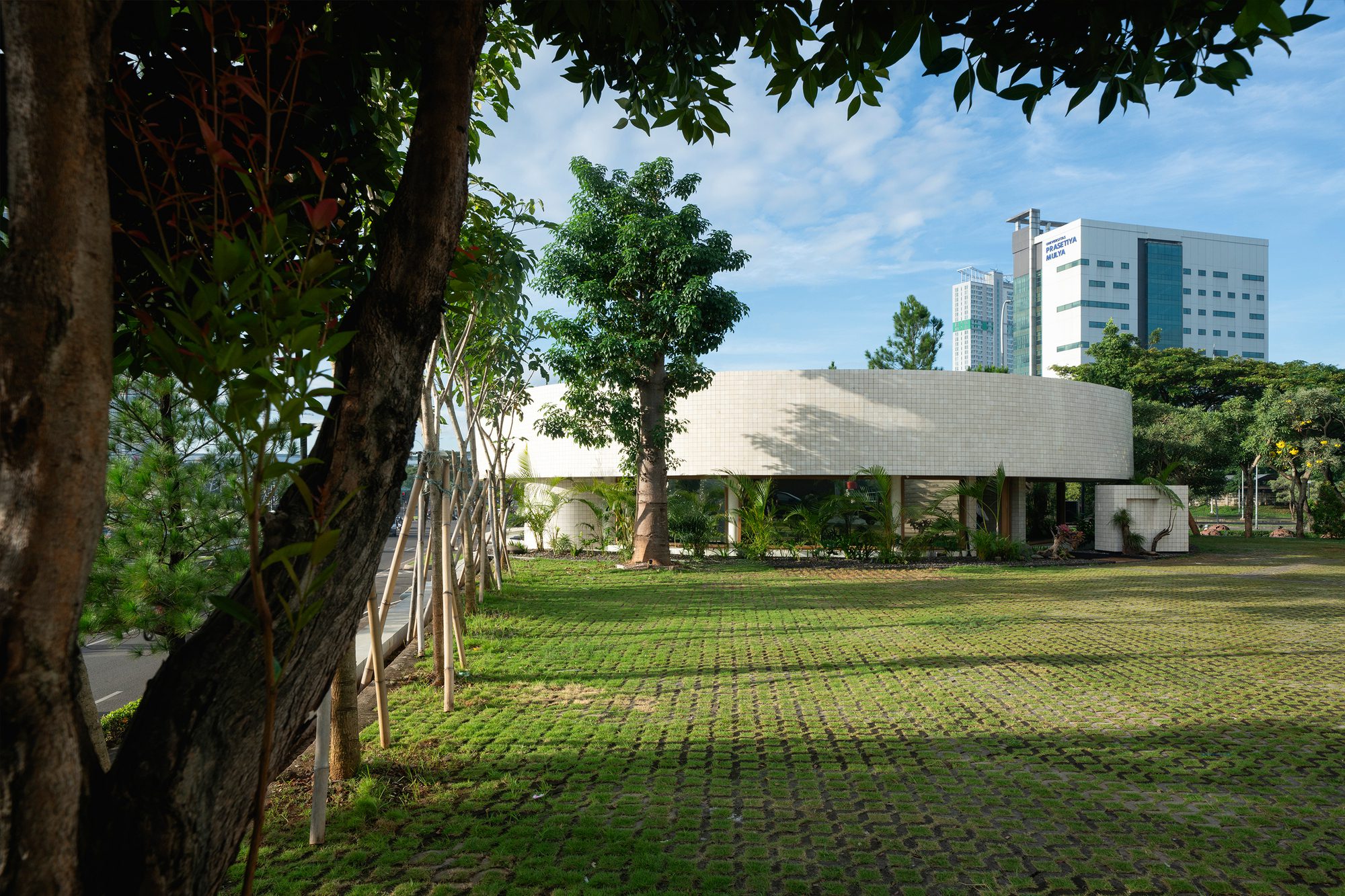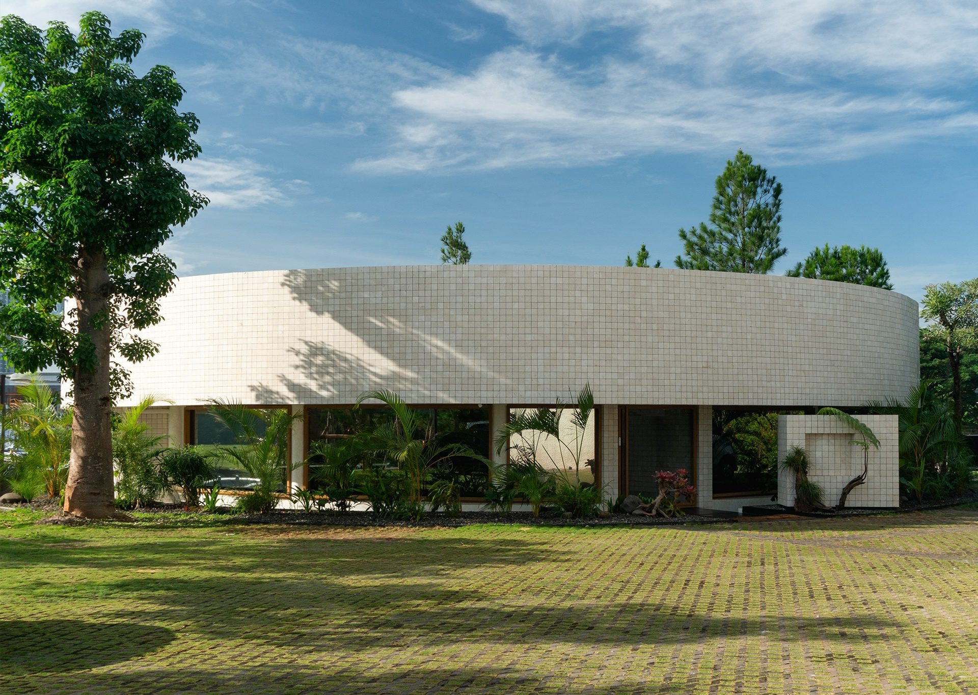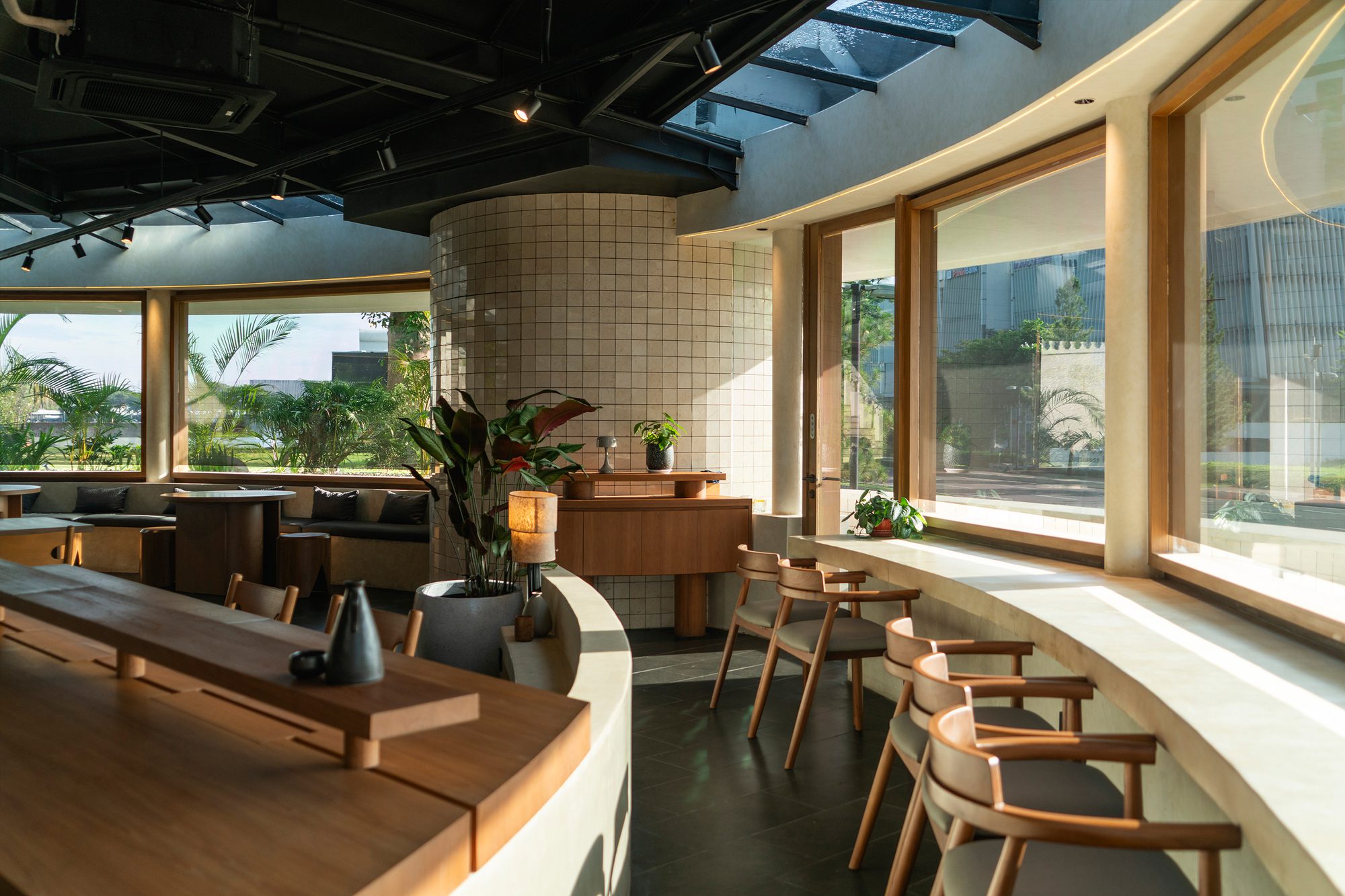 This creates a clean, continuous form that gives the building a more defined presence in its urban setting. The circle also offers practical benefits, providing visitors inside the cafe with an unobstructed 360-degree view of the surrounding cityscape. This relationship between form and function helps the pavilion conclude the intersection as a modest yet recognizable landmark within the area.