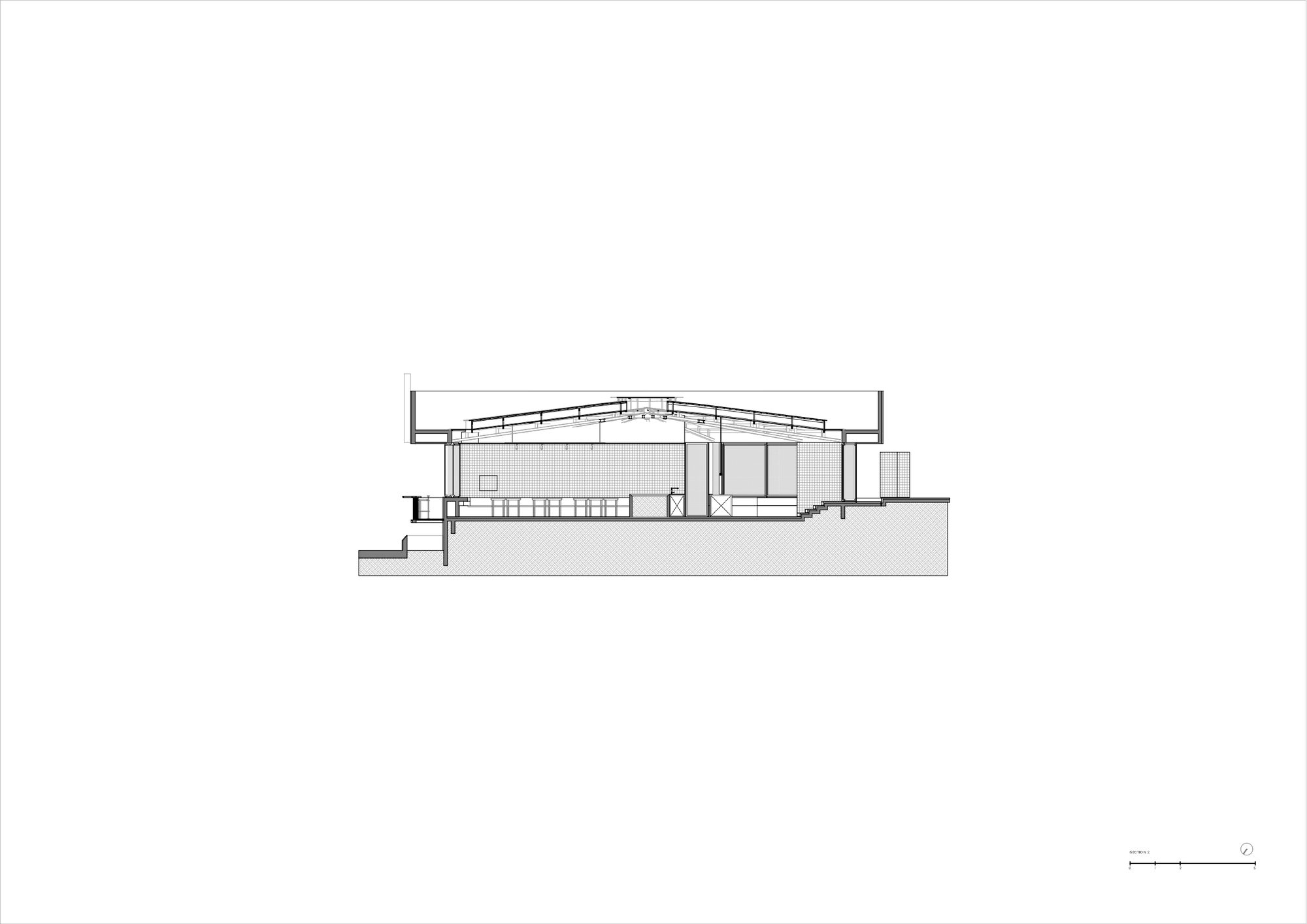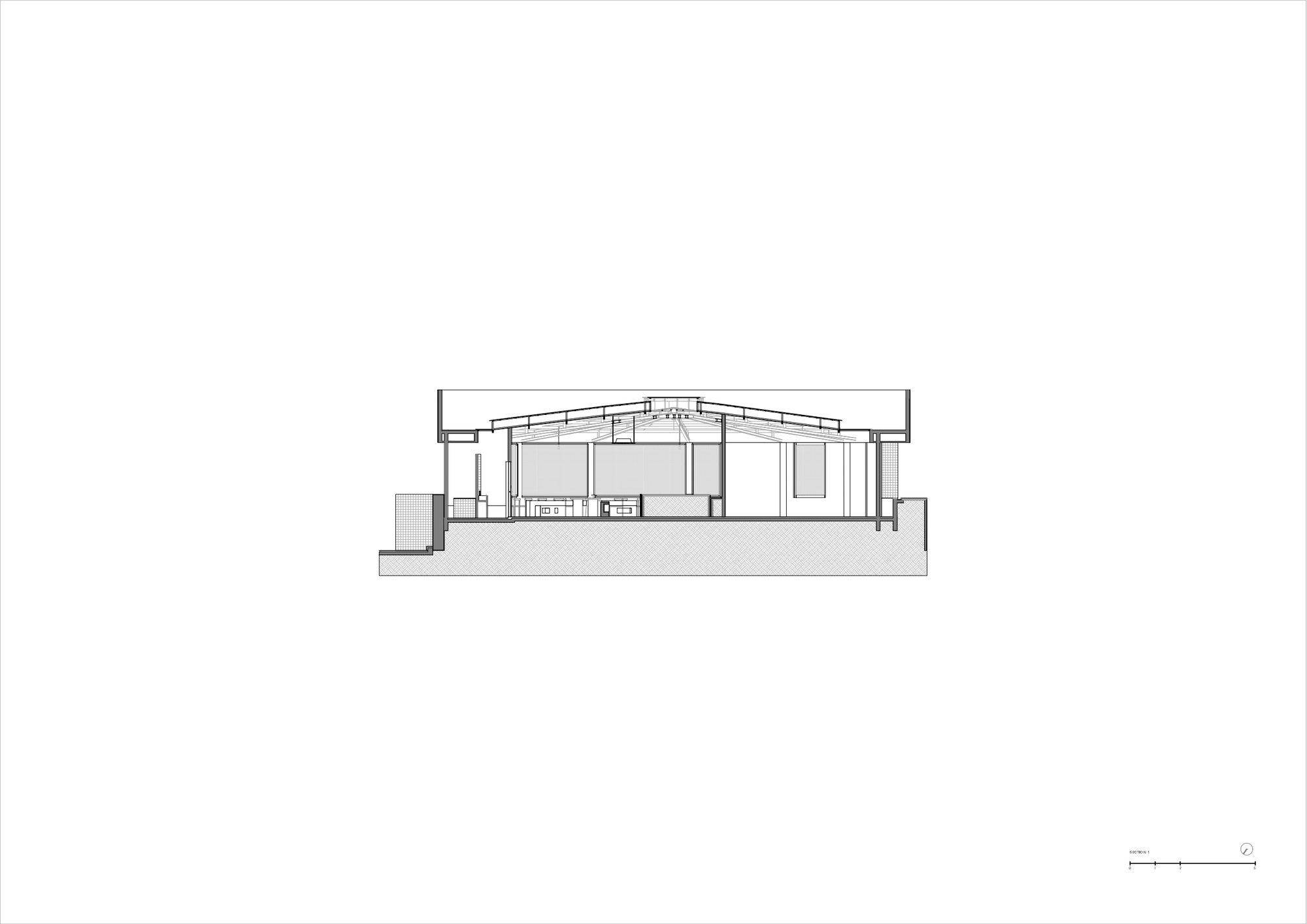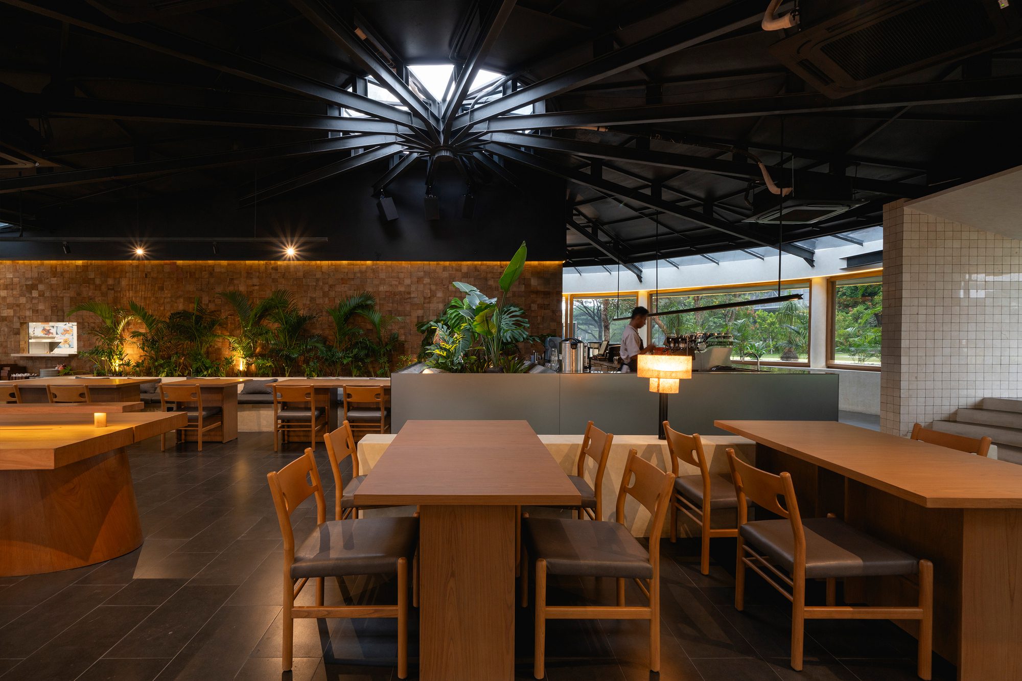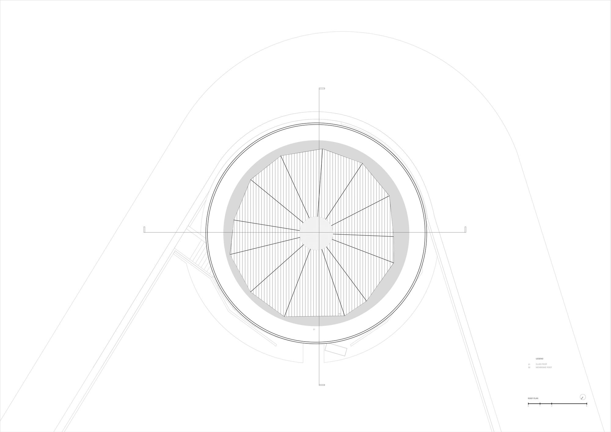 The design approach respects the existing building by working with its original features rather than replacing them entirely. The radial steel structure, which forms the main framework of the pavilion, is left exposed and treated as a central visual element. This decision highlights the pavilion’s construction method and gives the interior a raw, honest quality. The steel members radiate from the center, reinforcing the circular form and adding a sense of rhythm to the space.