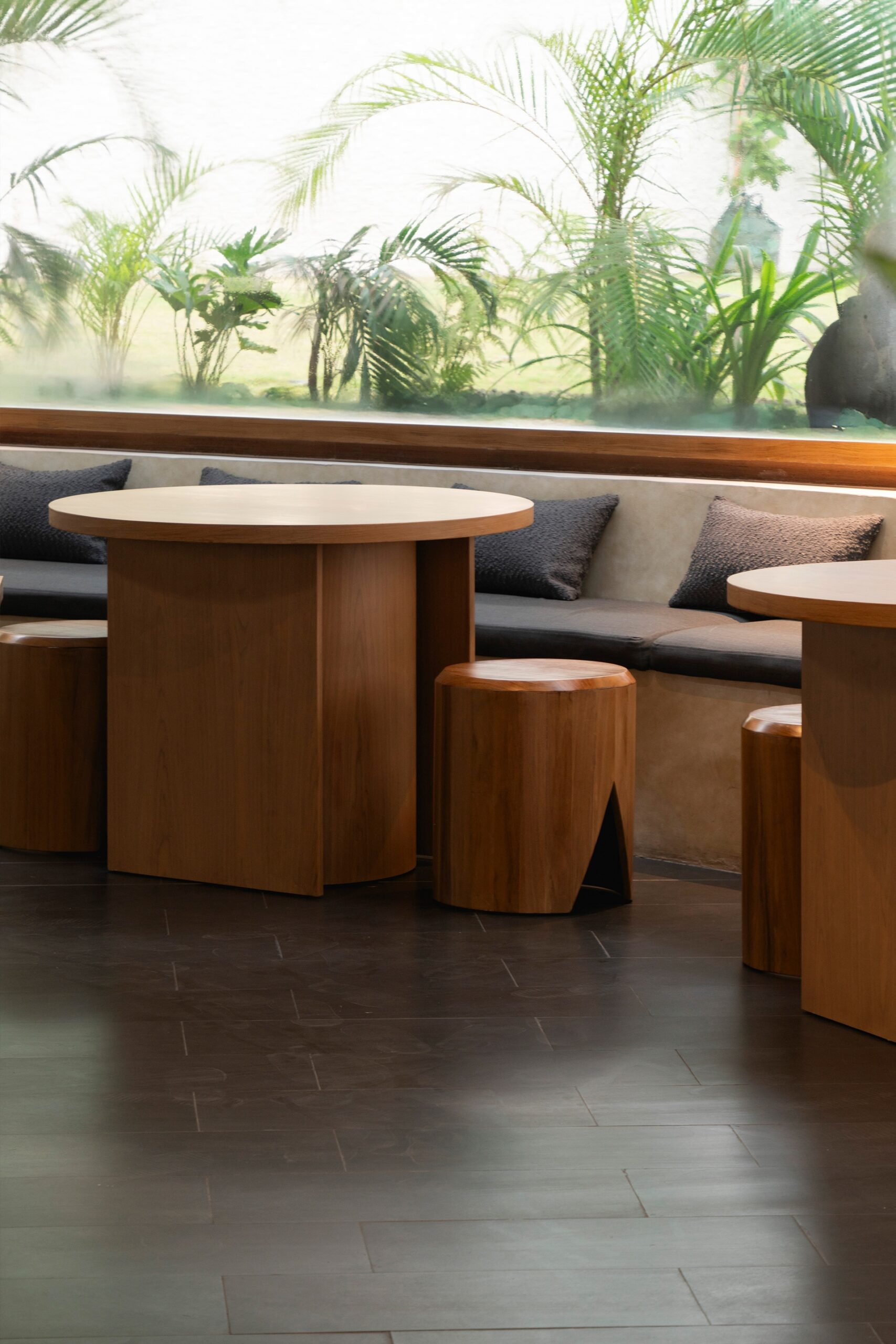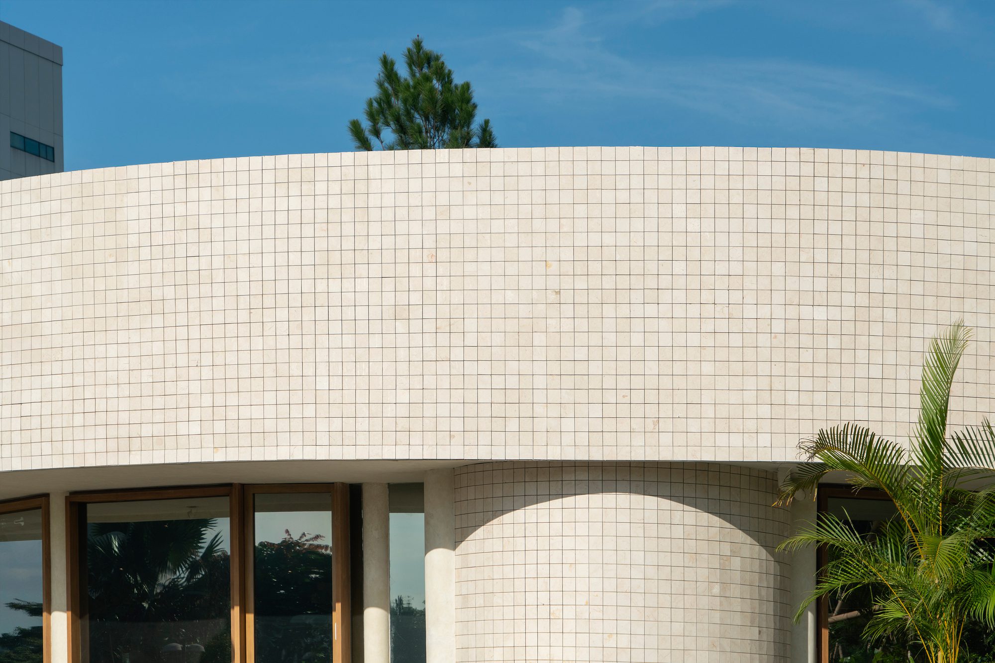 Hygge Cafe, The renovation of the Hygge Cafe pavilion focuses on making the most of the existing structure while introducing new materials and design elements to give it a new identity. The circular shape of the pavilion, which is its most striking feature, has been emphasized through the use of marble tilework that wraps around the exterior.