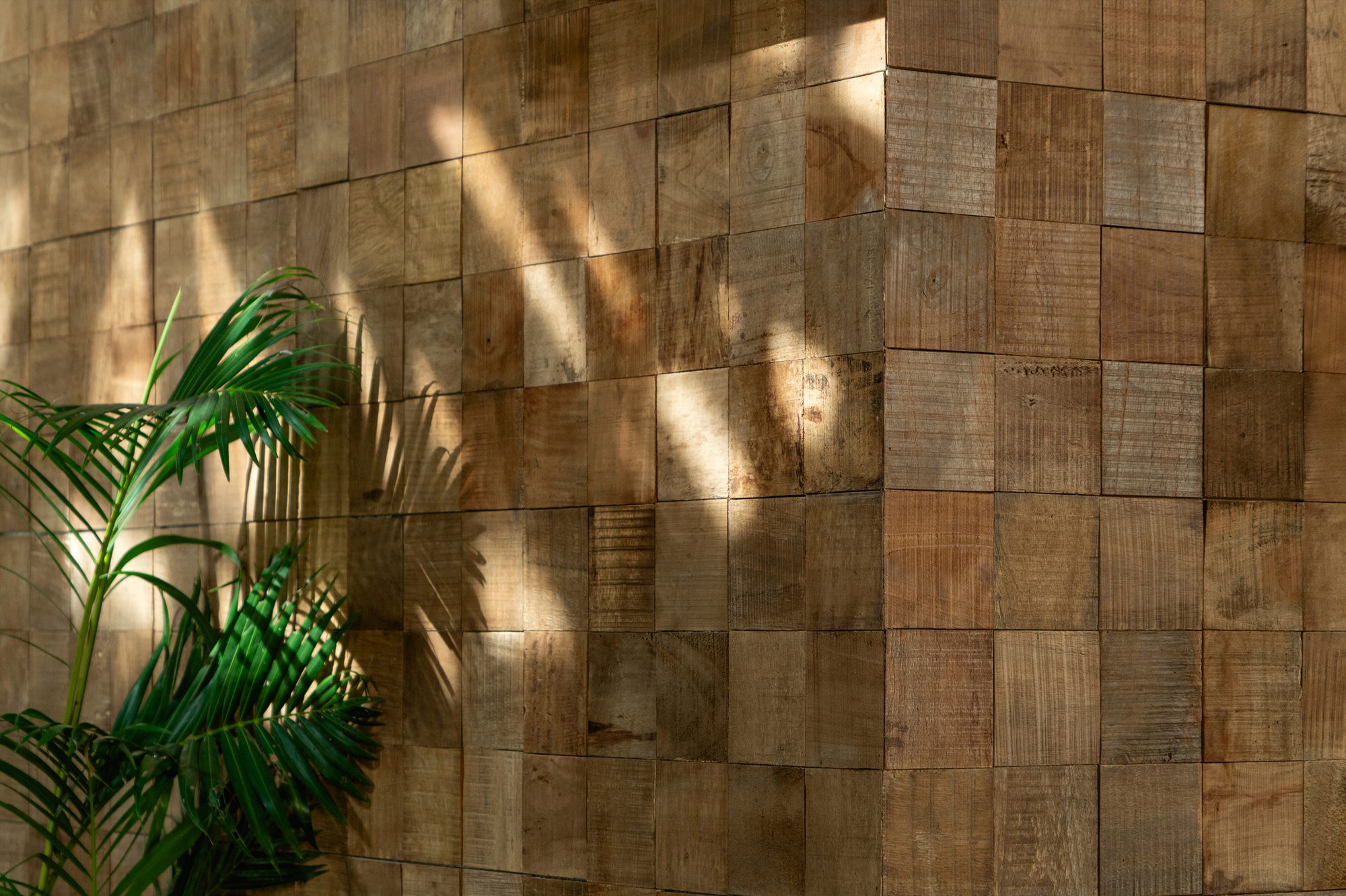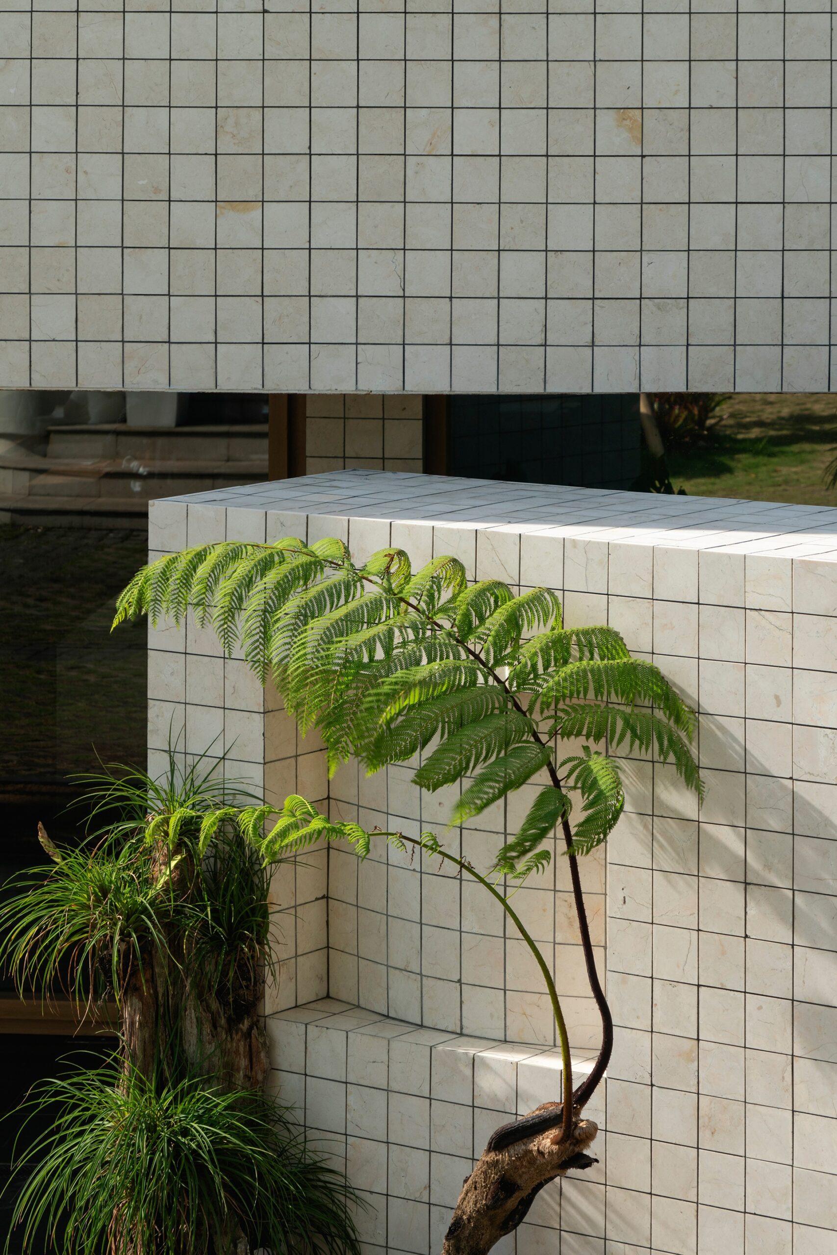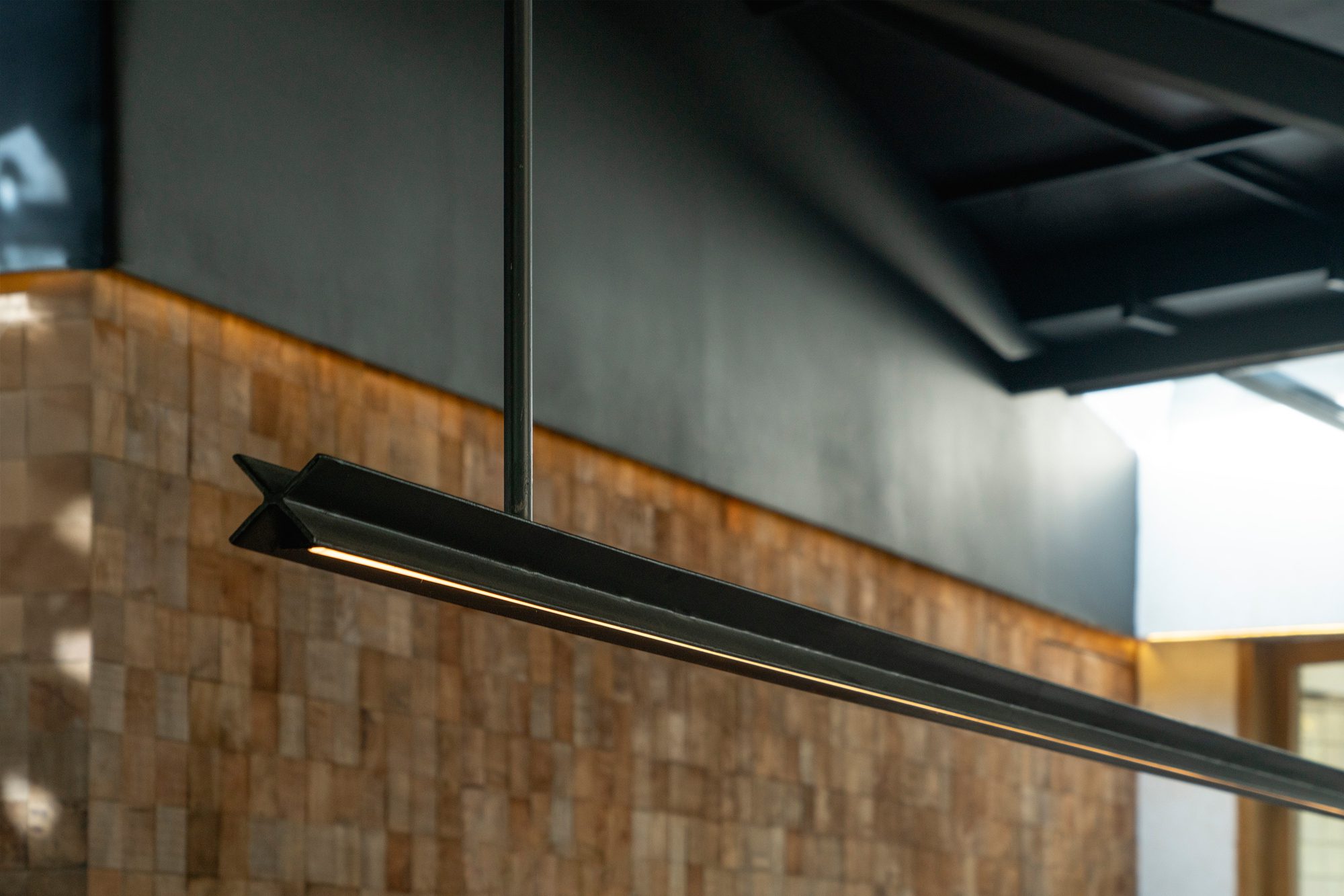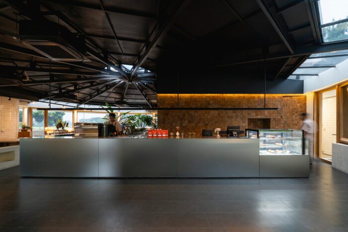 Wood planks typically used as formwork in concrete casting are repurposed as wall cladding inside the building. Their rough texture and natural grain add warmth to the otherwise minimal interior. The choice to use this overlooked material also introduces an element of familiarity and informality, balancing out the cooler, more refined surfaces like the marble and steel. The result is an interior that feels both approachable and visually interesting without being overly decorative.