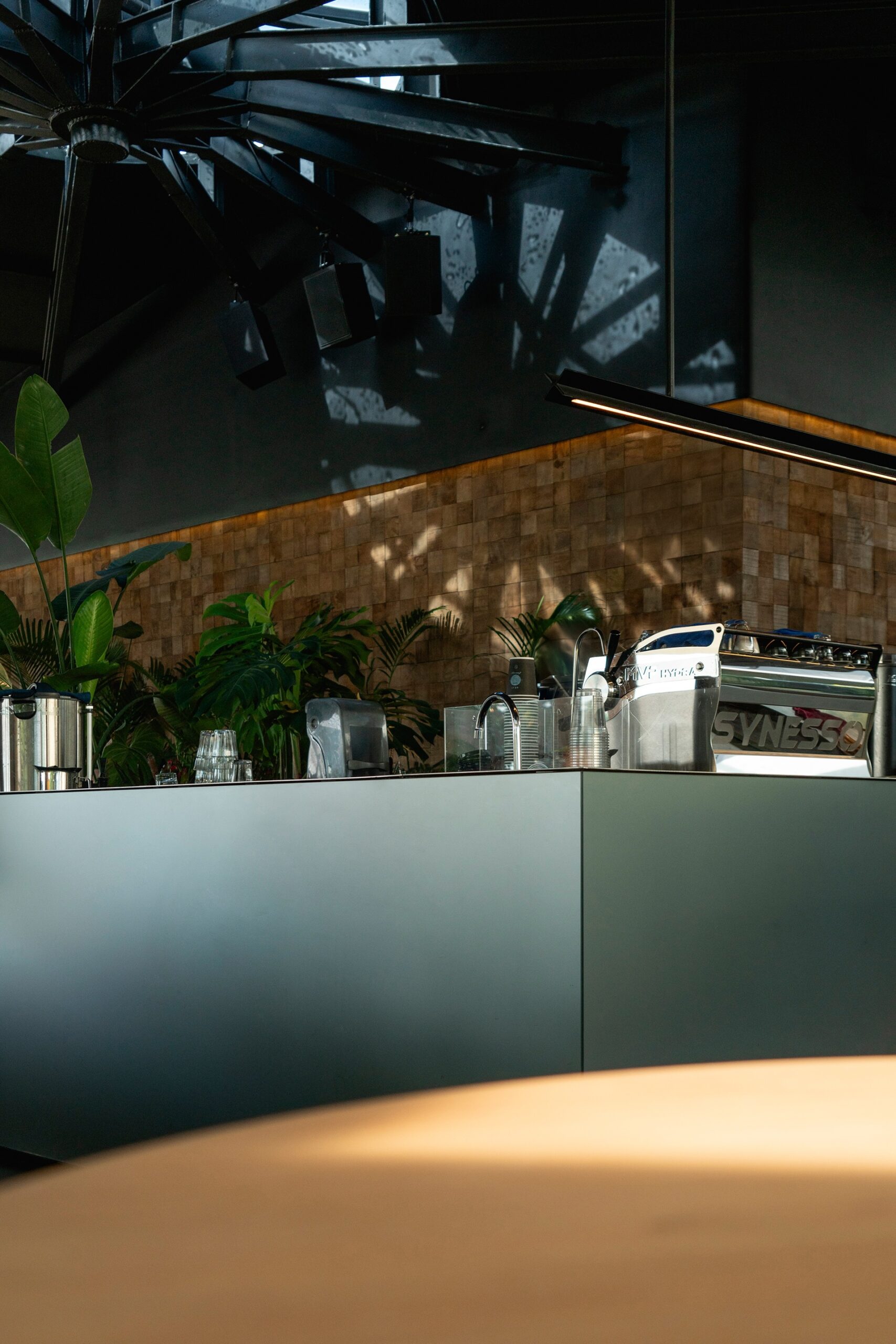 To compliment the woodplank, the acid glass helps to define the bar as a focal point while maintaining a cohesive relationship with the other materials in the space. The reflective quality of the glass also plays with the light within the pavilion, adding a dynamic layer without overwhelming the simplicity of the design.