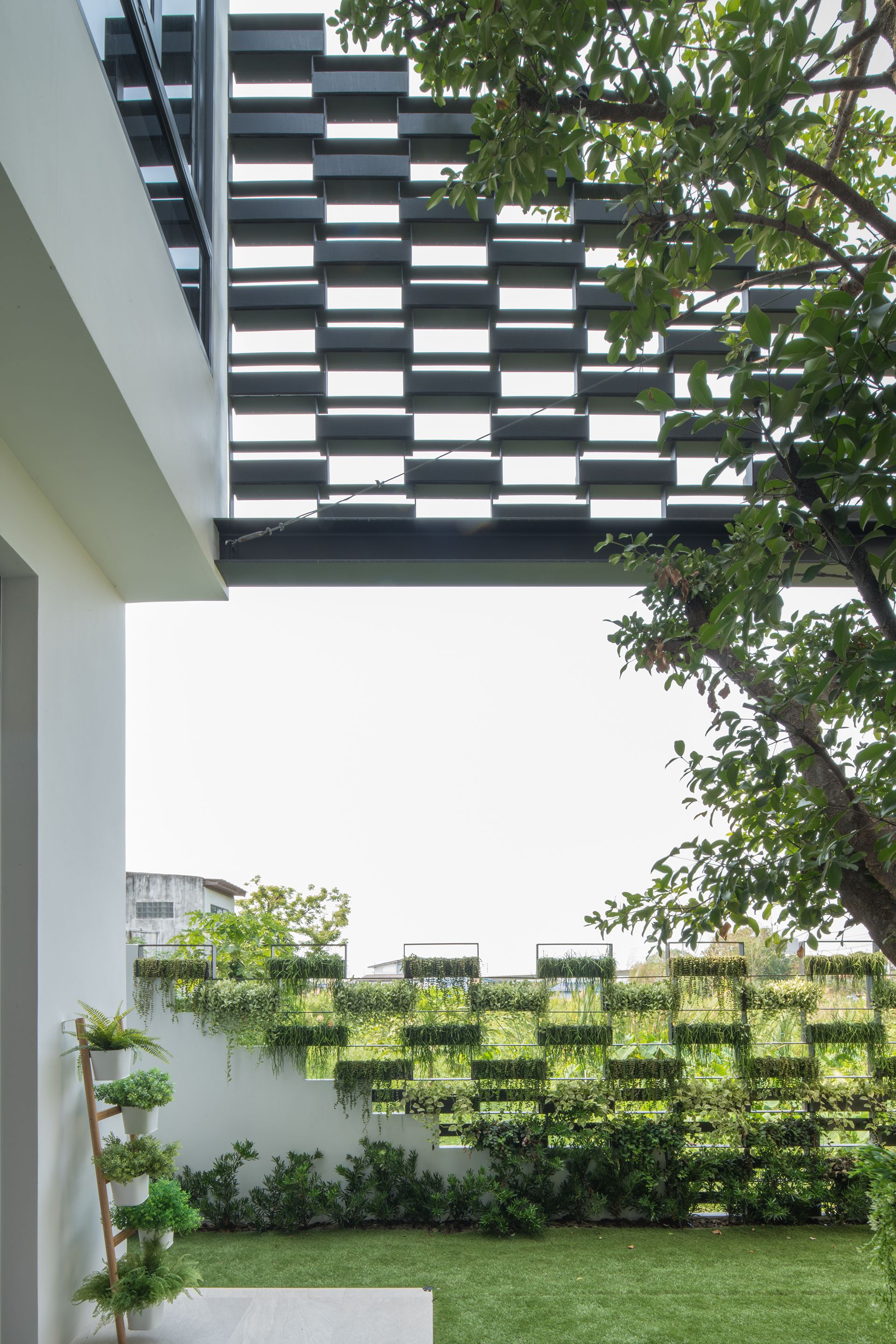 Due to tropical climates, Architect decides to study brick pattern system which applied to be vertical green façade. This façade system reduces heat from sunlight, provide natural ventilation through the courtyard toward residence’s comfort zone.