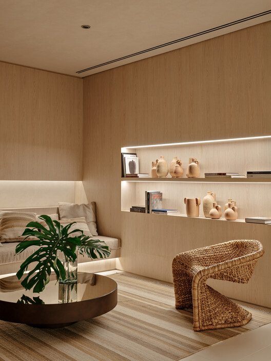 Inside, material continuity is preserved with the extensive use of concrete, wood, glass, and warm-finished metals. Elements such as wooden panels camouflage technical doors and organize the flows. The furniture curation includes pieces by renowned names in modern and contemporary Brazilian design, such as Jorge Zalszupin, Carlos Milan, Marcelo Magalhães, Guilherme Wentz, Lattoog, and Arthur Casas himself, with highlights including the Soft armchair (+55design) and the Square table (Herança Cultural).