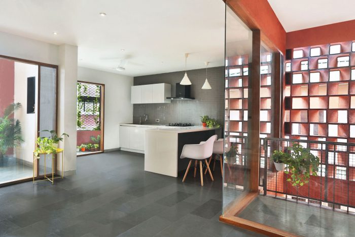 The renovation had to be dramatic to match its energetic occupants. The building was to cater for an office of 20 employees in addition to an expanding joint family. It also needed a look distinct from its neighbors hinting at its mixed-use avatar. We began with an inside-out approach carving out the interior to match the space requirements of each floor. The largely column-free office on the ground floor proceeding to the parents’ apartment on the first (with a traditional closed kitchen and utility terrace) and finally onto the sons’ open plan apartment on the second. Ferrous oxide walls feature as prominent elements on each floor with built-in lighting features. A cement lattice to the east gives visual privacy from close neighbors and filters light to the living spaces. In addition to the walls, a portion of the second-floor slab was also demolished to link the two residential floor balconies.