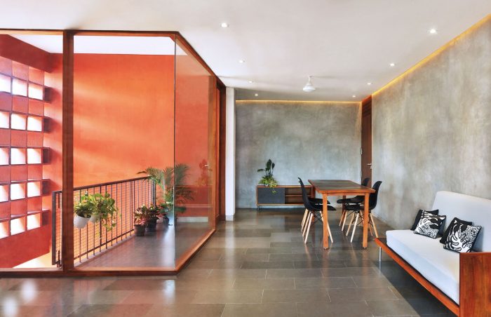 Designed by Meister Varma Architects, Identiti is an advertising and branding agency run by a father-sons trio who wished to consolidate their home and office in different parts of the city into a spacious live-work unit. By the time we were approached, a building had been purchased for this purpose on a relatively compact 270 sqm site. The existing structure was an archetype of a build to rent style prevalent throughout Kerala with low daylight and even lesser character. Cramped room sizes resulting from a half-baked interpretation of Vastu (traditional Indian system of architecture) made matters worse.
