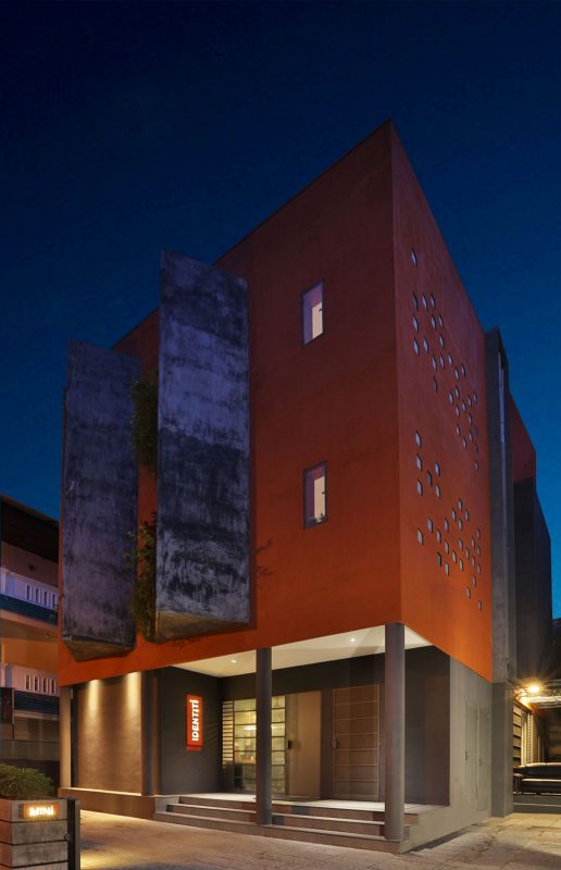 On the exterior, the public/private functions are visually separated by the surface treatment of plaster and color. A red ochre wall deriving its color from the company logo wraps around the building setting it apart from its residential surrounding. Large balconies finished in polished cement and spanning two floors jut out towards the front. Inbuilt planters within act as vertical kitchen gardens used to grow creepers and herbs. The building aims to be a model of invigoration for life in a dense urban environment incorporating a variety of spaces and functions.