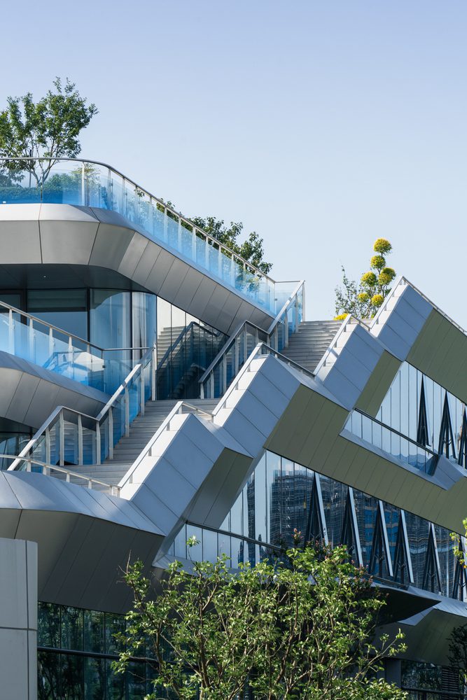 The terraces, lobbies, and aerial tracks in the office area, along with the central ecological corridor and landscape installations, contribute to a comprehensive urban art park. This creates a new experience of exploring a park and viewing exhibitions within a tech company setting.