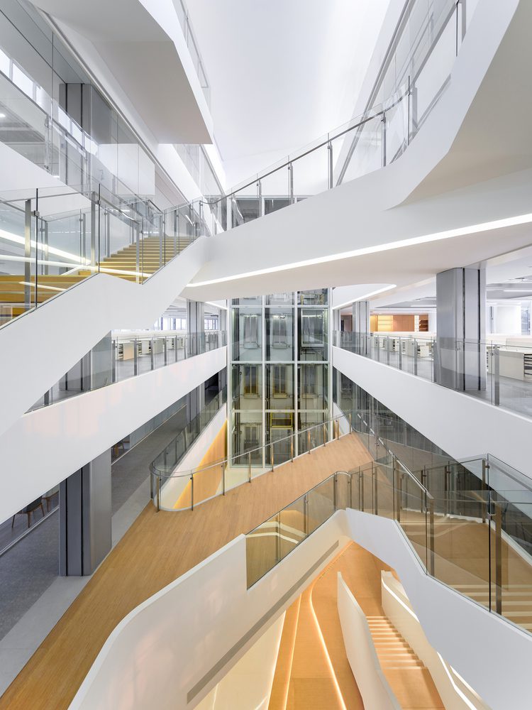 The public areas are organized around the southern and northern atriums, both reaching nearly 25 meters in height. The northern atrium features a “shared theater,” centered on a sculptural staircase that encourages interaction and supports various activities through tiered seating.
