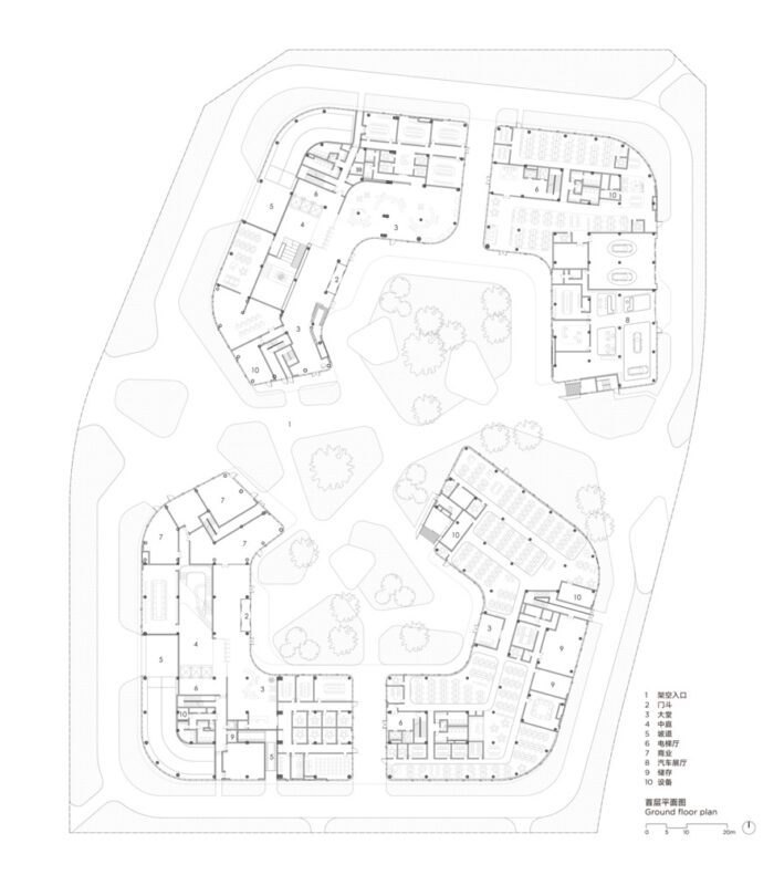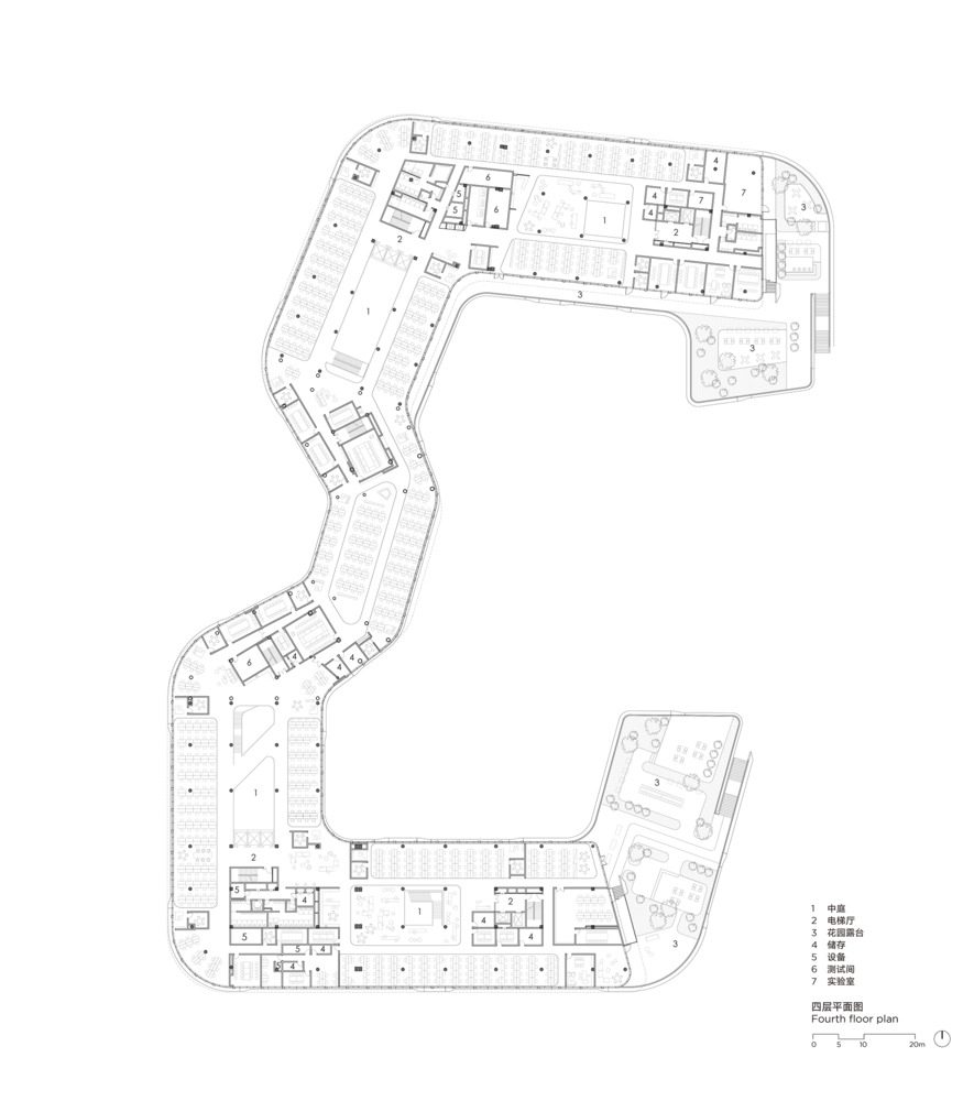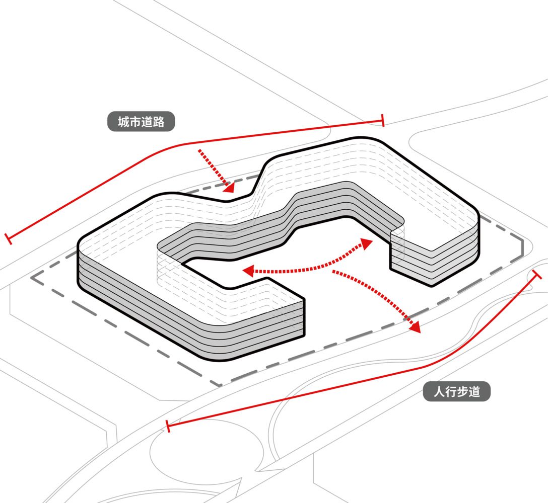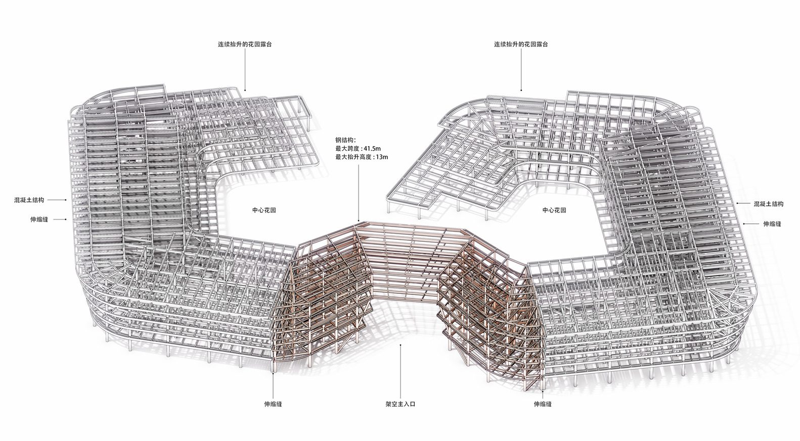 The four streamlined structures not only release ample internal landscapes but also create a dual ecological significance for the site—serving as both an urban park with expansive views and a green, sustainable office environment. The office buildings utilize a strategy of vertical development and horizontal connections, combining group structures with public levels. This design allows for independent operation while sharing essential facilities, minimizing necessary travel distances and enhancing efficiency.