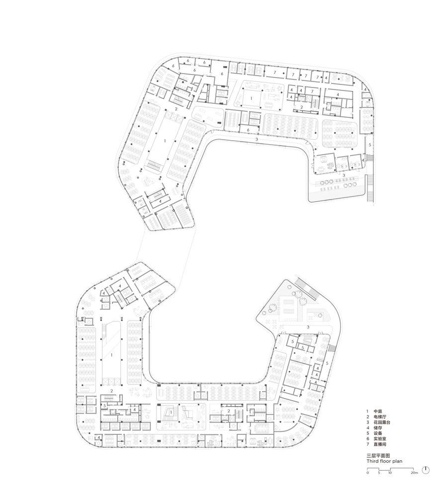 The southern atrium serves as a “cohabitation square,” enhanced by accessible passageways that promote interdepartmental communication. Numerous communication spaces scattered along these corridors act as intersections for interaction and recharging, enriching the spatial experience.