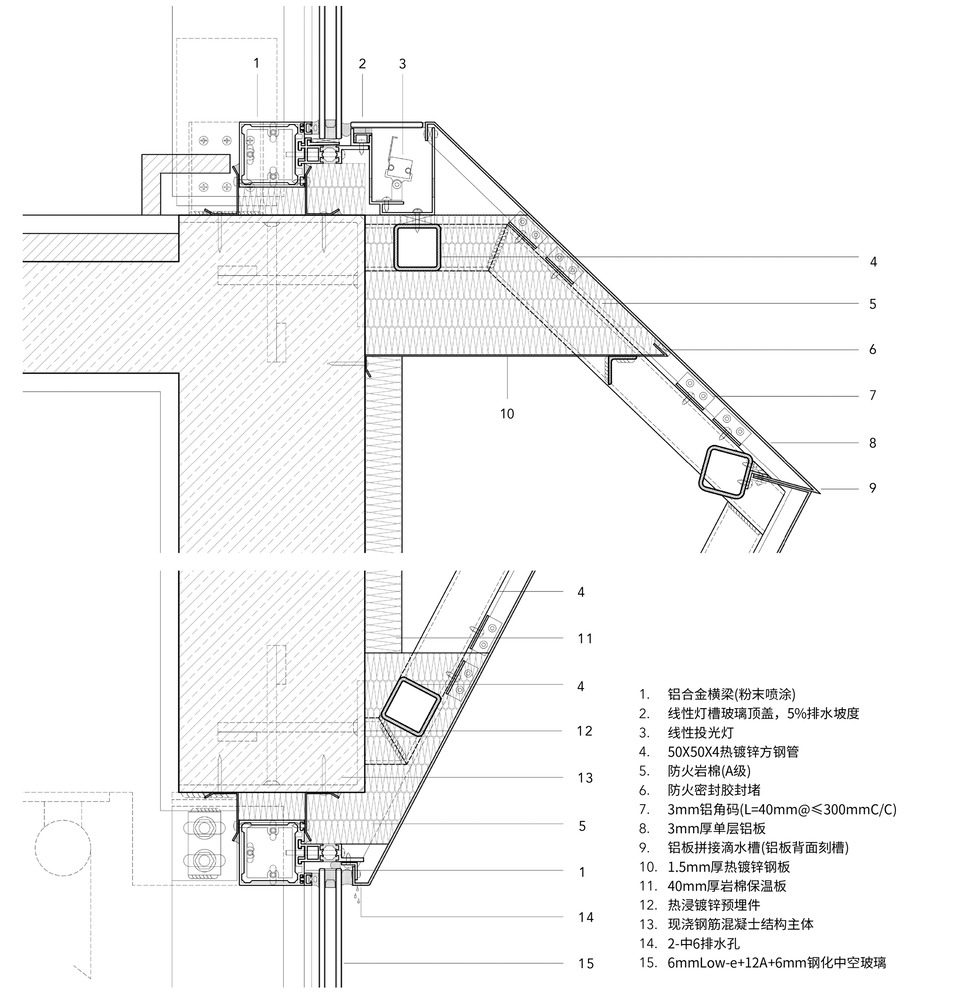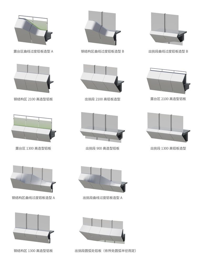 During the design development phase, we meticulously considered post-processing costs and on-site construction feasibility, categorizing the interlayer aluminum panels. Based on different location nodes and dimensions—such as protruding sections, terrace areas, and steel structure regions—we classified the aluminum panels into 13 categories with detailed annotations. Early in the construction phase, we conducted on-site mock-ups to test and validate the drainage methods for linear aluminum panels, hyperbolic aluminum panels, and the pointed ends of the panels before proceeding to production and installation.