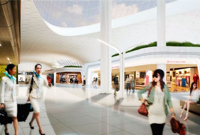The new building will offer an array of attractions that, like a city, make it a compelling destination. Amenities include VIP lounges; a landside shopping and retail district; aircraft observation deck; a transfer hotel; sculpture and exhibition areas; and gardens featuring waterfalls, indoor streams and koi ponds. The retail lifestyle centers offer double-level shopping and remote duty-free pick up of purchases from Seoul.