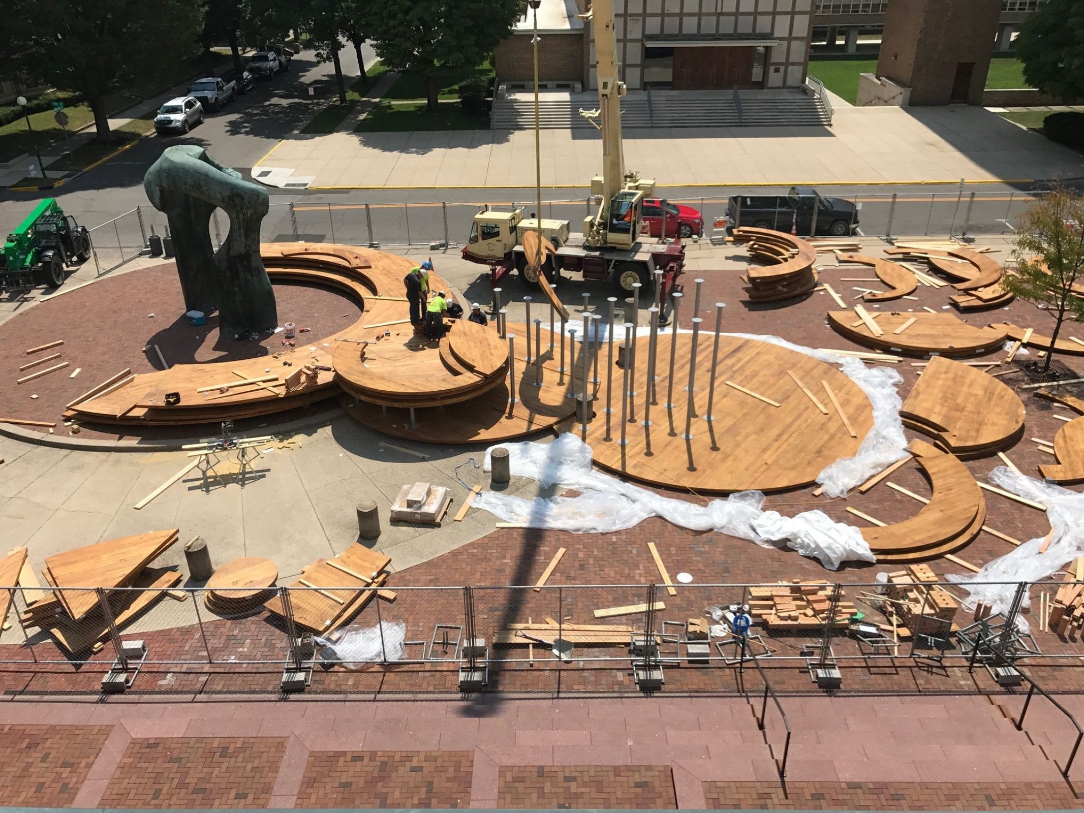 By bridging across the now defunct rotary and occupying what is now an empty area of the plaza, the installation seeks to restore programmatic function to the site, encourage dynamic circulation around the sculpture, and allow the plaza to be experienced in a new way, in both horizontal and vertical directions.