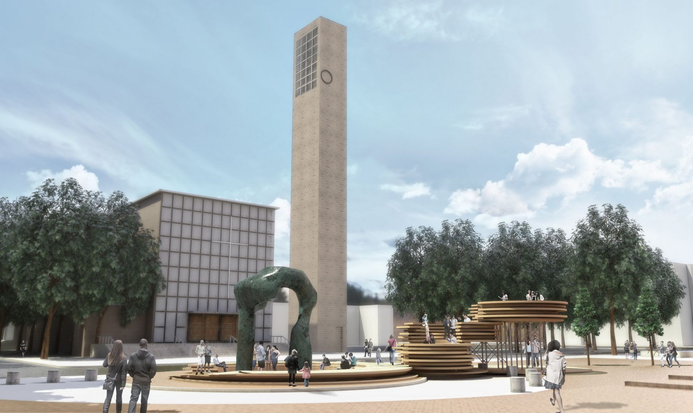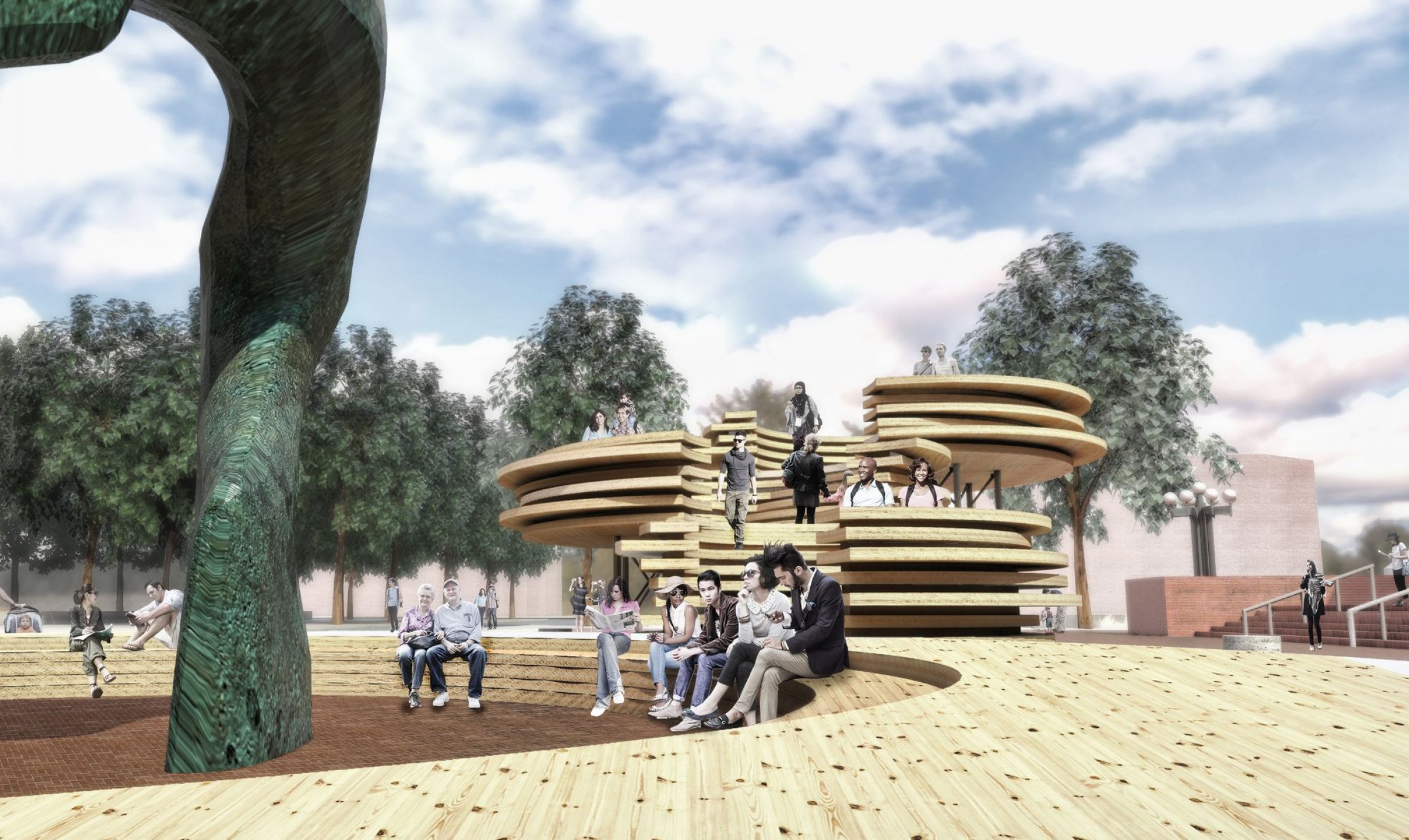 The installation offers a place for the community to gather and converse, and elevates people, both literally and metaphorically. Starting around the perimeter of the Moore sculpture on the eastern half of the site, large shifting timber discs compose a series of plinths that rise upward towards the west.
