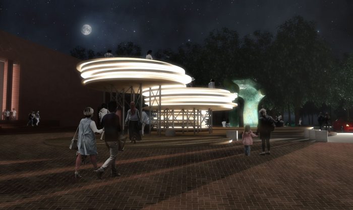 IKD’s proposal for the Cleo Rogers Memorial Library plaza, titled Conversation Plinth, pays homage to J Irwin Miller and aims to celebrate the community of Columbus. Its form takes cues from the conversation pit in the living room in the Miller House, as well as the plinths that elevate the important landmarks immediately surrounding the site—the library designed by I. M. Pei, the First Christian Church designed by Saarinen church, and the Large Arch by Henry Moore.