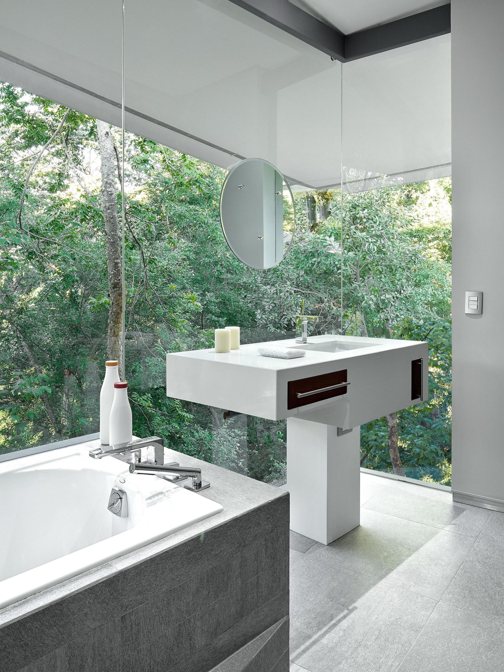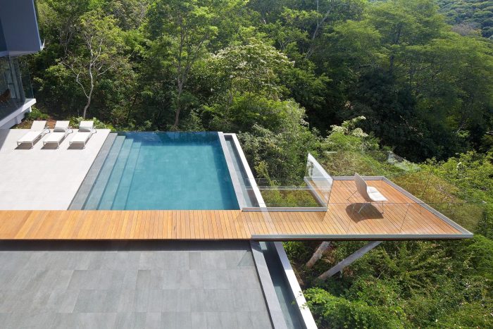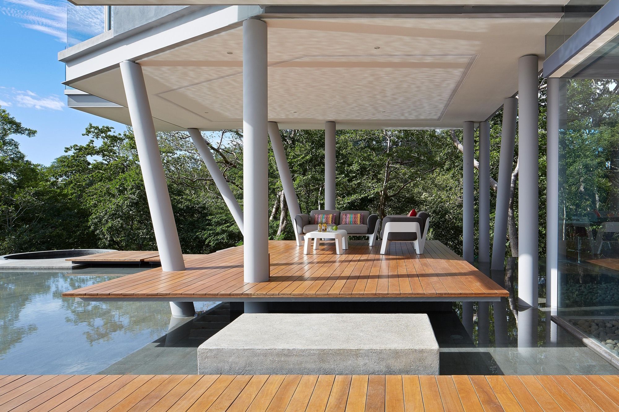 The pool merges with a water/terrace/ mirror that surrounds an outside living room in its entirety. It is located below the master bedroom and framed by a set of diagonal columns. This shaded “island” is the pivot of the social area, located in a strategic place near the kitchen and receives the sea breezes and enjoys magnificent views of both the forest and the sea.