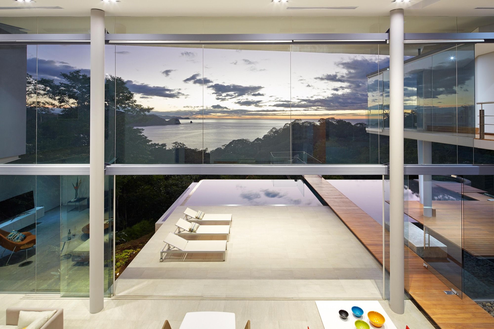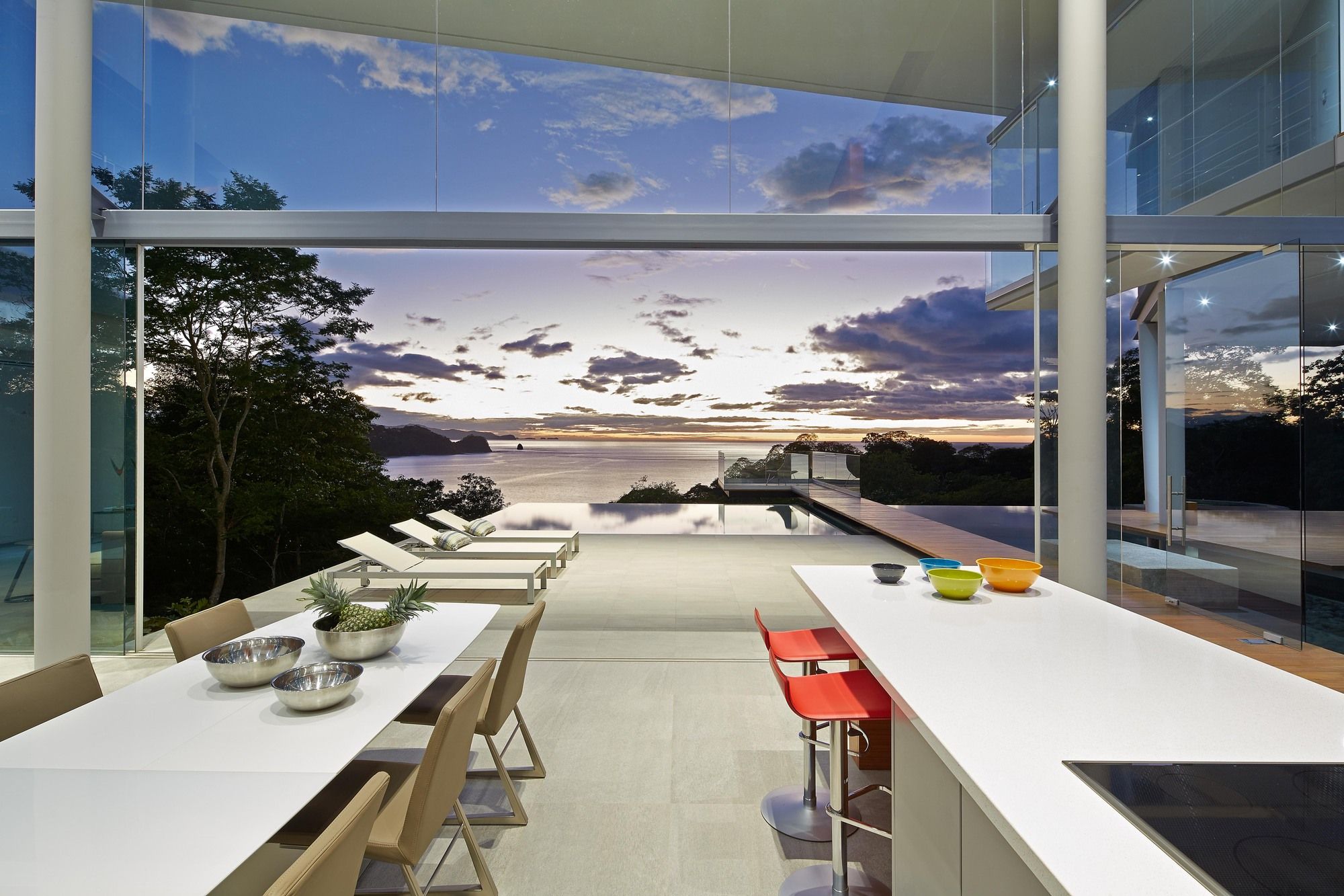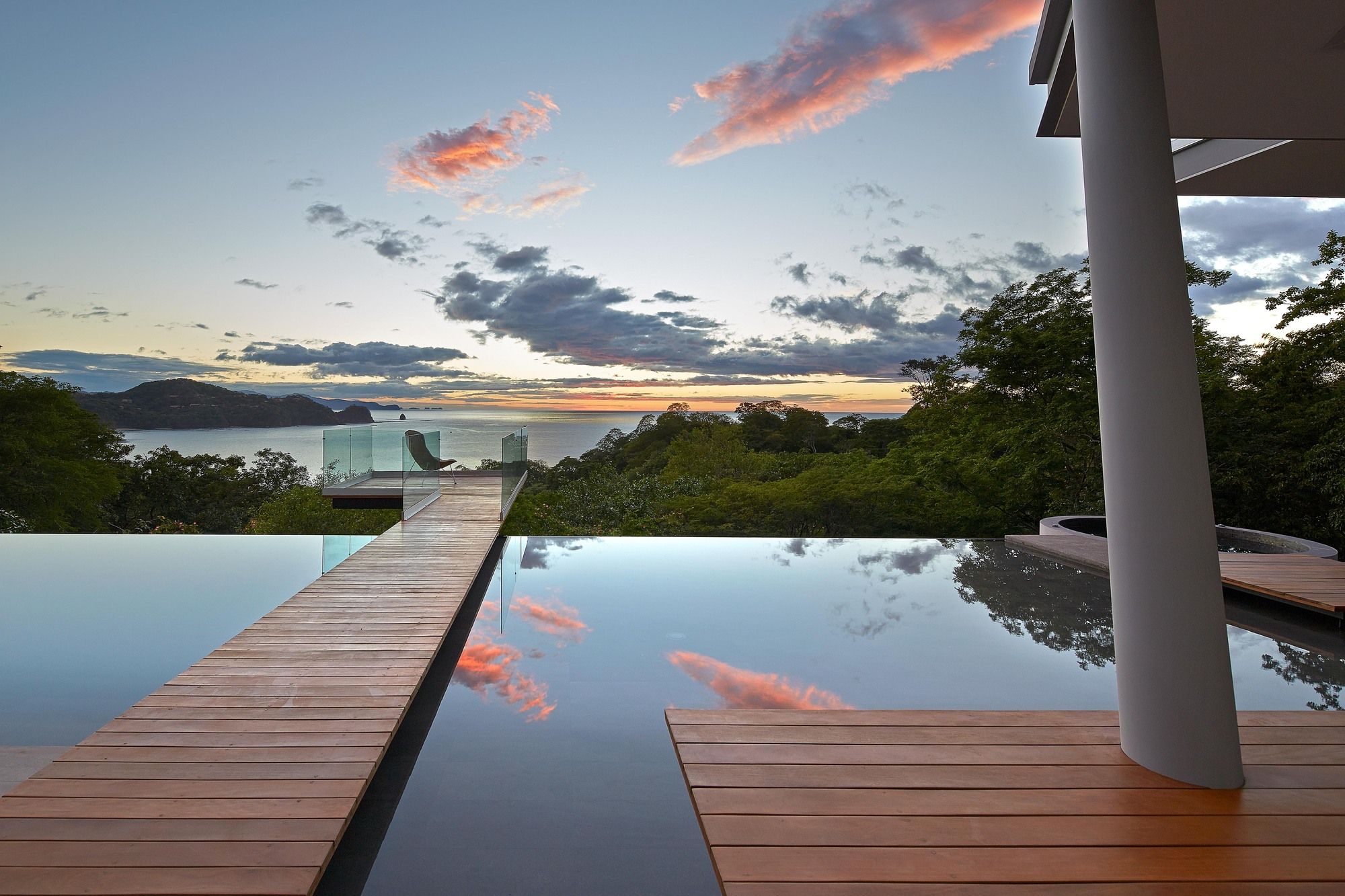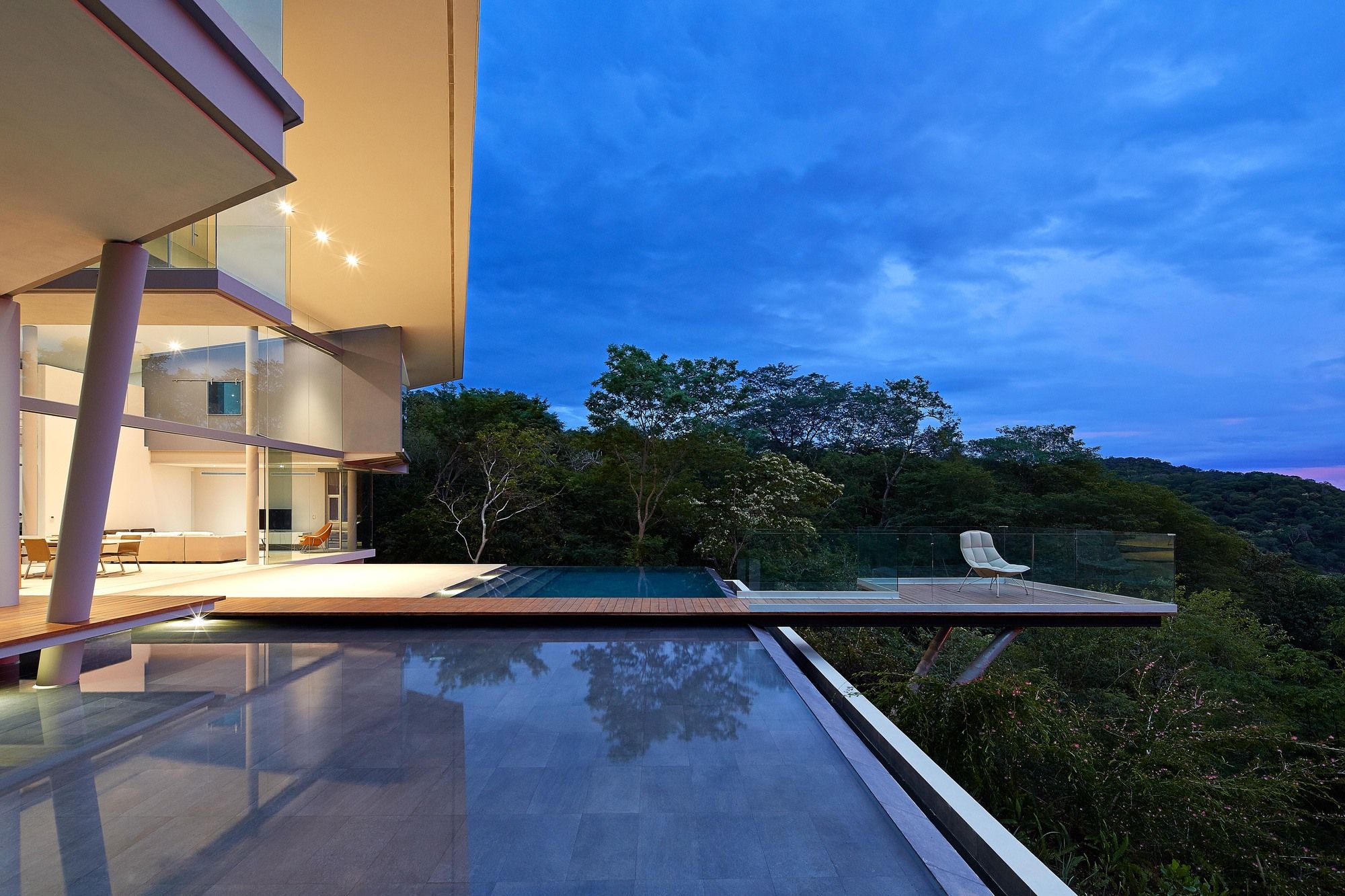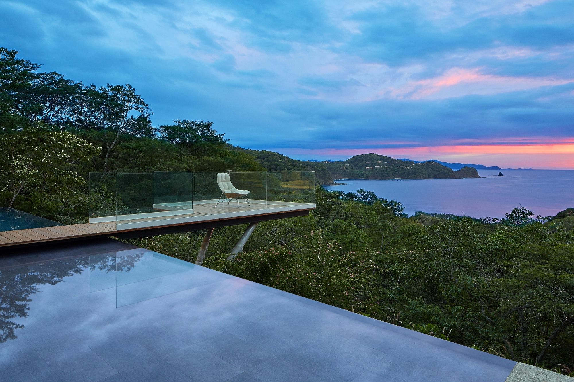 In the Papagayo peninsula, placed on the tip of an seaward pointing, and slightly downward sloping ridge of a peninsular shaped lot, with forest on both sides ( one a natural reserve), is the house named Indios Desnudos.
