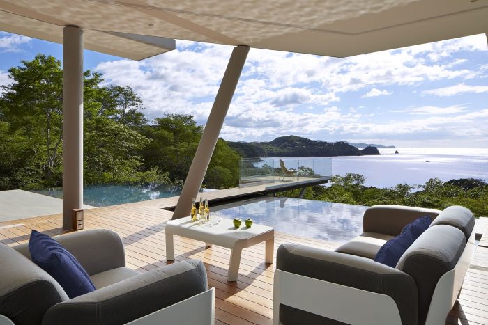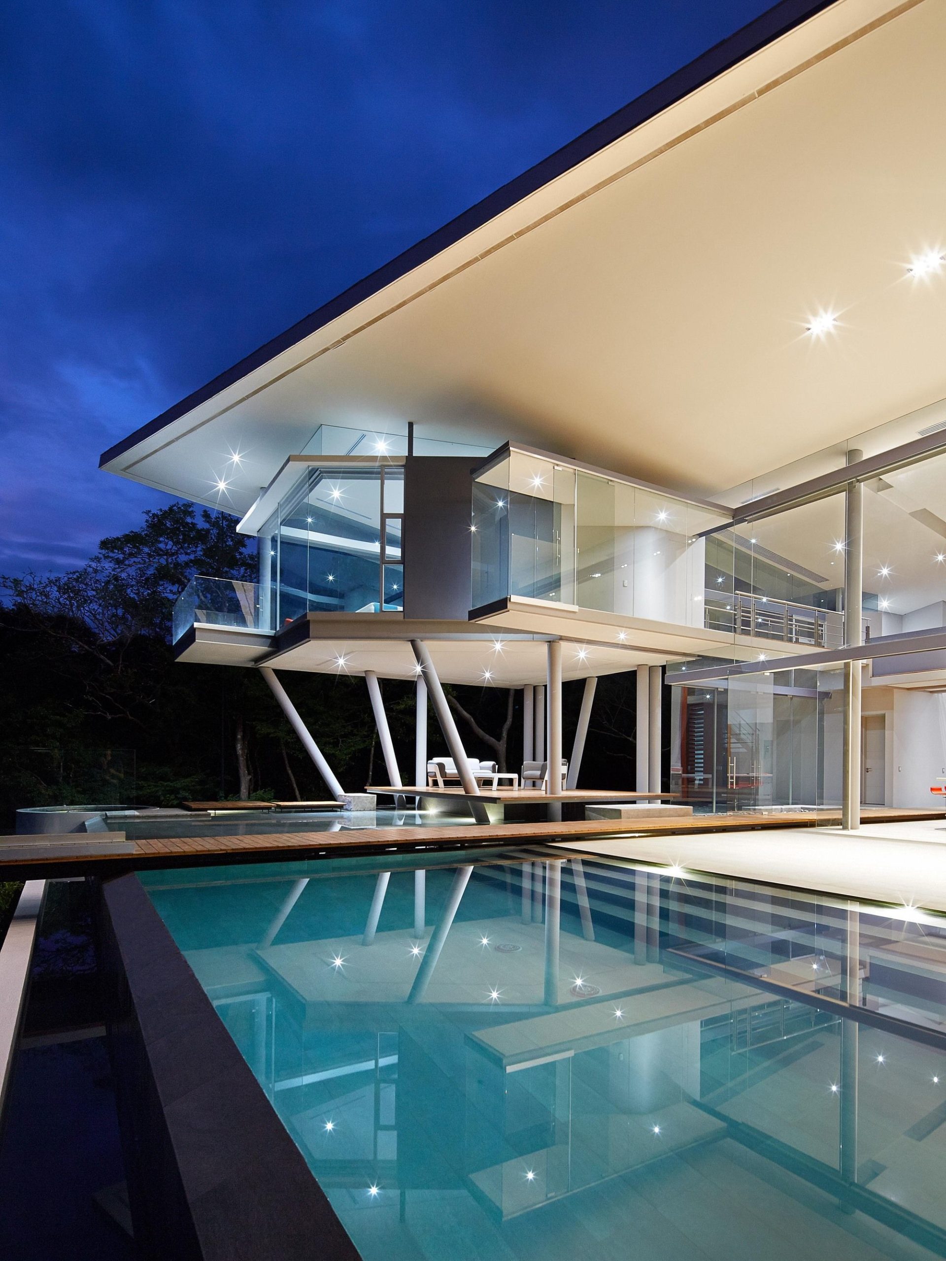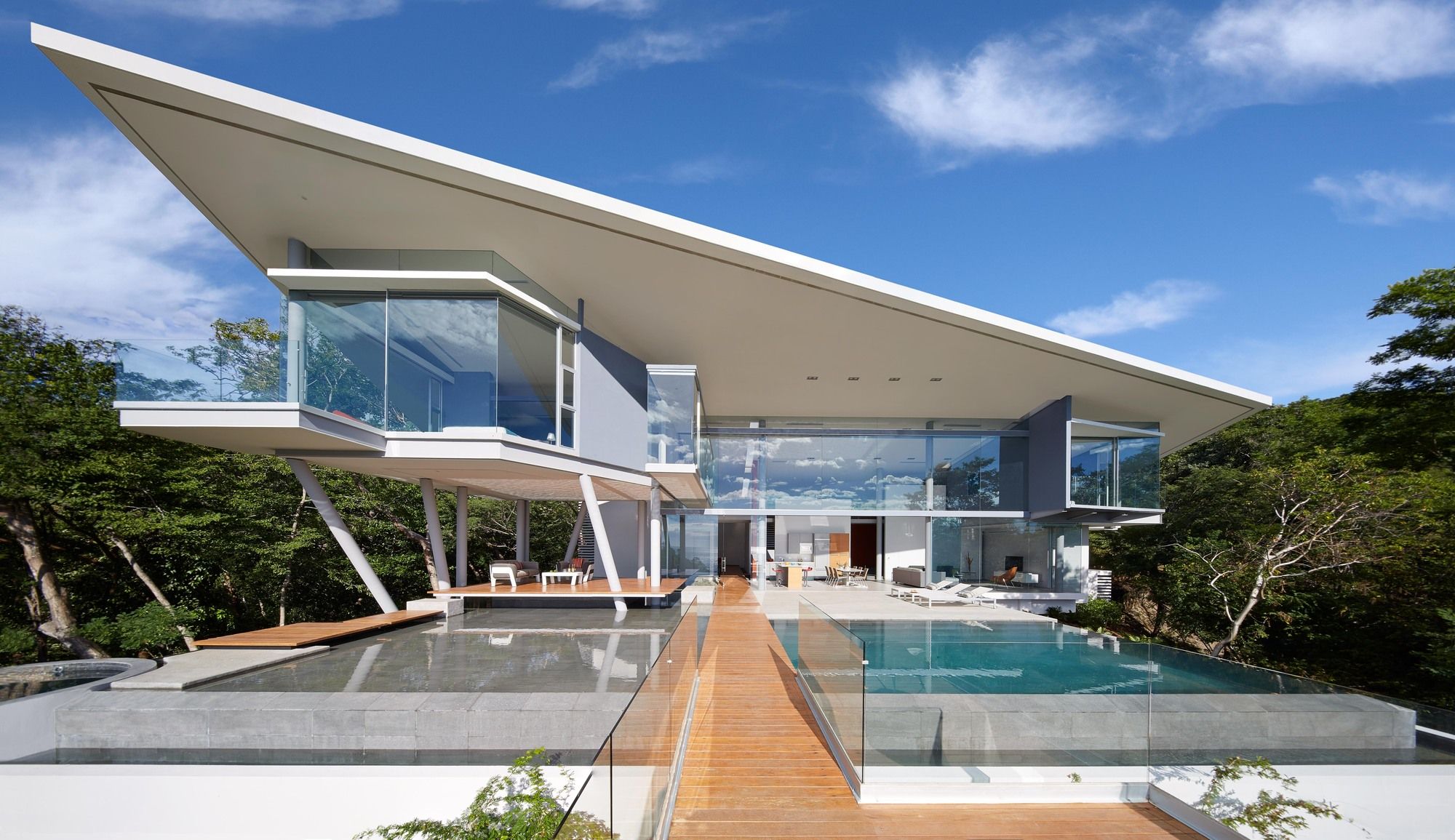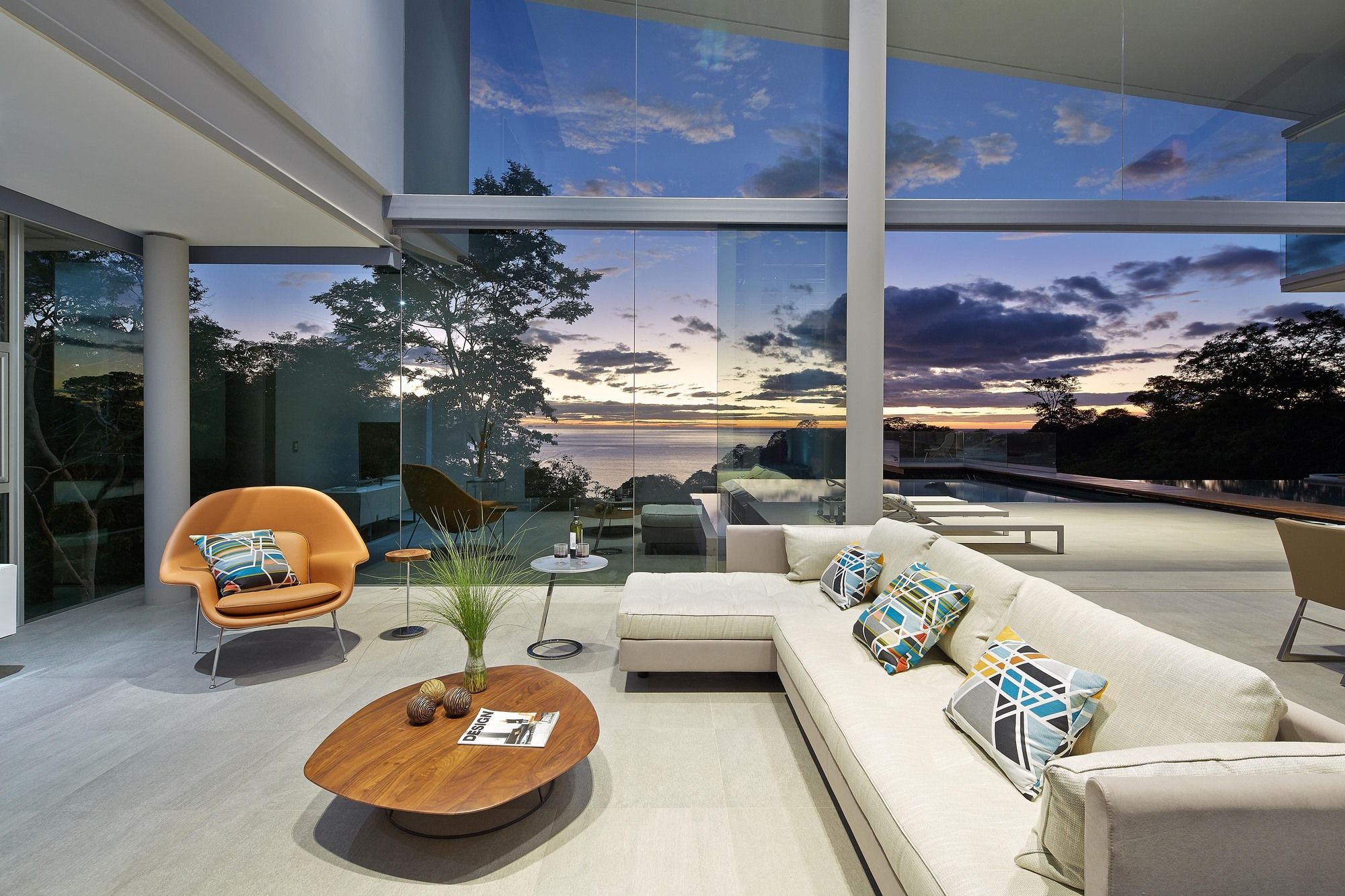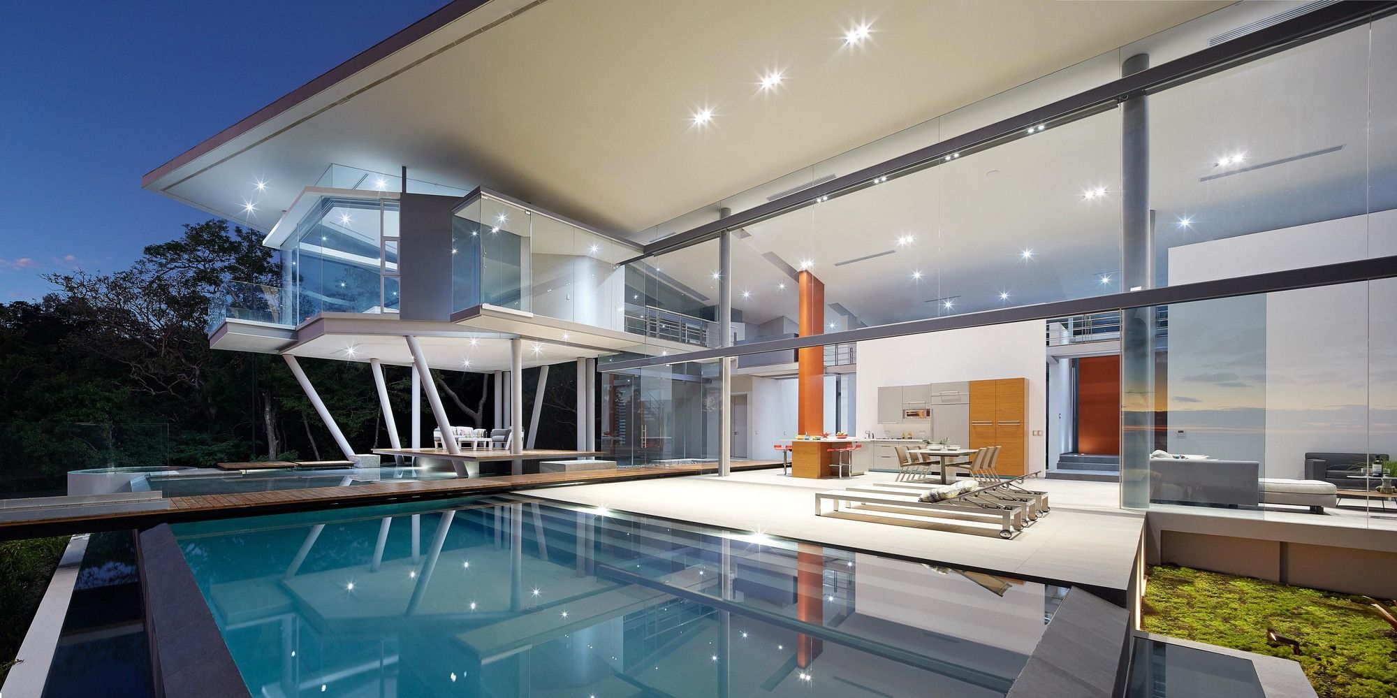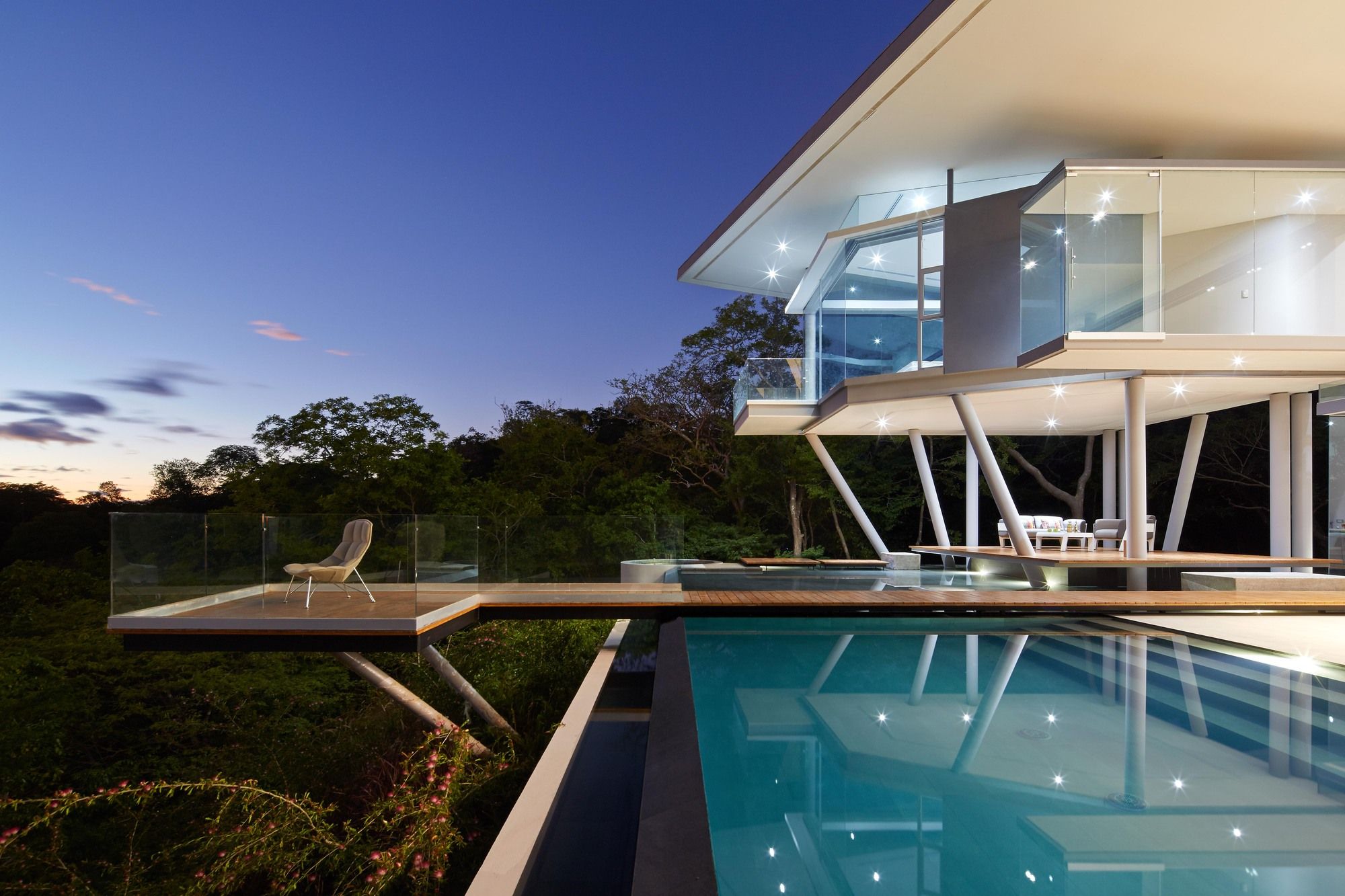 In the Papagayo peninsula, placed on the tip of an seaward pointing, and slightly downward sloping ridge of a peninsular shaped lot, with forest on both sides ( one a natural reserve), is the house named Indios Desnudos.