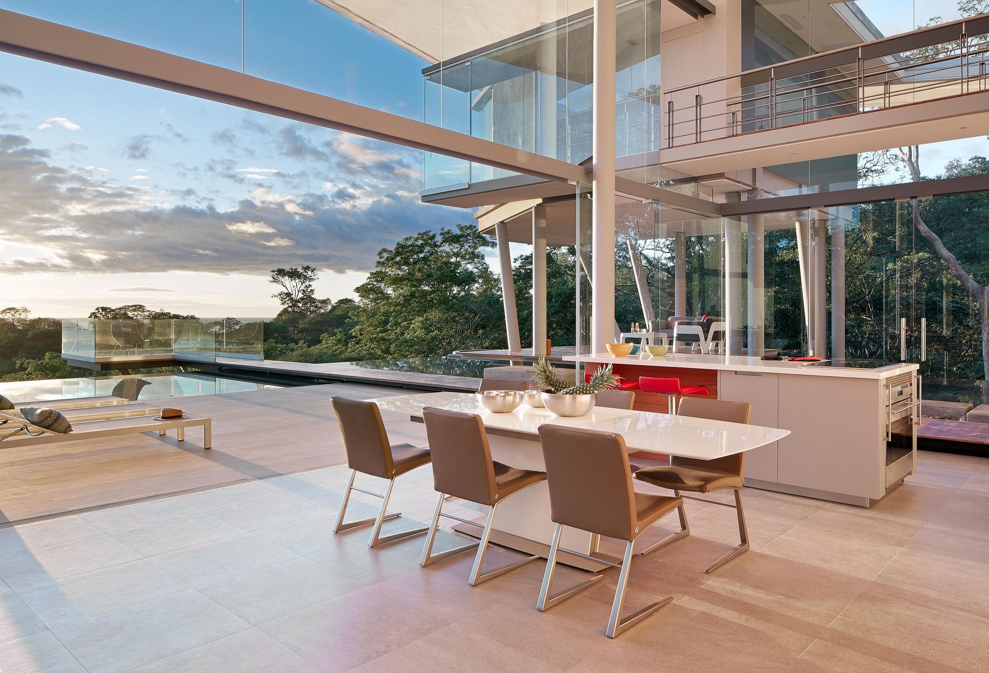 The main double-height space contains living room, dining room and kitchen and opens with large windows towards the pool terrace and towards the Forest Reserve where one of several Indios Desnudos is framed. The window opens with sliding doors erasing any barrier between the interior and the terrace.