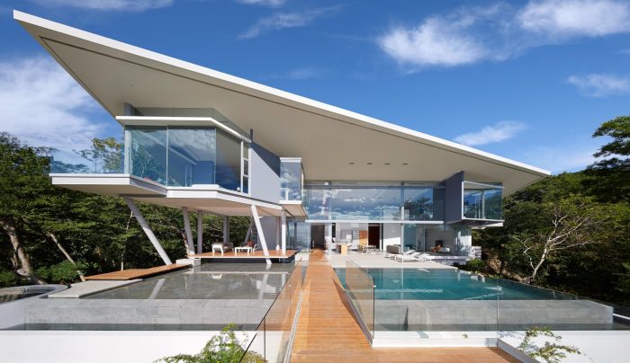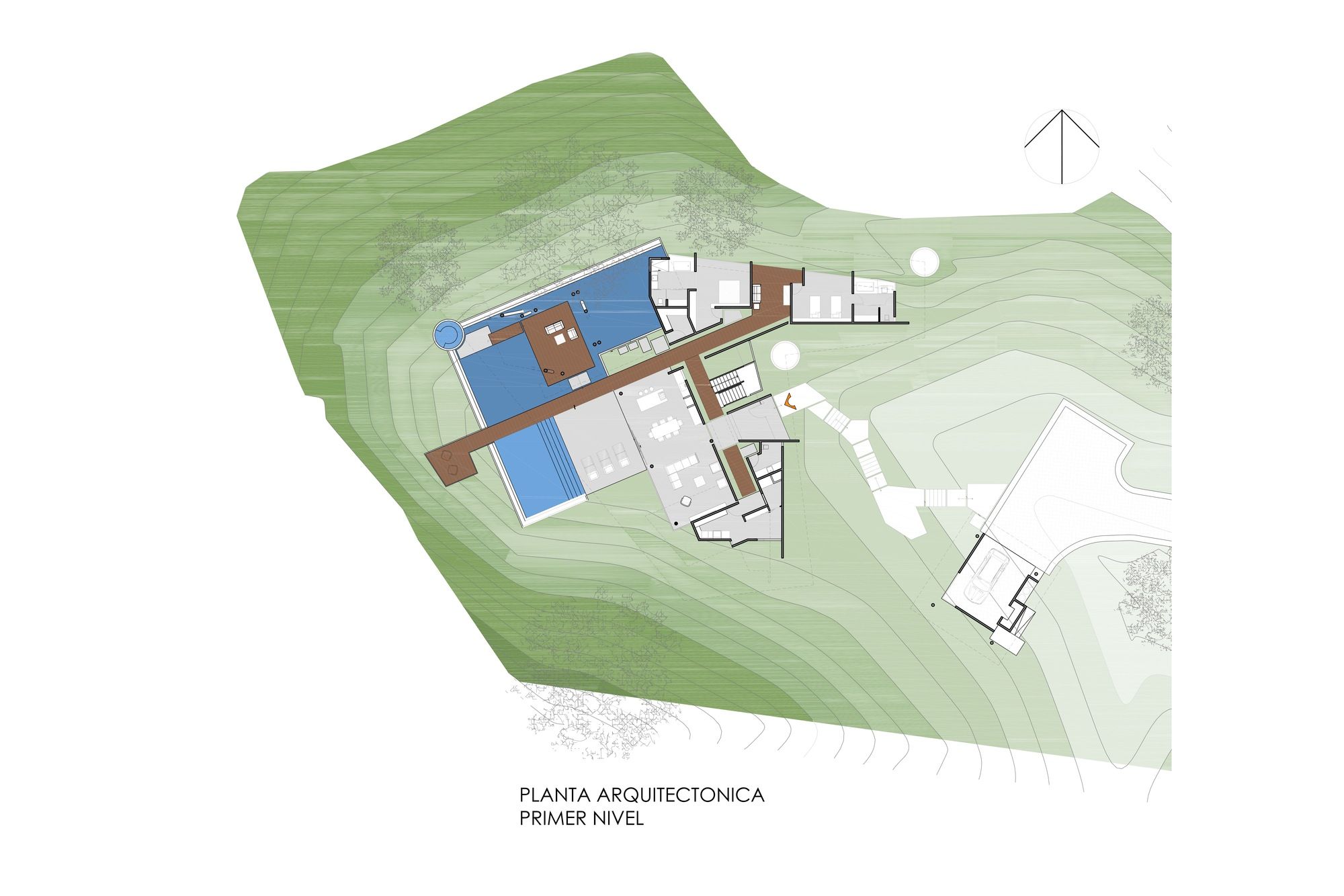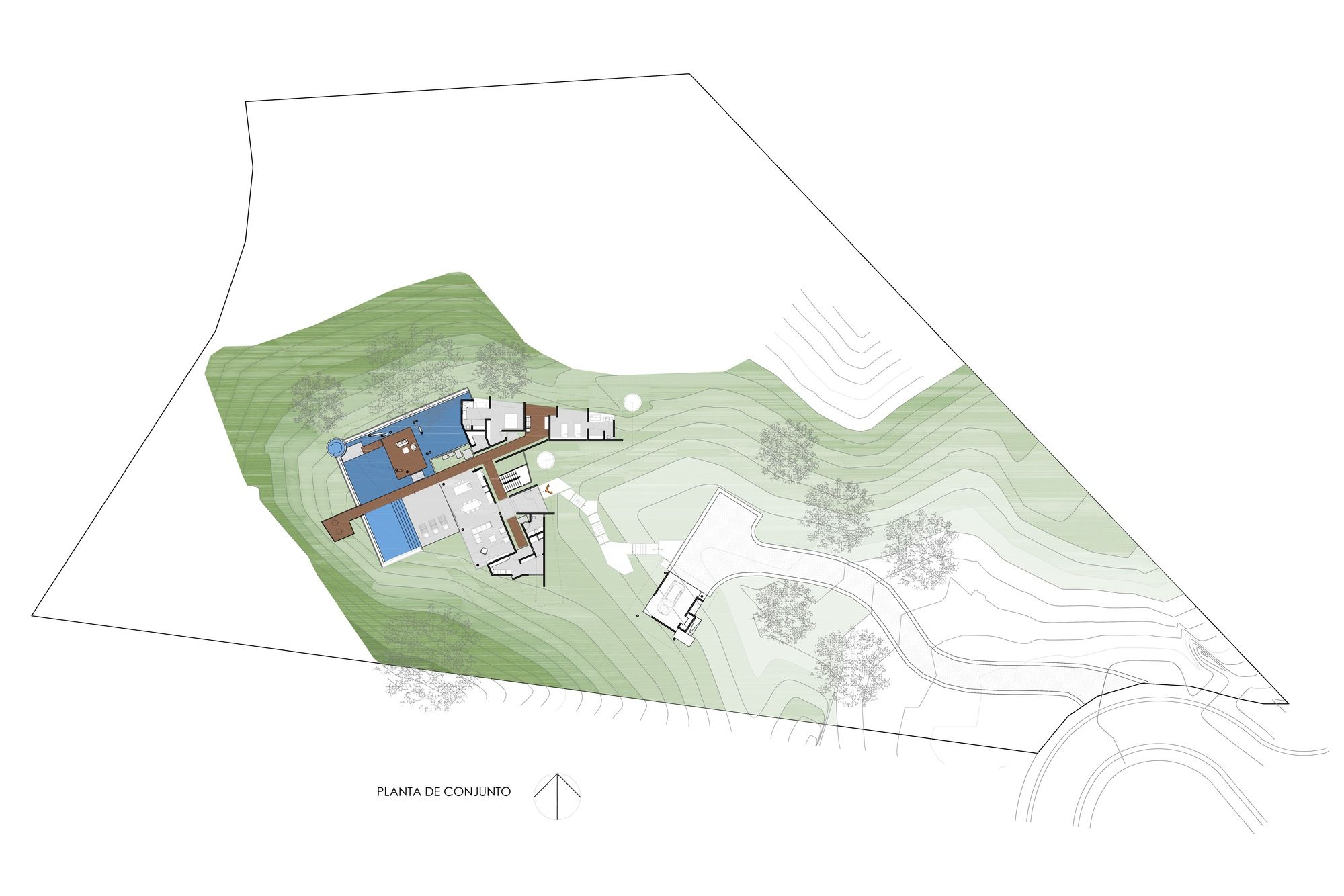 All living spaces have a view of the sea or the forest reserve. It has its main access via a lobby from which you can see the social area and the view to the sea. From here you can use the wooden boardwalk-like walkways that hover above scattered river stones that make up the two axes of circulation that structure the floor plan, or use the stairs to get to the two main bedrooms via bridges.