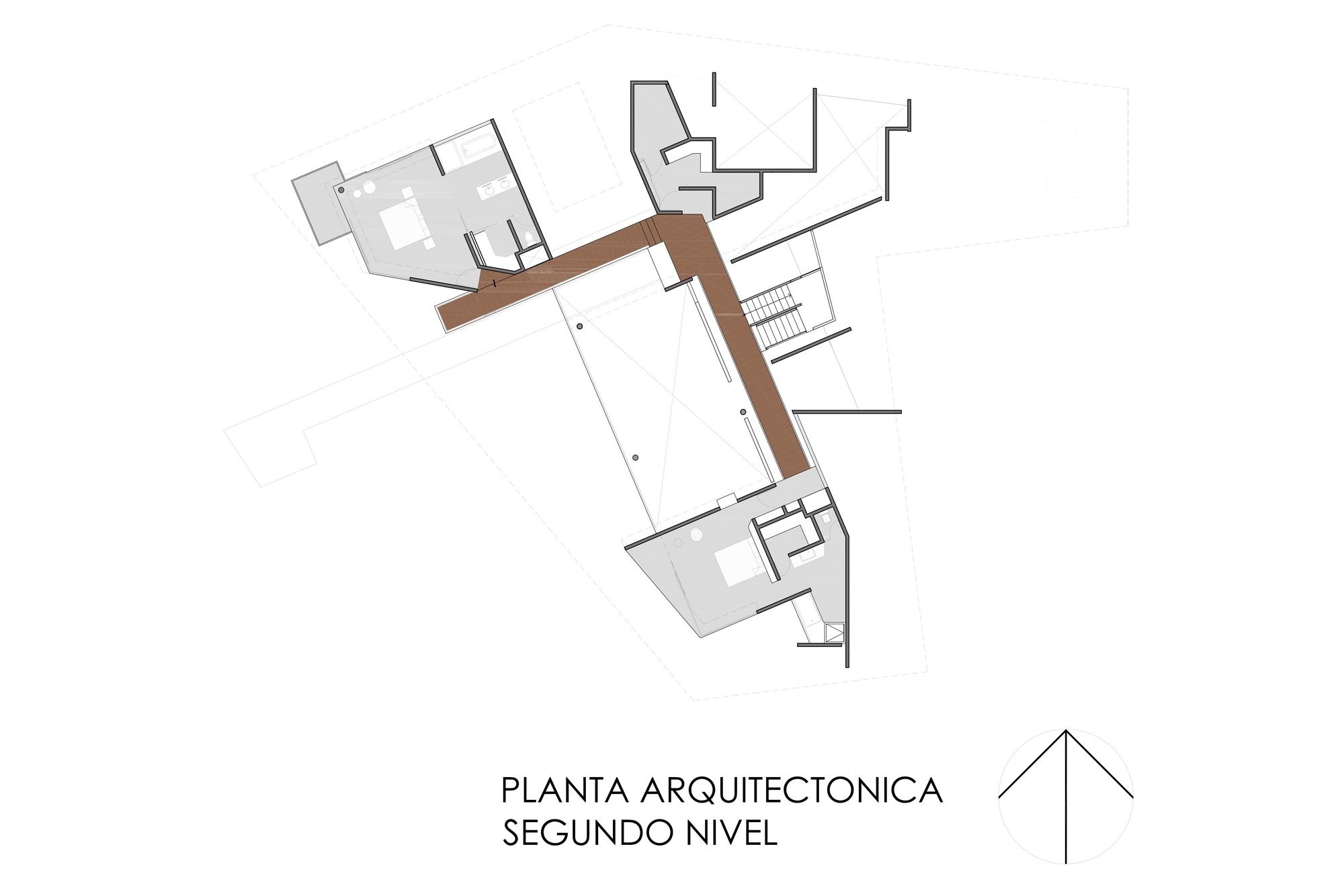 Through the main bridge on second floor which crosses the double height of the social space, you reach the master bedroom, which enjoys the same view and breezes as the island. The second bedroom upstairs is reached by a secondary bridge that runs parallel to the same space from which you can also enjoy views to the sea.