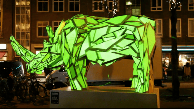 Sober Industries and Studio Rewind developed the Welcome to the Future installation in 2011 ” Interactive Light Projections ” . The installation of animal light displays included a wooden owl and rhinoceros. The wooden surfaces of these sculptures captured futuristic shapes and patterns projected onto them.