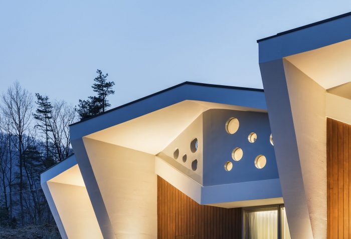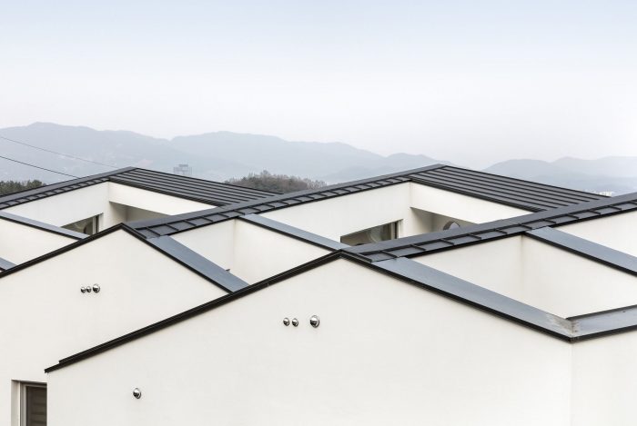 The roofscape, like a ridge around the site, is surrounding units with successive lines. The continuous roof surfaces maximize the effects of continuity through repetition, by interlacing the flow of roof enclosing the individual units. The individual units compose the whole together, which creates a unique appearance inspiring the rocky mountain behind the site. The building form can be seen easily at a distance from the entrance of Byeongsan-ri valley, which was intended to be a landmark of this area.