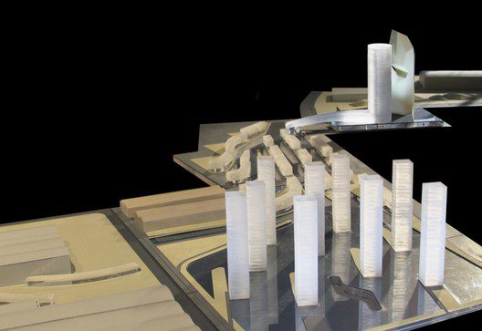 The lantern towers are made up of a photovoltaic curtain wall that will gather the sun’s energy during the day and at night one elevation of each tower will glow via special Fresnel glass. These towers contain loft apartments, where a health club, spa, retail shopping, and parking levels connect the lower floors. The green and glass arcs pierce the oxygen plant, and provide functional connections and service programs such as cafes, W.C., bicycle storage and information booths. The mountain tower is made of translucent ceramic skin and green roofs branches to a landscape of faceted green mounds at the boiler buildings. Programmatically, the mountain tower has a hotel with service apartments, an event space, a restaurant at the top, and retail space on the lower, as well as a bridge connecting it to the water tower. Finally the 3D park, a tilted landform of natural grasses, is punctured for light, where the structure is a dodecahedron truss which contains a hotel, restaurants, and cafes.