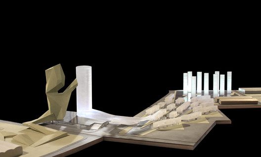 The International Touring Complex Hangzhou, China is a proposal by Steven Holl Architects to design a major urban quarter on a former industrial site. On a site for oxygen and boiler plants, this design was conceived based on Shan-Shui, meaning mountain and water, which is also a Chinese painting style. From above the shape of the site appears to resemble a “bow tie” where two towers are placed at the gathering. One tower branches towards the tributary forms approaching the oxygen sector while the other branches towards the landscape forms of the boiler sector, a respectful nod to the former use of the area.