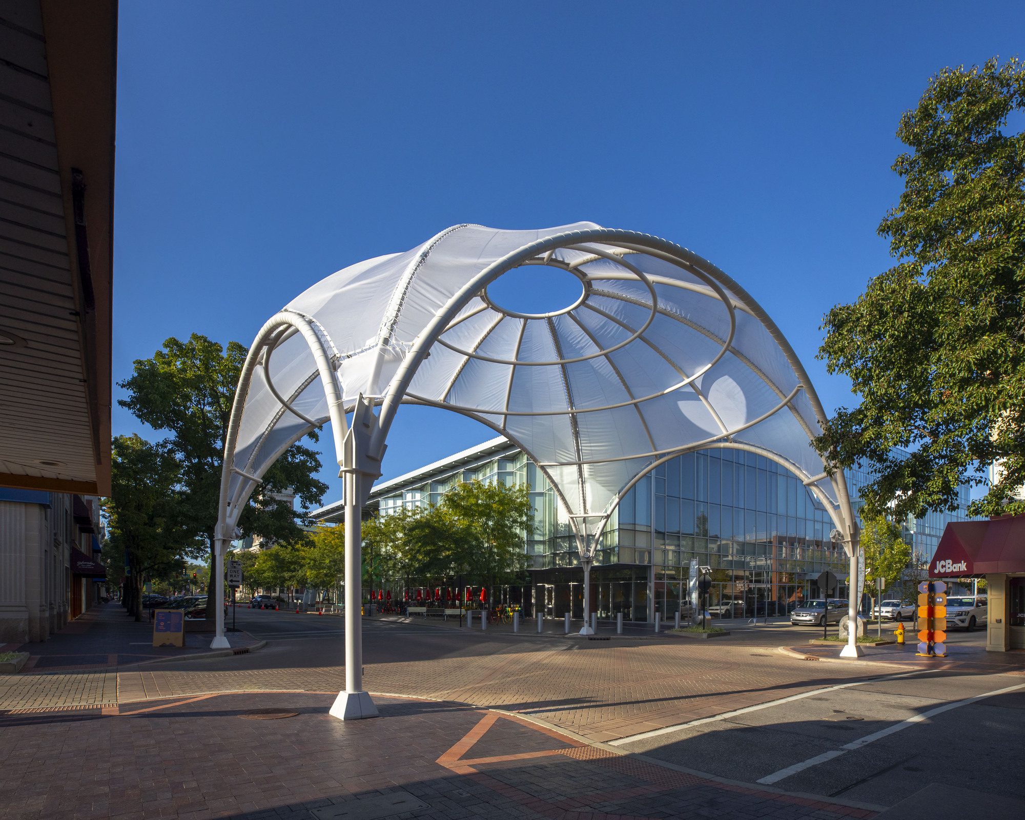 Its canopy form, celebratory purpose, and equitable invitation are derived from an extensive community engagement process, and inspired by influences as diverse as Rome’s Pantheon, the Hoosier pride embodied by the archway marking the entrance to the Indiana State Fair, ice cream sundaes from Zaharakos, and the wigwams of the Shawnee and Miami peoples.
