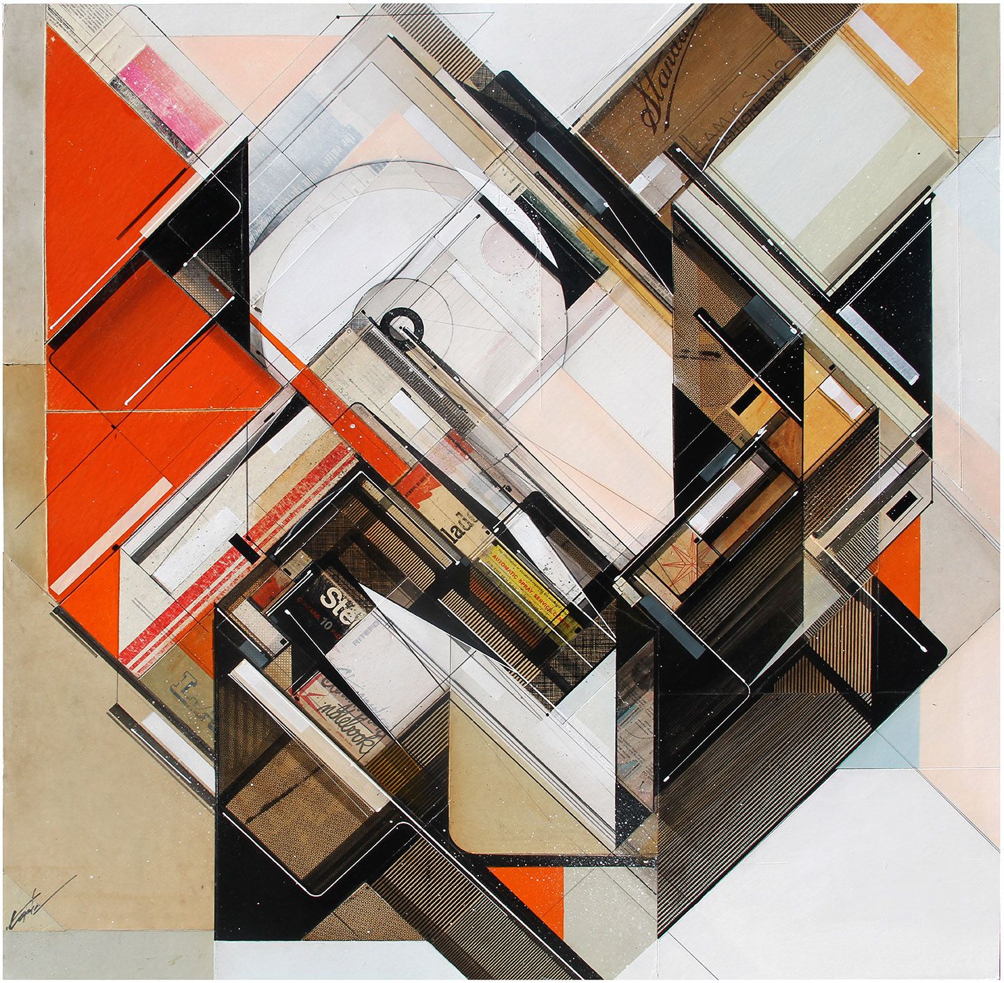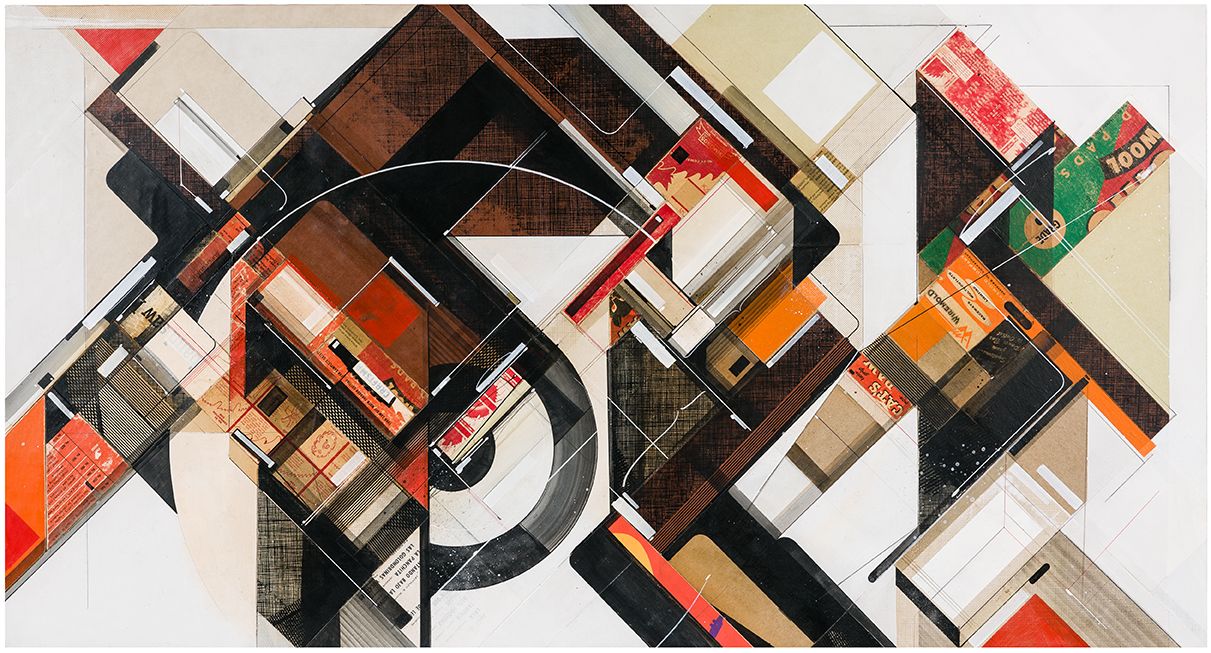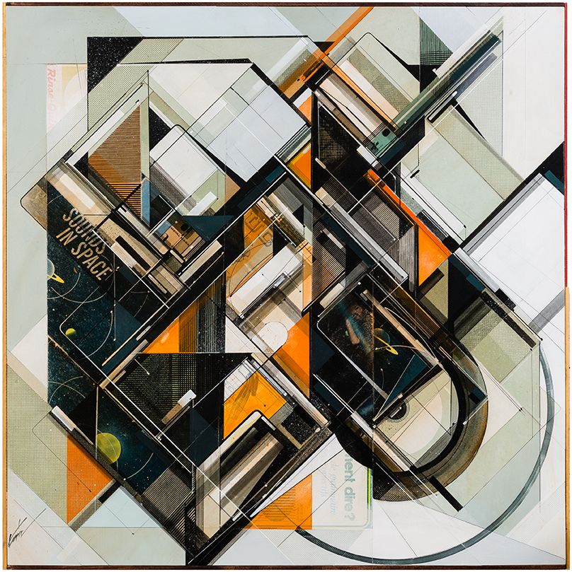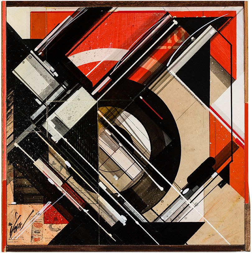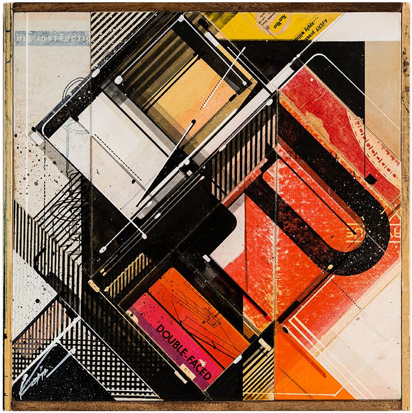 In this work he recycles items from the 1950’s-1980’s inventories, found while scouring the contents of Los Angeles estate sales. To come up with a geometric art work made up of lines and different geometric shapes; neatly put together making it close to a detailed architectural drawing.